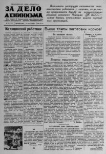П р о л е т а р и и всех с т р а н , со ед и н яй тесь! ЗА Д Е Л О ЛЕНИНИЗМА О р г а н С е в е р н о г о Р К К о м м у н и с т и ч е с к о й п а р т и и С о в е т с к о г о С о ю м и р а й о н н о г о С о в е т а д е п у т а т о в т р у д я щ и х с я Н о в о с и б и р с к о й о б л а с т и № 89 (2277) ВОСКРЕСЕНЬЕ, 26 июля 1959 г. Возглавить растущую активность масс, повседневно работать с людьми, по-деловом у организовать борьбу за осуществление решений июньского Пленума Ц К К П С С — самая боевая, неотложная задача партийных организацийш Цена 15 коп. Медицинский работник I Выш е темпы заготовим кормов! ------------------- ж * ------------------- Почетом и вниманием о к ружены в нашей стране медицинские работники. Они стоят на страже охраны здоровья трудящихся. В трудные минуты жизни к медицинским работникам идут люди и вручают им свою с удьб у . Потому и возлагается на них серьезная ответственность. Профессия врача, фельдшера, акушерки, хирурга требует самоотверженности, добросовестности и чистоты помыслов. Именно эти ч е р ты должны быть присущи нашим советским медикам. Своим трудом, личным примером они должны дисциплинировать окружающих, ширс^ко пропагандировать о б ц ф о и санитарную к у л ь т ур у , вести профилактическ у ю работу, разъяснять людям, что от них самих во многом зависит состояние здоровья. У нас в районе есть хорошие, добросовестные работники медицинских у ч реждений. К ним можно отнести Л . И. Иванова, Т. В. С у р о в у , Н. А. Савицкую, П. 3. Мануйлову, А. М.Ко- пылову, Г . Д. Яшину , Н . К . Стародубову, Н . Е. Гриднев у и других. Д ес ятки лет они честно трудятся на сво ем посту, спасли много жизней и заслуженно польз ую тся уважением людей. Трудящиеся присылают в их адрес через редакцию письма благодарности и свое •дейечное спасибо. Но есть и такие, о к о т о рых идут не особо лестные о тзывы и своим поведением они пока не заслужили чисто сердечного отношения к себе. Правда, таких мало и надо, чтобы их не было совсем. Особенно много забот у медицинских работников с наступлением сельскохозяй ственных кампаний в к о л хозной деревне. Надо добиться, чтобы в каждой бригаде были открыты детские ясли в горячую пору заготовки кормов и уборки урожая. И чтобы в этих детских учреждениях были созданы все условия для правильного воспитания малышей. К стыду нашему некоторые руководители колхозов и сельских Советов не придают этому значения. Медицинский работник долж ен строго требовать чистоты и порядка в полевых станах, выступать с ле к циями об охране здоровья, обеспечить каж д ую брига- гу аптечкой первой помощи и т. д. Много дел? Да. К сожалению, мало что делается в этом направлении. Редким явлением стала у нас беседа медработников в бригаде или на ферме. Заведующие медицинскими пунктами все свои обязанности ограничивают часами приема и редкими вызовами на дом к больному. У медицинского работника есть все возможности, чтобы полнее применить свои силы и знания. Надо больше общаться с людьми, давать им советы и о казы вать практическую помощь, входить с вопросами и мероприятиями на сессии и за седания исполкомов сельских Советов, добиваться от руководителей колхозов, Советов оперативного реш е н и я того или иного вопроса по созданию к у л ь т у р но-бытовых и санитарных у с ловий в поле, на фермах, в детских яслях, вместе с депутатами добиваться чистоты в каждом доме, на к а ж дой улице и т. д. Не за горами страдная по ра. У