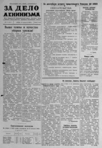 П р о л е т а р и и в с е х с т р а н , с о е д и н я й т е с ь ! З А Д Е Л А ЛЕНИНИЗМА О р г а н С е в е р н о г о Р К К о м м у н и с т и ч е с к о й п а р т и и С о в е т с к о г о С о ю з а и р а й о н н о г о С о в е т а д е п у т а т о в т р у д я щ и х с я Н о в о с и б и р с к о й о б л а с т и За д о с то й н у ю встречу п р е д с т о я щ е г о П л е н у м а Ц К КПСС # * ------------------------------ № 103 ( 2 2 9 1 ) | С Р Е Д А , 2 6 а в г ус т а 1959 г . | Ц е н а 15 коп. Выш е т е м п ыи качество уборки урожая! На к о л х о з н ы х п о л я х в р а з г а р е у б о р к а у р о ж а я . У м е л о и с п о л ь з у я б о г а т у ю т е х н и к у , х л е б о р о б ы п е р е д о в ы х к о л х о з о в п р о я в л я ю т в ы с о к о е н а п р я ж е н и е в р а б о т е , с т р е м я с ь в с ж а т ы е с р о к и п р о в е с т и у б о р к у з е р н о в ы х , н е д о п у с т и т ь п о т е р ь , с д а т ь и п р о д а т ь г о с у д а р с т в у к а к м о ж н о б о л ь ш е х л е б а . К о л х о з ы и м . К р у п с к о й , „ З а в е т ы И л ь и ч а 1*, „ П а м я т ь Кирова** п е р в ы м и н а ч а ли у б и р а т ь у р о ж а й и п р о д а в а т ь х л е б г о с у д а р с т в у . Н а р а щ и в а я т е м п ы ж а т в ы , з д е с ь м е х а н и з а т о р ы п р и н и м а ю т м е р ы к т о м у , ч т о б ы н е д о п у с к а т ь п о т е р ь з е р н а . Щ И н ц н а т и в а и с м е к а л к а к о м б а й н е р о в А. С мы к ( „ П а м я т ь К и р о в а “) , Н . П р у д н и к о в а ( „ З а в е т ы Ильича**) и м н о г и х д р у г и х п о м о г л и им у б и р а т ь п о л е г л ы й х л е б и в л ю б у ю п о г о д у б е з п о т е р ь . В ы р а с т и т ь б о г а т ы й у р о ж а й д е л о не л ё г к о е . Е щ е б о л е е т р у д н а я , о т в е т с т в е н н а я з а д а ч а —в о в р е м я , о р г а н и з о в а н н о у б р а т ь е г о , не д о п у с т и т ь п о т е р ь . В а ж н о с о х р а н и т ь к а ж д ы й к и л о г р а м м х л е б а , в ы р а щ е н н ы й с а м о о т в е р ж е н н ы м т р у д о м х л е б о р о б о в . В а ж н о с е й ч а с ч т о б ы на п о л я х р а б о т а л и в с е д о е д и н о й у б о р о ч н о й м а ш и н ы , ни о д н о г о ч а с а п р о с т о я п о л ю б ым п р и ч и н а м . Д о б и т ь с я т о г о , ч т о бы РЧзсе к о м б а й н е р ы в ы п о л н я л и и п е р е в ы п о л н я л и з а д а н и я . Н а р а щ и в а я т е м п ы у б о р к и , т е м с а м ы м с о к р а щ а ю т с я с р о к и ж а т в ы , а с л е д о в а т е л ь н о , и п о т е р и з е р н а . П р и у с к о р е н и и т е м п о в ж а т в ы с л е д у е т о б р а т и т ь в н и м а н и е на к а ч е с т в о у б о р к и . О р г а н и з о в а т ь в з в е ш и в а н и е в с е г о н а м о л о ч е н н о г о з е р н а на т о к у , не д о п у с к а т ь п о т е р ь п р и т р а н с п о р т и р о в к е . П р е с т у п н о то , к о г д а х л е б и з б у н к е р а к о м б а й н а в ы г р у ж а е т с я п р я м о на з е м л ю и л и в с т е р н ю . В к о л х о з а х „ З а р я к о м м у - низма**, „ 7 - й с ъ е з д С о в е - т о в “ , „ П а м я т ь Ленина** при у б о р к е п о л о с ы не о б к а ш и в а ю т с я , з е р н о , п о с т у п а ю щ е е о т к о м б а й н о в на т о к а , п о д ч а с н е в з в е ш и в а е т с я . В н е к о т о р ы х к о л х о з а х н е р е д к о х л е б б е з в е с а о т п р а в л я ю т и на з а г о т о в и т е л ь н ы е п у н к т ы . К о л х о з ы „ Б о р ь б а з а мир**, им. М. Г о р ь к о г о , „ Н о в а я ж и з н ь " с о п о з д а н и е м н а ч а л и у б о р к у , с с ы л а я с ь на п л о х у ю п о г о д у . С е й ч а с д о ж д е й н е т и в с ё ж е у б и р а ю т у р о ж а й о ч е н ь м е д л е н н о . Ко г д а ж е д у м а ю т у б и р а т ь х л е б т е к о л х о з ы , к о т о р ы е м е д л я т и не н а б и р а ю т т е м п о в к о с о в и ц ы . У м е с т н о н а п о м н и т ь этим р у к о в о д и т е л я м , ч т о по м е т е о р о л о г и ч е с к и м д а нн ым в п е р в ы х ч и с л а х с е н т я б р я о ж и д а ю т с я о с а д к и в в и д е с н е г а . То т , к т о ж д ё т х о р о ш е й п о г о д 