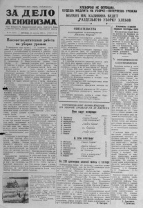 П р о л е т а р и и в с е х с т р а н , с о е д и н я й т е с ь ! ЗА Д Е Л О ЛЕНИНИЗМА Орган Северного Р К К о м м у н и с т и ч е с к о й партии С оветского Союза и райончого С о в е т а д е п у т а т о в тр у д я щ и х с я Новосибирской о б л а с ти №104(2292) I ПЯТНИЦА, 28 а в г у с т а 1959 г. Цена 15 коп. М ассово-политическая р а б о т а на у б о р к е у р о ж а я Т> нынешнем году тр у ж е ники района ведут уборку урожая и хлебозаготовки в трудных климатических у с ловиях. Однако, несмотря на это, передовые комбайнеры района В. Сидоров, М. Литвиненко, Н. Виноградов, Н. Савицкий, Ф . Васечко и другие у би рают в день от 10 до 20 гектаров хлебов. Претворяя в жизнь исторические решения X X I съезда К П С С и июньского Пленума Ц К КПСС , район борется за продажу государству 130 тысяч центнеров хлеба. Особенно ответственна в т г о т период работа на- пропагандистов и агитаторов. Они обязаны организовать социалистическое соревнование, обобщать и распространять передовой опыт, ярко и доходчиво рассказывать трудящимся о лучших производственниках, о их методах работы. Все это будет способствовать выполнению и перевыполнению плана хлебозаготовок, уборки урожая в сжатые сроки. В настоящее время ни на минуту нельзя забывать о том, что каждый лишний пуд хлеба, засыпанный в государственный амбар,— это еще один шаг вперед на пути роста общественного богатства и материаль- ^ г ю г о благосостояния кол- И Р лЗ зников . Агитаторы и пропагандисты сейчас должны нахо-j диться там, где решается! судьба урожая. Боевые плакаты и лозунги, стенная печать, средства к у л ь турно-просветительной работы—всё должно быть использовано в политической работе. Большинство партийных организаций колхозов— „Память Кирова” , „Борьба за мир” , им. Калинина, им. Крупской—правильно расставили коммунистов и комсомольцев на важнейшие участки уборочных работ. В условиях, когда п о давляющая масса к о л хозников и рабочих города находится в поле, политическая работа на полевых станах, в бригадах имеет особое значение. Полевой агитпункт должен быть центром всей массово-политической работы. Там должны всегда быть свежие газеты и журналы, книги, шашки, шахматы и домино, наглядная агитация, ежедневно заполняться доски показателей. Нельзя, конечно, мириться с таким положением, когда в сельхозартели имеется достаточное количество разнообразных продуктов , но общественное питание не организовано. Комбайнеры, работающие в колхозе „Заря коммунизма” , обижаются на председателя т. Блохина и секретаря парторганизации т. Устьянчик, что они до сего времени не организовали в поле общественное питание. Такое же положение в колхозе „П у т ь Сталина” . Партия требует, чтобы массово-политическая работа носила острый, боевой и наступательный характер. Усилия пропагандиста и агитатора должны быть направлены не только на то, чтобы разъяснять, у бе ждать хлеборобов, популяризировать передовой опыт новаторов колхозного производства, но и решительно поднимать общественное мнение против тех, кто своими действиями мешает на уборке урожая и в выполнении обязательств по продаже хлеба государству. Массово-политическая работа-необходимое условие в успешной битве за хлеб, все ее многообразные формы должны быть направлены па то, чтобы быстро и без потерь убрать урожай, выполнить и перевыполнить план продажи хлеба государству. ХЛЕБОРОБ! НЕ ОПЛОШАЙ.