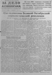 П р о л е т а р и и в с е х с т р а н , с о е д и н я й т е с ь ! ал ^ ' - ■ ч Вй г з ч С е ч е р ю г о Р К К о м и у м н б т к ч е с о А п а рти и С о в е тс к о го Союза и р а й т я ч л г о Си я е т е с в п у т а т о з т р г а я м ^ г с я Новосибирской о б л а с т и № 135 (2321) | СРЕДА. 11 ноября 1959 Г . . Ц е н а 15 коп. X X I съезд КПСС ознаменовал вступление нашей Родины в период развёрнутого строительства коммунизма. Народы Советского Союза! Все силы, всю энергию— на выполнение великих задач коммунистического строительства! 42-я годовщина Великой Октябрьской социалистической революции Д о к л а д т о в а р и щ а А. Б. А р и с т о в а н а т о р ж е с т в е н н о м з а с е д а н и и М о с к о в с к о г о С о в е т а 6 н о я б р я 1959 г о д а Товарищи! Сорок два года тому назад мир потрясло величайшее событие. В России победила В е л и кая О кт я б р ь ск а я социалистическая революция. Фронт мирового империализма был прорван. Р а б о ч и е и крестьяне, руководимые К о м м у н и с тической партией во главе с В ia- дим ром Ильичом Лениным, свергли господство капиталистов и по- мещилоа и установили С о в е тск ою власть. Впервые в мировой истории трудящийся и эк сп л у а ти р уе мый народ обрел подлинные права человека и свободу, стал хозяином своей судьбы L О к т я б р ь с к а я революция севобо дила все народи нашей Родины от социального и национального гне та. Она сняла оковы с пр: изводи- тельных сил, открыла н еис сяка е мые жизненные источники, из которых советский народ черпает новые и новые силы, становится все более богатым и могучим. Социалистическая революция открыла неограниченные возможности людям труда свободно развивать свои спо собности дарования и таланты. Она передала в руки трудящихся управление государством и вывела их па ш и ро кую дорогу величай ших социалистических преобразований. Сегодня мы отмечаем 42 ю го довщину В ели кого О к т я б р я . О к и дывая взглядом пройденный за эти годы путь, мы можем с гордостью сказать, что наш героический н а род превратил свое государство в I м о г у ч ую социалистическую д е р ж а ву и достиг таких успехов, к о т о рые вызываю т восхищение всего прогрессивного человечества. В е л и к а я созидательная сила социалистической революции Товарищи! За сорок два года с о ветский народ прошел болыиой и трудный путь. У ж е в первые м е с я цы революции на молодую С о в е т с к у ю республику обруш илис ь многочисленные армии внутренней контрреволюции и иностранных интервентов. Враги навязали нам гражданскую войну и в течение ряда лет не давали возможности заняться мирным созидательным трудом. С о в е тс к а я страна понесла большие потери. В борьбе за свободу Родины, за с частье трудящ их с я погибли многие видные революционе щие союзные и автономные республики. К началу второй мировой войны С С С Р у ж е догнал по в ы п у с к у в а ж нейших видов промышленной продукции высокоразвитые капиталистические страны Е вропы и, когда фашистская Германия вероломно напала на Советский Союз, наша экономика оказалась в состоянии в ходе войны обеспечить С о в е т с к ую Армию всем необходимым для разгрома врага. Э т а война принесла нам с т р аш ные потери и резрушения. Она унесла миллионы людей— наших ры, ты с я чи л у ч ш и х сынов и доче- отцов, братьей и сыновей, славных рей нашего народа. Интервенты и патриотов социалистической Роди- белогвардейцы захватили жизненно ны. Многих жизней и страданий в аж н ы е рай