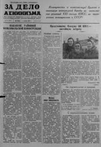 П р о л е т а р и и в с е х с т р а н , соеди н я й т е с ь I ЗА Д Е Л О ЛЕНИНИЗМА Орган Севе рного Р К К о я м у н и с т м ч е с о* п а рти и С о в е т с к о г о Союза н р а й ы н о г » С о в е т а д е п у т а т о в т д у а в ш и х е я Ново сибирской о б л а с т и К ом м у н и ст ы и комсомольцы! Б у д ь т е в ава н га р д е всенародной борьбы з а выполнение решений X X I с ъ е з д а К П С С, з а пост роение к о м м у н и з м а в С С С Р ! * В 7 (2325) ПЯТНИЦА, 13 ноября 1959 Г. Цена 1 5 иоп. Н А КА Н У Н Е РАЙОННОЙ КОМСОМОЛЬСКОЙ К О Н Ф Е Р Е Н Ц И И 15 ноября Н 5 9 года начинает свою работу X V I I районная комсомольская конференция. Она о т к р ы вается в обстановке огромного политического и трудо вого подъема трудящихся, вызнанного историческими событиями в жизни народов мира: визитом Н. С . Х р у щева в С Ш А , итогами работы сессии Верховного Сов*:-та С С С Р и подготовкой к предстоящему П л е ну.к . Ц К К П С С . К /нфоренцня— важное с о бытие в жизни молодежи рай на. Она подведет иго ги раб. ты комсомольских организаций, даст оценку достигнутым результатам, вскроет недостатки н наметит пути дальнейшего у л у ч в Ь н и я внутрисоюзной, МПС сово политической, к у л ь т у р но-просветительной и спор тивной работу среди молодежи. Претворяя в ж изн ь исто рические решения X X I с ъ е з да К П С С , комсомольские организации района стали г л у б ж е вникать в экономик у колхозов и предприятий. Повысилась ответственность комсомольцев за порученное дело. Р я д комсомольских организаций организационно окреп, пополнил свои ряды за счет передовиков колхозного производства, рабочих и с л уж ащ и х предприятий. В те к ущ е м году колхозы района наиболее организо- ^но провели весенний I. В этом немалая з а с л у га молодежи. Т олько на севе у спешно трудились 16 комсомольско-молодежных бригад. Победителями в соревновании вышли комсомольцы механизаторы колхоза „ З а р я к о м м ун и з м а 1. Хор ош о трудились на заготовке кормов комсомольцы колхозов им. М. Горького , „ П у т ь С та ли н а ” , нм. Калинина и другие. В дни уборки у р о ж а я м о л о д ы е механизаторы И . И в а ш к е в и ч , Н. Хаванев, A . Седаков, Е . Малы хин , Г . Д уд ин ск и й ,В . Бузюргин, Н . Савицкий, Ф . В а с е ч к о и многие другие показывали образцы добросовестного отношения к труду. Добрая слава идет о комсомольцах предприятий и учреждений, таких. как Л . Павлов . Э . Ярмаи, О. Кириллина, В. Багров, B . Сотников, Г . Сазонова, Г , Сысоева, А . П е т рова. ^ Но было бы большой ошибкой, отмечая, что сделано. н* остановиться на недостатках в работе районной комсомольской орга ннзацни. £ е к р е ; я р н райкома комсомола тг. Н. Б j j i I е *ал и В. З в е р е в в комо. ыоль- ских организациях бывают мало, не знают н ужд и н а сущных запросов .молодежи, предпочитаю*, вместо живой организа.орсксп работы в колхозах, предприятиях и ) ч р е ж д е н и я <, р у к о водить во телефону. Т олько s i ими причинами М О Ж Н J о б Ъ Я ( . Н И 1 Ь l u l ф < 1 К | , что в колхозах „7 й съезд С о В Ц 1 0 В ‘ , „ Н о в а я Ж И а Ш > “ , „ П у т ь к коммунизму* дли- т е л1 Hue время не было сек ретарей комсомольских организаций. Э т о привело к запущенности внутрисоюзной и массово политиче ской работы в этих организациях и ослаблению к о м сомольской дисциплины. Райком комсомола, многие первичные комсомольские организации слабо ве д у т работу по росту рядов Делегаты конференции д олжны всесторонне о б с у дить эти недостатки, вс кры ть причины, критически расценить деятельность ра