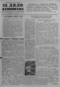 П р о л е т а р и и всех с т р а н , соединяйтесь! ЗА Д Е Л О ЛЕНИНИЗМА О р г а н С е в е р н о г о Р К К о и к у н и с т и1е с < с й п а р т и и С о в е т с к о г о С о ю з а м ^ р а й т м ч п г й С о в е т а е е п у т а т п е т о у я я ш и т с* Н о в о с и б и р с к о й о б л а с т и « 1 3 8 |2326) ВОСКРЕСЕНЬЕ, l f i ноября 1939 г. Ц еп а 15 коп. В ЦЕНТРАЛЬНОМ КОМИТЕТЕ КПСС Ц К К П С С принял решение созвать очередной Пленум Центрального Комитета К П С С 22 декабря 1959 года. На обсуждение Пленума Ц К вносится попргс о мероприятиях по выполнению решений X X I с ъе з да К П С С и декабрьского (1958 г.) Пленума Ц К о подъеме земледелия и увеличении производства зерна, сахарной свеклы, хлопка и других технических культур, картофеля, овощей, фруктов, винограда и других продуктов растениеводства, о развитии общественного животноводства и увеличении производства мяса, молока, шерсти, яиц и других продуктов животноводства, об укреплении колхозов и совхозов кадрами, о дальнейшей механизации сельского хозяйства, повышении производительности труда и снижении себестоимости продукции, об укреплении общественного хозяйства колхозов и повышении материального благосостояния колхозников.. : * • • • , Заслушать поэтому вопросу на * Пленуме ЦК* доклады Совета Министров Р С Ф С Р , Ц К компартий Украины, Казахстана, Белоруссии, Узбекистана,Таджикистана и Азербайджана, 1Е МЕДЛИТЬ С РЕМОНТОМ ТЕХНИКИ Механизаторы Купинско- го района, готовясь к предстоящему Пленуму ЦК КПСС , взяли повышенные обязательства — закончить ремонт тракторов и прицепного инвентаря к 1 февра ля, одновременно вести ре монт комбайнов, жаток и другой уборочной техники. Купинцы обязались добиться снижения себестоимоити ремонтных работ на 5 процентов? Обязательство купинских механизаторов является достойным вкладом в дело выполнения семилетнего плана по развитию сельскохозяйственного производства. Отвечая на письмо механизаторов Купинского района, механизаторы сельхозартели „ П у т ь Сталина* решили отремонтировать весь сельскохозяйственный инвентарь к1 января.Их слова не расходятся с делами На линейку готовности поставлено 2 сеялки и 3 плу га. Ремонт ведется одновременно в двух, бригадах. На ремонте участвуют 10 механизаторов. Приступили к ремонту тракторов, прицепного инвентаря и комбайнов в ксл- хозе „П ам ять Кирова*. Имея хорошую оборудованную мастерскую, колхозники этой артели обязались отремонтировать всю технику к 1 февраля. Производится р е м о н т сельхсзинвептаря в колхозе „Заветы Ильича*. Наряд с передовыми хозяйствам.. в деле подготовки техники к пелевыМ работами еегь и такие, как им. Калинина, им. Кр у п ской, „Память Ленина*, которые до енх пор не начали ремонт. Неизвестно, чего выжидают руководители этих хозяйств, члены правления и партийные организации. Необходимо отрешиться от порочной практики прошлых лет, когда к ремонту машин в отдельных колхо-' зах в основном приступали после того, как по-весеннему начнет греть солнце. Кто вовремя не подгою- вит технику, тот не сможет в срок провести весенний сев, а это значит— потеряет по несколько центнеров зерна на гектаре. В этом году хорошо подготовился к ремонту машин коллектив Тартасской ремонтно-технической стан ции. В мастерской находится 8 тракторов, доставлен ных из колхозов „Заря коммунизма* и „ П у т ь к коммунизму*. Для своевременного и качественного проведения ремонта Р 