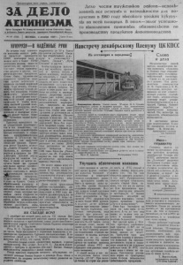 П р олетар ии всех с тр а н , соединяйтесь/ ЗА Д Е Л О ЛЕНИНИЗМА.. Орган Северного р К К в м м у ч и с т н ч в с к о й партии Советского Союза й районного С о в е т а д е п у т а т о в тр удящихся Новосибирской области Дело ч е с т и т р у Ж е н и к о в района—исполЬ^ з о в а т Ь вс е р е зе р вы и в о з м о ж н о с т и для полу че н и я в 1960 году в Ы с о к о ю у р о Ж а я кукуру- зЫ на в се й площади. В э т о м — залог у спеш н о го выполнения п р и н я т Ы х о б я з я г п е л Ь с т в по п р о и з в о д с т в у п р о д у к т о в Ж и в о т н о в о д с т в а . № 140 ,2334) | ПЯТНИЦА, 4 декабря 1959 г. i Ц е н а 15 ко п КУНУРУЗУ— В НАДЁЖНЫЕ РУКИ /Навстречу декабрьском у Пленуму Ц К КПСС Во в гором году семилет- подрезалось до 20 н более! ц ки колхозам нашего райо-1 пр« центов растений. Имен на предел ит произьести | но так обрабатывали кук> 12000 центнеров мяса в живом весе и более 67С00 центнеров молока, намж го увеличить по сравнению с текмцим годом производство шерсти и других жи- вотнеиодч»I кнч продукюв. Стало быть, . т р у ж е н т а м сельского хозяйства надо еще лучше заботиться о Создании прочной кормовой базы. Пора понять, что кормовую проблему нельзя решить без кукурузы. Нужно развернуть решительный лоход за расширение посевов этой ценной кормовой культуры. А чтобы получить высокий урожай зеленой массы кукурузы, необходимо передать ее -выра щивание в надежные руки. решат только хоро- ч э т Т б у ч е н н ы е кадры к у к у рузоводов. Практика нынешнего года убедительно показывает, что в тех хозяйствах, где руководители со всей серьёзностью отнеслись к созданию кукурузоводческих звеньев и с ( у ч г ь ь ю к у ру зоводов, там получены неплохие урожаи. Примером могут Служить колхозы .Заветы Ильича" и нм, Калинина, в которых вырастили в среднем по 200 цейтнеров зеленой м а а ы кукурузы на каждом гек таре. А разве не могли по лучить такой же урожай или выше другие хозяйства? Могли. Но здесь фор мально отнеслись к вопро- (^Лфганизацни звеньев по в^защиванию кукурузы. Существовали эти звенья только на бумаге. Сеяли и обрабатывали кук ур у зу в основном наспех подобранные,недостаточно подготов ленные люди, которые при любом своем старании не могли получить точных квадратов, а при междурядной обработке затруд-ялнсьпрарузу в сельхозартрл'> «Память Ленина*, «Путь Сталина* и других. Чтобы кукуруза получила у нас всеобщее признание н прочно пошла в жизнь колхозоо, необходимо покончить с такой перечной практикой. Надо создать во всех хозяйствах специальные кукуруз* вод ческие звенья, которые бы взяли в свои руки все заботы по уходу и выращиванию „королевы полей*. Нужно уж е сейчас разработать для них планы агротехнических мероприятий, закрепить за ними тракторы и другие машины с тем, чтобы они свое- -pi-менно п. дготовили их ь нолевым работам. Помочь звеньям в вывозке на к у курузные участки местных удоорений. Ведь без хорошей заправки почвы оере- гноем высокого урожая ку куруэы не получишь. Эту простую истину знает каж дый руководитель колхоза. Однако Вывозка удобрений идет в районе неудовлетворительно: из плана 201*00 тонн доставлено на поля всего немногим боле» 1100 тонн. Колхозы .Новая жизнь*, им. М. Горького в другие до сих пор никак не соберутся организовать вывозку перегноя. Не менее важна агро ех- ническая учеба кукурузоводов В течение зимы он должны под руководством специалистов изучить агро технику и технику квад ратно-гнездового с