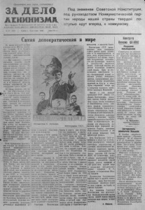 З А Д Е Л О ЛЕНИНИЗМА. Орган Свдерно га Р К К о м м у н н с т к ч ? с < о Й п а р т ч и С в т с - о г о С ю з а а р а й ш н о г о С о в е т а д е п у т ч т п ч т р у д я ц и г с я Н д з о с « ' А р с к о й о л а с г и П од знаменем С ов е тск ой Конституции, под руководством Коммунистической партии народы нашей страны твердой п о ступью идут вперед, к коммунизму. 147 2335) ! Суббога, 5 Д е к а б р я 1959 Ц е н а 1 5 к о п . Самая демократическая в мире Но время недавней ж е д а в - О о е д н ч к н Ш т а т ы Аиери ки и нарвщ И С. Хрущев, отвечая <иному .из амсрикнн-. ских деят*.глей. ретив I в«гч'\иа- j нвшему а г ш. тадиет вчаские ПОЦИДки...СiMlд • — Ни гкво: итг i вапнЫЙ" д в и г а т е л ь э н е р г и я людей, и н и ц и а т и в ы - - э т о н а ж и н а , щ ц ,. оо-вашему, бизнес. Мы говорим другое: г л а в н ы й дви г а т е л ь —эт о . с о з н а н и е чело в е к а , сознание того, что он свободен, работает на себя, на св о и х близких,. на свое общество, что средства прриз водства принадд* ж а т общест- в у . а не отдельной ли'Чноёти, которая н а ж и в а е т с я на эк* сп л уа т ацн н ч уж о г о труда. ' За эти «у .словами— два мира, два общ ственных строя, тва обра а жизни. Оли крат ко в выразительно рае к рыгают существо' наших социалистических порядков, закреплен- ,них. Советск-'й К нетитуцвей, день которой мы отмечаем ежегодно, к а к всенародный праздник. - ; Советская 'Конституция за -конодателыю закрепила , т«, что добыто Народами вашей страны нод руко.В"ДСтвом ленинской партии коммунистов. ’ ; Чем близка и дорога советским людям наша Конституция, почему мы называем ее, по выражению народного аки- 1 на Казахстана Джамбула, Не- ликим Советским Законом? Потому, что наша Кинститу ция отвечает коренным интере- сам трудящихся всех нацио наяьностей, выражает их волю; ' Если буржуазные конституции исходят из незыблемости частной, капиталистической собственности на средства Производства, то экономическую основу Советской Конституций; составляет общественная^ социалистическая собственность на эти с р е д с т в а - землю. ее недра, заводы, фабрики. гаахты,— все, чем богато общество. Отсюда не коры стное стремление к наживе люб"й ценой, как в капиталистических странах, характерно для СССР, а сотрудничество и взаимопомощь миллионов людей, их забота об об» щеч благе, общем счастье . Именно об этом свидетельствуют всенародное соревнова ние за досрочное выполнение заданий семилетки, могучее движение бригад и ударников коммунистического труда, благородные дела прядилгщи цы Валентины Гагановой и ее последователей, трудовые под виги рязанских колхозниц, добившихся выдающихся усвительотна о народном благе. Конституция СССР предоставляет всем гражданам страны равные права независимо от их национальности и расы, иола, имущественного и служебного положения. откры-| вает безграничные возможно-1 стн для проявления талантов и способностей миллионов людей. Советский человек я в ляется подлинным хозяином своей страны. Одно из убедительных свидетельств тому—беспримерный подвиг,советских ученых, инженеров, рабочих, осуществивших дерзновенные полеты космических кораблей на Луну н в облет Луны, открывших новую эру в покорении человеком необъятных иросторов Вселенной. Вместе с тем каждый гражданин СССР обязан еоб: •людать Конституцию,, исполнять законы, блюсти дисциплину труда, честно относиться к общественному долгу, уиа- ; <кать правила социалистического общежити