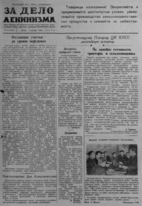 П р о л е т а р и и в с е х с т р а н , с о е д и н я й т е с ь ! ЗА. Д Е Л О ЛЕНИНИЗМА. О р г а н С е в е р н о г о Н К К о м м у н и о и ч в с к о м п а р т и и С о в е т с к о г о Сс - юз а н р а й о н н о ю С о в е т а д е п у т а т о в т р у д я щ и х с я Н о в о с и б и р с к о й о б л а с т и Л« 148 (2336) I 11»ЕДЛ Й декабря 1959 г. j Цена 15 коп. Товарищи нояхознини! З а н р е п я я й т е и приумножайте д о с ти гн у ты е успехи, увеличивайте п р о и з в о д с тв о с е л ь с к о х о з я й с т в е н ных продунтов и снижайте их с е б е с т о и мость. Отстающие участки до уровня передовых Советский народ настойчиво, последовательно борется за успешное осуществление исторических решений X X I съезда КПСС, за досрочное выполнение семилетнего плана. Вместе со всем народом Советского Союза включились в борьбу за подъем сельскою хозяйства li труженики нашего района. Идя навстречу предстоящему Пленуму ЦК КПСС, колхозники и колхозницы напрягают свои усилия, чтобы колхозное богатство росло изо дня в день. Паши колхозы—многоотраслевые хозяйства. Они охватывают различные уча стки по производству продуктов полеводства и жи- бтюводства Для того, что- 'zt бЬльаге производить этих продуктов, у нас не должно быть отстающих участков — полеводческих бригад или ферм. Примером умелого хозяйствования может служить колхоз „Заря коммунизма1, которым руководит коммунист т. Блохин. Правильный подбор и расстановка кадров, усиление организаторской работы в бригадах п на фермах позволило колхозу ликвидировать отставание отдельных участков и получать высокие доходы как от полеводства, так и от животноводства. Совсем другое дело у соседей этого колхоза—ар- им Калинина. Если " , есь сравнительно неплохо идут дела в полеводстве, то в животноводстве похвалиться нечем. Поголовье коров и продуктивность их не растут, слабо развивается свиноводство. В этом колхозе животноводство намного отстает от полеводства лишь потому, что фермы не укомплектованы хорошими кадрами. Подобные явления наблюдаются и в других колхозах района. Отстающие^ участки надо подтянуть до уровня передовых и двигать дальше их развитие, ни ", на минуту не останавливаясь на достигнутом. В этом деле должен найти себе широкое распространение в наших колхозах патриотический по чин Валентины Гагановой. У нас есть подобные примеры, когда отдельные коммунисты. беспартийные передовики производства шли работать туда, где труднее, на передовую липшо борьбы за создание изобилия продуктов для населения, но их мало и они остались незамеченными. Следует партийным организациям, правлениям колхозов обратить серьезное внимание на отстающие участки, направить туда хороших, способных организаторов. Всемерно способствовать благородному стремлению людей, идущих на ликвидацию отставания. Неоценимую помощь в преодолении отставания могут оказать передовые бригады, фермы. В этом отношении у нас есть некоторый опыт, заключающийся во взаимопроверке.Метод взаимопроверки надо поста вить так.чтобы в отстающие бригады и на фермы выезжали передовики и руководители лучших бригад, ферм и на месте помогали внедрить свой опыт. И наоборот, бригадиры, заведующие ферм, доярки и другие работники отстающих бригад и ферм выезжали в передовые хозяйства, где они учились бы и практически заимствовали образцы работы. Немалую роль в этом деле может сыграть социалистическое соревнование между п