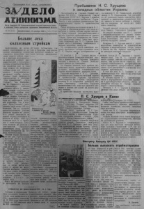П р о л е т а р и и sCeл \.трин, со ед иня йт е сь ! ЗД/ДЕЛО ЛЕНИНИЗМА. Орган Северного Р К Коммун ис тическо й па р ти и Советского Союаа и районного Совета д е п у т а т о в трудящихся Новосибирской области Пребывание Н. С. Хрущева в западных областях Украины .41 150 (2338) I Находящийся на Украине Первый с е к ретарь Ц К К П С С , Председатель Совета Министров С С С Р Н.С. Хр ущ ев 9 декабря {специальным поездом прибыл во Львов. | Вместе с ним прибыли руководители Ком i J мунистической партии н правительства Украины. После непродолжительного отдыха Н. С. Хр ущ ев и сопровождающие его лица ос- ВОСКРЕСЕНЬЕ, 13 декабря 1959 г. | Цена 15коп. | могрели в здании обкома партии выставБольше леса колхозным стройкам Включившись во всенародное соревнование за досрочное выполнение планов семилетки, труженики кол хозов нашего района наряду с другими мероприятиями намечают широкое производственное и культурно- бытовое строительство.Многие хозяйства у ж е в этом году возвели по несколько типовых ферм для общест ненного животноводства, построили клубы, школы. Хорошо было развернуто строительство в колхозах ' „Заря коммунизма1*, „ П у т ь Сталина**, им. Калинина, им. М. Горького и других. Большинство колхозов Ш пппапляет заботу о выпол- планов строительства году—втором году гки. Поэтому еще в создали бригады л е созаготовителей и ведут работы по заготовкам деловой древесины. Так, в колхозе „ П у т ь Сталина** заготовлено у ж е около 500 к у бометров. Там до каждого производственного участка доведено задание из расчета в общей сложности за зимний период заготовить и вывезти не менее 2600 к у бометров леса. А в бригадах, в свою очередь, доведены задания до звеньев и трактористов. Правление разработало меры материального поощрения на период заготовки леса. Полным ходом заготавли- р И Ц ю т лес для строительства в колхозах „Н овая жизнь**, „7-й съезд Советов*1^ „ П у т ь к коммунизму** и других. Но так дело обстоит далеко не в каждом хозяйстве. Непонятно,на что надеются руководители и правления колхозов „ П а мять Ленина1* и „П ам я т ь 20 тысяч кубометров, 1ак как в будущем году колхозам предстоит возвести не один десяток животновод- ■ ЖЪ;.- ш - * - ■ ш & Ш - Ж ; к у новых изделий электротехнической и других отраслей промышленности города |Львова. Затем они направились на Л ь в о в ский автобусный завод. Здесь они посетили сборочный цех. Н. С. Хр ущ ев бесед о в а л здесь с рабочими, ознакомился с новыми моделями автобусов. На состоявшемся затем заводском митинге выступили слесарь кузовного цеха П. И. Павлнв, мастер автокранового це- ♦ * 10 декабря т. Н . С. Хр ущ ев вместе с руководителями Коммунистической партии и правительства Украины совершил поездку в колхоз им Сталина Золочеп- ского района на Львовщине, 11а станции Золочев, куда прибил специальный поезд, труженики предприятий и строек, колхозники близлежаших сел горячо приветствовали дорогого гостя. Радушно встретили т. Н. С. Хрущева, руководителей Коммунистической партии и правительства Украины труженики сельхозартели йм. Сталина. Председатель колхоза Н. Ф . Старовина преподнес Н и ките Сергеевичу хлеб-соль, сердечно приветствовал его, пожелал крепкого здоровья и долгих лет жизни на .благо родной отчизны. _ Выправлении колхоза состоялась задуЛ е соз а гото вки и в ы в о з к и в разгаре! Ф о т о А. З уб о в а Фотохроника ТАСС ха. инженер Я. М. Подвальный, дир