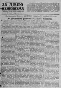 Постановление Пленума ЦК КПСС, принятое 25 декабря 19,с L B > i ; i шик и орудий,самоходных шасси. Ё Ш а р т о ф е л е у б о р о ч н ы х комбайнов и р ^ Т д р у г и х машин, необходимых для дальнейшей механизации т р у д о е м ких работ и замены имеющейся в с ельском хо зя й ст в е у ст ар е вш е й ,м а лопроизводительной т ехники . Не устранены крупные н е д о с т а т ки в организации производства и тор го вле запасными частями к т р а к - . торам, автомобилям и с е л ь с к о х о зяйственным машинам р е зи н о те х ническими изделиями, особенно т и н а м и . Предприятия Новосибир- к о г о , Р о с т о в с к о г о , П ен зен ск о го , ря нек о го Д н еп р оп е тр о в ско го и нницкого с о в н а р х о з о в не выполнили планов производства запасных частей. Всесою зная Академия с е л ь с к о х о зя й с т в е н н ы х н а у к им. В, И. Л е н и на, академии с е л ь с к о х о з я й с т в е н н ы х н а у к сою зны х республик, многие нау ч н о -и ссл е д о в а т ел ь с ки е н у ч еб ные институты слабо разрабатывают, наиболее важные теоре тиче ские проблемы развития с е л ь с к о г о х о з я й с т в а , медленно перестраивают свою работу, еще недостаточно свя заны с производством, Работа научны х учреждений «о с тавл ена так. что многие научны е с о т р у д ники не о т в е ч а ю т за внедрение в производство с во и х н а у ч ны х исследований и рекомендаций. Н ер ед ко с е л ь с к о х о з я й с т в е н н ы е опытные 'станции,научные учреж дения и у ч е б |Ые заведения не являются примером для к о л х о з о в и с о в х о з о в , так к а к имеют производственные п о к а затели ниже, чем находящиеся рядом с ними хозяйства. Пленум ЦК КПСС считае т , что недостатки в развитии земледелия и ж и вотноводства в значительной мере объясняются тем , что многие местные партийные, с о в е т ск и е и с е л ь с к о х о з я й с т в е н н ы е органы слабо провод»;, организаторскую работу , н ер ед ко по старинке подходят к р у к о в о д с т в у колхозами и с о в х о з а ми. Вместо того* чтобы быть о р г а низаторами производства, настойчиво в н е д р я т ь в практику в с е нов о е , п ер е д о в о е , они ограничивают- V ся формальным одобоением мероприятий партии, общими призывами, мирятся с недостатк ами , не ок азы ваю т с ущ е с т в е н н о г о влияния на положение д е л в к о л х о з а х и с о в х о з а х . В нашей стране со зд ан ы теперь в с е необходимы е у сл о в и я для дальнейшего мощного подъема в с е х от ра сл ей с е л ь с к о г о х о з я й с тва . В с е б о л е е широкий р а з м а х п о луч ае т всен ародное движ ени е , начатое по почину передовых к о л х о з о в и с о в х о з о в , з а то, чтобы в б лиж айш и е го ды до гн ат ь и перегнать Соединенные Штаты Америки по п р о и з в о д с т в у мяса, м олока и масла на д у ш у н а с е л е ния. С о ц и а л и с т и ч е с к о е с о р е в н о вание, р а з в е р н у в ш е е с я в р е с п у б л и к а х , краях и о б л а с т я х , п о к а зы в а е т . что зад ан ия семилетки по ра звитию с е л ь с к о г о хо зяй с т в а м о гут быть выполнены доср оч но . Пленум ЦК КПСС п о с т а н о в л я е т 1, Одобрить мероприятия по д а л ь нейшему подъ ем у земледелия и живо тно вод ства , увели ч ен ию прои з в о д с т в а с е л ь с к о х о з я й с т в е н н ы х п родук тов и о б я з я т е л ь с т в а по д о срочному выполнению заданий с е - милетнего плана, и злож енны е в д о клад ах С о вета Министров Р С Ф С Р (т . П о л я н ск о го ) , ЦК КП Украины ( т . Подгорного)', ЦК КП К а з а х с т а на ( т . Б е л я е в а ) ,Ц К КП Белоруссии (т . М а з у р о в а ) , ЦК КП У збеки стан а (т . Р аш и 