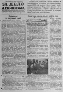 П р о л е т а р и и вс е х с т р а н , с о ед и н я йт е с ь ! А~ДЕ Л ЛЕНИНИЗМА О р г а н С е в е р н о г о Р К К о м м у н и с т и ч е с к о й п а р т и и С о в е т с к о г о С о ю з а и р а й о н н о г о С о в е т а д е п у т а т о в т р у д я щ и х с я Н о в о с и б и р с к о й о б л а с т и Яь 5 (2349) СРЕДА, 13 я н в а р я 1960 г. Цена 15 коп. В сельском хозяйстве нашей страны, в деятельно с ти колхозов, партийных организаций 1960 год должен быть годом мобилизации резервов. П о д этим знаном прошел декабрьсний Пленум Ц К К П С С , к этому направлены его решения. А резервы наши поистине неисчислимы. Селькоры, на передний край! Х о р о ш и м , р а д о с т н ы м , б о е в ы м б ы л и с т е к ш и й , 1959 г о д . Д о б р ы м и с л о в а м и п р о в о д и л и е г о в с е с о в е т с к и е л ю д и . Н а ш н а р о д п о д р у к о в о д с т в о м К о м м у н и с т и ч е с к о й п а р т и и д о б и л с я в 1959 г о д у н о в ы х з а м е ч а т е л ь н ы х у с п е х о в в с т р о и т е л ь с т в е к о м м у н и з м а . В с в о е м н о в о г о д н е м п р и в е т с т в и и с о в е т с к о м у н а р о д у Ц е н т р а л ь н ы й К о м и т е т К П С С , П р е з и д и у м В е р х о в н о г о С о в е т а С С С Р и С о в е т М и н и с т р о в С С С Р п о д ч е р к н у л и , ч т о „ К о м м у н и с т и ч е с к а я п а р т и я и С о в е т с к о е п р а в и т е л ь с т в о в н о в о м г о д у , к а к и п р е ж д е , б у д у т н ф г т о й ч и в о и п о с л е д о в а т е л ь н о в е с т и б о р ь б у з а н о в ы е у с п е х и в р а з в и т и и н а р о д н о г о х о з я й с т в а , з а п о в ы ш е н и е б л а г о с о с т о я н и я с о в е т с к и х л ю д е й , з а у п р о ч е н и е м и р а и д р у ж б ы м е ж д у н а р о д а ми “ . г С е й ч а с к а ж д ы й п р о и з в о д с т в е н н ы й к о л л е к т и в о п р е д е л я е т , а м н о г и е у ж е о п р е д е л и л и р у б е ж и , к о т о р ы е о н и д о л ж н ы в з я т ь в о в т о р о м г о д у с е м и л е т к и . З а б ы с т р е й ш е е о с в о е н и е э т и х р у б е ж е й в с е ш и р е р а з в е р т ы в а е т с я с о ц и а л и с т и ч е с к о е с о р е в н о в а н и е . Б о л ь ш и е и о т в е т с т в е н н ы е з а д а ч и с т о я т в э т о й с в я з и п е р е д н а ш е й п е ч а т ь ю , п е р е д с е л ь с к и м и к о р р е с п о н д е н т а м и . Д о л г с е л ь к о р о в — п о к а з а т ь с е м и л е т н и й п л а н в д е й с т в и и , в е с т и р а с с к а з о т о м , к т о с в о и м т р у д о м у с п е ш н о б о р е т с я з а е г о п р е т в о р е н и е в ж и з н ь , о н о в а т о р а х п р о и з в о д с т в а , п е р е д о в и к а х , р а с к р ы в а т ь и н е с т и в ма с сы п о у ч и т е л ь н ы й о п ы т , р а с с к а з ы в а т ь о с о р е в н о в а н и и з а з в а н и е б р и г а д к о м м у н и с т и ч е с к о г о т р у д а . О с о б о е в н и м а н и е н у ж н о у д е л и т ь п р о в е р к е в ы п о л н е н и я о б я з а т е л ь с т в , в з я т ы х у ч а с т н и к а м и с о ц и а л и с т и ч е с к о г о с о р е в н о в а н и я . Э т о с е й ч а с г л а в н о е д л я с е л ь к о р о в . я * З а д а ч а с о с т о и т в т о м , ч т о - Дадим больше продукции сельского хозяйства стране * бы в ы п о л н е н и е о б я з а т е л ь с т в в з я т ь п о д п о с т о я н ный и н е о с л а б н ы й к о н т р о л ь о б щ е с т в е н н о е ги. И з д е с ь р о л ь с е л ь с к и х к о р р е с п о к д е н т о в в е л и к а . У м е н и е у л о в и т ь и о ц е н и т ь по д о с т о и н с т в у н о в о е п о л е з н о е н а ч и н а н и е , ц е н н ы й о п ы т - в о т ч т о т р е б у е т с я о т с е л ь с к о г о к о р р е с п о н д е н т а . И б о л ь ш и н с т в о с е л ь к о р о в о б л а д а е т э т и м д р а г о ц е н н ы м к а ч е с т в о м , с ч е с т ь ю в ы п о л н я е т с в о и о б щ е с т в е н н ы е о б я з а н н о с т и . Ч а с т о п и ш у т в н а ш у г а з е т у п о р а з л и ч н ы м в о п р о с ам к о л х о з н о й ж и з н и а г р о н омы к о л х 