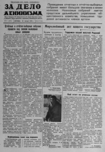 П р о л е т а р и и всех с т р а н , соединяйтесь! ЗА Д Е Л О ЛЕНИНИЗМА О р г а н С е в е р н о г о Р К К о м м у н и с т и ч е с к о й п а р т и и С о в е т с к о г о Союза и р а й о н н о г о С о в е т а д е п у т а т о в т р у д я щ и х с я Н о в о с и б и р с к о й о б л а с т и № 10 (2354) ПЯТНИЦА, 22 января I960 г. Цена 15 коп. Проведение отчетных и отчётно-выборных собраний имеет большое значение в жизни нолхозов. Колхозные собрания явятся средством дальнейшего укрепления о б щ е с тв е н н о го хозяйства, повышения т р у довой активности членов артели. Отчётные и отчётно-выборные собрания провести под знаком выявления новых резервов ' Т р уж е н и к и сельского х о зяйства успешно закончили первый год семилетки К о л хозы намного больше произвели мяса, молока и д р у гих продуктов животноводства против 1958 года, полу чи л и миллионные доходы от общественного х о з я й ства. Сейчас в колхозах идёт подготовка к отчётным и отчётно-выборным собраниям, которые б у д у т проходить в феврале 1960 года. Э т а работа в некоторой ч а сти хозяйств подходит к концу. В колхозах нм. К а линина, „ П у т ь к ко мм у низм^*, им. Крупской и других завершается инвен таризация материальных ценностей, составляются годовые отчёты. Э то даёт возм ожно сть приступить к В т екущ ем году район^должен дать государству м я са в полтора раза больше против плана, на 25 процентов больше молока, в два раза ув е ли ч и ть продаж у яиц, перевыполнить план заготовок шерсти, сдать более миллиона п у дов хлеба. Всё это позволит резко поднять доходы колхозов и выдать'! в достатке хлеба и денег на т р у додни колхозникам. В ходе подготовки к собраниям партийным организациям, правлениям кол хозов следует привлечь к учас тию в ней всех к о л хозников, провести бригадные собрания, на которых об с уд и т ь предварительные итоги, вы с л уш а т ь советы рядовых колхозников, собрать, и обобщить всё цен проведению собраний в ное из опыта передовиков, T T P H O U V u t i r * n n v m o o n a r r o первых числах февраля. Проведение отчётных и отчётно выборных собраний имеет большое значение в . зяйства и роста материаль жизни колхозов. К о л х о з - , ного благосостояния тру Миролюбивый акт нашего государства Э т о поможет полнее в ы яви т ь резервы дальнейшего подъема всех отраслей хоные собрания яв я тс я средством дальнейшего у к р е п ления общественного хозяйства, повышения трудо вой активности членов артели. Перед собраниями стоят бсщгпие задачи. На этих собраниях колхозники долж н ы тщательно рассмотреть итоги за прошедший год, вс к ры ть недостатки в работе правления, подверг н у т ь резкой критике нерадивых колхозников, которые нарушают трудовую дисциплину, не у ч а с т в ую т в общественном труде и, п о л ь з у я с ь правами к о л х о з ников, раздувают личное хозяйство. В ходе о б с у ж дения итогов необходимо обратить особое внимание на выявление дополнительных резервов для нового подъёма полеводства и ж и вотноводства, определить конкретные мероприятия по досрочному выполнению колхозной семилетки, а это значит, чтобы во втором году семилетки резко у в е ли чит ь производство зерна, мяса, молока и других прод у кто в сельского хозяйства. ж е н и к о в села. Б о л ь ш у ю роль в подготовке к собраниям должны сыграть взаимопроверки бригад, ферм по выполнению социалистических обязательств. Особое внимание н уж но обратить на составление отчётного доклада. Доклад должен содер
