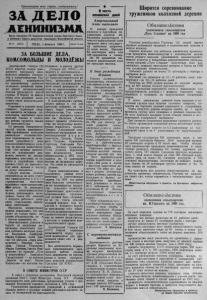 П р о л е т а р и и в с е х ст р а н , с о е д и н я й т е с ь ! з а д е л о ЛЕНИНИЗМА О р г а н С е в е р н о г о Р К К о м м у н и с т и ч е с к о й п а р т и и С о в е т с к о г о С о ю з а и р а й о н н о г о С о в е т а д е п у т а т о в т р у д я щ и х с я Н о в о с и б и р с к о й о б л а с т и № 15 (2359) С Р ЕД А , 3 февраля 1960 г. Ц е н а 15 коп. ЗА БОЛЬШИЕ ДЕЛА, КОМСОМОЛЬЦЫ И МОЛОДЁЖЬ! Декабрьский Пленум Ц К | К П С С наметил новую гран диозную программу дальнейшего развития земледелия и животноводства. Раз работанные мероприятия по дальнейшему развитию сельского хозяйства вызвали новый патриотический подъем трудящихся нашей страны. В борьбу за выполнение этих решений включилась наша молодежь,комсомольцы. Комсомол в деревне представляет огромную силу. Он является активным помощником партийных организаций. Только в колхозах района трудится свыше 500 комсомольцев. По призыву Коммунистической партии Комсомольс к е организации колхозов развернули социалистическое соревнование за повышение урожайности всех сельскохозяйственных к у л ь тур, за подъем животноводства. Они активно включи лись во всенародное движение, начатое по почину передовых колхозов, за то, чтобы в ближайшие годы догнать С Ш А по производству мяса, молока и масла на д уш у населения. Следуя заветам Ленина, комсомольцы на всех участках коммунистиче с к о г о строительства постоянно проявляют свою инициативу, й*5й почин. За последнее время животноводческие фермы пополнились молодежью. Более 180 юношей и девушек работают доярками, телятницами, свинарками, скотниками. Молодежь конкретными делами доказывает, что она умеет не только брать хорошие обязательства, но и с честью выполнять их. Замечательных успехов в борьбе за досрочное выполнение семилетних планов добились молодые доярки Екатерина Алфёрова, Мария Юркина, Люба Дра- ган—из колхоза „За р я коммунизма", Варвара Рыль- ская, Таисья Першеева, Мария Блинова,Таисья Мок- роусова— из колхоза „ П у т ь к коммунизму", Анастасия Скороходова — из колхоза „Борьба за мир", Мария Каплерова— из колхоза им. Калинина и многие другие. „Пленум Ц К К П С С , — говорится в постановлении,— с удовлетворением отмечает большую творческую работу, проводимую комсомольскими организациями и всей нашей .молодежью на селе по практическому осуществлению решений X X I съезда К П С С и декабрьского Пленума Ц К К П С С " . В комсомольских организациях района в эти дни проходят собрания, на которых берут повышенные обязательства. Так, комсомольцы и молодежь колхозов им. Калинина, „Новая жизнь" приняли обязательства по досрочному выполнению семилетних планов. Доярки Алешинской комсомольско-молодежной ж и вотноводческой ф е р м ы Анастасия Лушова, Елизавета Петрова, Прасковья Сергеева, Екатерина Петрова, Любовь Демидова, Люба Дюжова, подсчитав свои возможности, взяли обязательства в 1960 году надоить по 19 центнеров молока на .фуражную корову . Их слова не расходятся с делами. Перед комсомольцами и молодежью района стоят почетные и ответственные задачи. На 1960 год район взял большие обязательства по производству продуктов сельского хозяйства. Практическая деятельность комсомольских организаций должна быть направлена на то, чтобы каждый молодой человек был вовлечен в активную борьбу за выполнение этих обязательств,на развертывание социалистического соревнования за звание ферм, бригад, участков