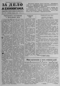 П р о л е т а р и и всех с т р а н , соединяйтесь! ЗА Д Е Л О ЛЕНИНИЗМА О р г а н С е в е р н о г о Р К К о м м у н и с т и ч е с к о й п а р т и и С о в е т с к о г о С о ю з а и р а й о н н о г о С о в е т а д е п у т а т ов т р у д я щ и х с я Н о в о с и б и р с к о й о б л а с т и № 16 (2360) ПЯТНИЦА, 5 февраля 1960 г. К о л х о з ы р а й о н а в з я л и в ы с о к и е о б я з а т е л ь с т в а по с т р о и т е л ь с т в у п р о и з в о д с т в е н н ы х и к у л ь т у р н о - б ы т о в ы х о б ъ е к т о в. З а д а н а т е п е р ь с о ст о ит в т о м , ч т о б ы м о б и л и з о в а т ь все с ил ы и с р е д с т в а на б ы с т р е й шее вы п о л н е н и е п л а н о в з а г о т о в о к л е с а и в ы в о з к и е г о к м е с т а м с т р о и т е л ь с т в а . Ц е н а 15 к о п . П р е о д о л е т ь о тставание с заготовной леса В обязательствах, принятых на второй год семилетки колхозами района, пре- Хдусматривается, наряду с резким увеличением производства зерна, молока, мяса, шерсти, яиц, широкое строител ь с т в о животноводческих ферм, культурно-бытовых и ж и лых помещений. Колхозам предстоит завершить строительство начатых и вновь построить свыше 30 коровников, телятников, свинарников, кошар, птичников, зерноскладов, гаражей, к л у бов, детских яслей, ввести в строй больше 250 жилых домов. С таким большим объемом строительных работ ьдосно успешно справиться ' " ^ и ь при условии, что весь необходимый для этого лес будет своевременно заготовлен и вывезен к местам строительства. Хорошо сознавая это, колхозники многих артелей не жалеют усилий, чтобы досрочно выполнить план лесозаготовок. Так, члены колхоза им. Крупской твердо заявили, что 2,5 тысячи кубометров, которые им требуются, б у дут заготовлены и вывезены к 15 марта. Выполняя свое обещание, они за короткий срок свалили с корня и стрелевали 800 вая ж и з н ь “ из плана трех тысяч заготовили у ж е свыше тысячи кубометров, выработка на одного лесозаготовителя здесь составляет с начала сезона 140— 150 кубометров. Однако такие темпы пока, к сожалению, редкость. В большинстве колхозов положение с лесозаготовками создалось весьма тревожное. Достаточно сказать, что всего леса заготовлено только 19,3 процента к общему плану. Особенно плохо обстоит дело с заготовкой леса в колхозах им. Калинина, „Память Кирова", им. М. Горького, „Память Ленина", „ П у т ь к коммунизму", „7-й съезд Сове- ^ т о в " . План лесозаготовок здесь выполнен лишь на G— 12 процентов. Р у к о в о дители и секретари партийных организаций этих артелей проявили непростительную беспечность в вопросе организации лесозаготовок и упустили дорогое время. В этом и кроется основная причина такого недопустимого отставания. Колхоз „Память Кирова", например, из плана 2500 у -«-afc э м е т р о в. Лесору- сельхозартели „ П о имеет лишь 200 кубомет ров леса только потому что к заготовке его при ступил не с 15 декабря, как было намечено по план у й в конце января.Подсчеты показывают, что за это упущенное время та же ле созаготовительная бригада могла напилить и уложить в штабели около 1000 к у бометров леса. А лес этому колхозу особенно нужен: не случайно в деревне Усть- Ургульке коровник второй год стоит без крыши, здание приходит в негодность. Не лучш е идет дело с заготовкой леса и в сельхозартели им. Калинина, в ко торой при плане 2 тысячи заготовлено всего 130, а вывезено и того меньше—40 кубометров. Артель начала лесозаготовки не в начале декабря, как предусматривалось, а только с 25 января. А ведь за эт