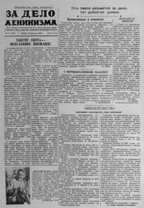 П р о л е т а р и и вс е х стран, со е д и н я йт е с ь ! здГд е л о ЛЕНИНИЗМА С е г а н С е е е р н с г о Р К К о к к у к и с т и ч с с к п й г а р т и и С о в е т с к с г о С о ю з а "и р а й о н н о г о С о в е т а д е п у т а т о в т р у д я щ и х с я Н о в о с и б и р с к о й о б л а с т и № 18 (2362) СРЕД А , 10 февраля 1960 г. Ц ен а 15 коп. К т о смело во зьм ется з а дело, то т д о б ь е т с я успеха Промкомбинат в семилетке ЗАКУПУ СКОТА— НЕОСЛАБНОЕ ВНИМАНИЕ Т р у ж е н и к и района на в т о рой год семилетки взяли о б я з а т е л ь с т в а — у в е л и ч и т ь по го ло вье кр у п н о го рогатого скота на 26 процентов, в том ч и с ле ко р о в— на 19 процентов, свиней — на 52, о в ец— на 49 п р о ц ен то в .П ро дать г о с у д а р с т в у м яса в полтора раза бо л ьш е плана, у в е л и ч и т ь производство молока на 100 ге к тар о в с е л ь хозугодий на 46 процентов против прошлого года. Э ти о б я з а т е л ь с т в а вполне р еальные , так к а к они разраб атывали сь с у ч е т о м имеющихся в о зм ож н о стей и р е зервов в колхозах. Одним -из особо в а ж н ы х р езервов пополнения п о го ло вья ж и вотных я в л я е т с я з а к у п с к о та у населения. В прошлом году, например, колхозники сельхозартели им. К р у п с к о й сдали и продали на ферму 155 голов кр уп но го рогатого с к о т а . Э т о позволило к о л х о з у д о с ти ч ь у р о в н я по развитию п о г о л о в ь я ж и в о т н ы х тр ет ье го года семилетки, выпо лн и ть годовой(1959 года) план продажи мяса г о с у д а р с т в у на 106,7 процента и создать резервы для производства мяса в 1960 году. В ян вар е т е к у щ е г о года к о л х о з выполнил к в а р т ал ьны й план з а г о т о в о к м я са на 211,7 процента. Х о р о ш о вел з а к у п скота у населения в 1959 году к о л х о з „ З а р я к о м м у н и з м а " . К о л х о з т а к ж е выполнил в январ е ква р тал ь н ы й план на 122 процента. В т е к у щ е м году к о л х о зам района предстоит з а к у пить у населения не менее 3500 голов к р у п н о г о рогатого скота. У ч и т ы в а я этот в а ж н ы й резерв, не которые к о л х о зы разверн ули б о л ь ш у ю м а ссово-разъясни тельн у ю р аб от у среди населения по сдаче и пр од а ж е на фермы ж и в о т н ы х . Например, к о л х о з „ Б о р ь б а за м и р " , председатель т. Виноградов и се кр е та р ь парторганиза ции т. Я к о в л е в , у ж е з а к у пил у населения более ста голов молодняка. Н еп ло х о органи зован з а к у п ск о та у населения в ко л хо за х „ Н о вая ж и з н ь " и им. М . Г о р ь кого. О д н а к о в целом по райо н у з а к у п ско та у населения идет н е уд о в л е т в о р и тельно . И з плана 3500 го лов за кон тр ак товано всего л и ш ь 530 голов и п о с т а в лено на ко л х о зн ы е фермы т о л ь к о 97 голов. Н е п о н я т н у ю позицию заняли в этом деле руководители колхоза им. К али нин а тт. А г р ы з к о в и К у л и к о в . Н е с м о т р я на то, что в ^колхозе небольшие фермы,а рабочих р у к в п о л не достаточно, правление до сих пор не з а к у п и л о у населения ни одного т е л е н к а . С п р аш и в а е т с я , к а к ж е д у м аю т руковод и тели к о л хоза в ы п о л н я т ь свое о б я з а т е л ь с т в о по у в е л и ч е н и ю п о г о ло в ья и продаже мяса гос у д а р с т в у . П л о х о с з а к у пом ск о та в ко л х о за х „7 й с ъ е з д С о в е т о в " и „ П а м я т ь Л е н и н а " . Н ад о зам ети т ь , ч то ряд с е л ь с ки х С о в е т о в — Граждан- н е вский , т. Гр и г о р ь е в , Ос- танинский , т. Ольховик.сто-. ит в стороне от этого в а ж ного дела. Н е органи зует з а к у п ск о та у рабочих и с л у ж а щ и х , у ко л хо зн ико в . З а д а ч а руко вод и тел ей к о л х о з о в , се л ь с ки х С о в е тов, п