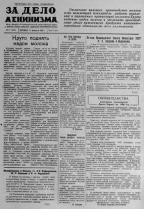 П р о л е т а р и и в с е х с т р а н , с о е д и н я й т е с ь ! ЗА Д Е Л О ЛЕНИНИЗМА. О р г а н С е в е р н с г о Р К К о м м у и и с т и ч с с к с й г а р т и и С о в е т с к о г о Союза и р а й о н н о г о С о в е т а д е п у т а т о в т р у д я щ и х с я Н о в о с иб и р с к о й о б л а с т и № 19 ( 2363 ) ПЯТНИЦА, 12 февраля 1960 г. Ув е лич е ни е в а л о в о г о п р о и з в о д с т в а м о л о к а е сть в ажн е йший п о к а з а т е л ь р а б о т ы п р а в л е ний и п а р т и й н ы х о р г а н и з а ц и й к о л х о з о в , К р у т о п о д н я т ь н а д о и м о л о к а и у в е л и ч и т ь п р о и з в о д с т в о э т о г о в ажн е йш е г о п р о д у к т а п и т а н и я— п е р в е й ш а я о б я з а н н о с т ь в с е х к о л х о з н и к о в . Ц е н а 15 к о п . Круто поднять надои молока К о л х о з ы н а ш е г о района в с о р е в н о в а н и и з а у в е л и ч е ни е п р о и з в о д с т в а м о л о к а з а н я л и п о с л е д н е е ме с т о в о б л а с т и , д а л и н а и м е н ьши й п р и р о с т по с р а в не н ию с я н в а р е м 1959 г о д а . Т а к о е п о л о ж е н и е не м о ж е т не в ы з в а т ь з а к о н н о й т р е в о г и за в ып о л н е н и е в з я т ы х о б я з а т е л ь с т в по у в е л и ч е н и ю н а д о е в . Вме с т о п о в с е д н е в н о й б о р ь бы з а п о в ы ш е н и е н а д о е в м о л о к а о т д е л ь н ы е п р а в л е н и я к о л х о з о в и с п е ц и алисты с е л ь с к о г о х о з я й с т в а о г р а н и ч и в аю т с я о дними п р и з ыв а м и . К о л х о з ы „ З а р я к о м м у н и з м а " , им. К р у п с к о й , им. К а л и н и н а , „ Н о в а я ж и з н ь " н е т о л ь к о не у в е л и ч и л и , но с о к р а т и л и п р о и з в о д с т в о м о л о к а , не д о б р а в в я н в а р е о к о л о 17 тонн. Ус л о ви я в э т их к о л х о з а х во многом л у ч ш е , чем в д р у г и х а р т е л я х , б о л ь ш а я ч а с т ь к о р о в р а с т е л и л а с ь . С к о т р а з м е щ е н в д о б р о т н ы х д в о р а х и о б е с п е ч е н к о р м а м и , а у д о и н и з ки. Э г о р е з у л ь т а т с л а б о й о р г а н и з а т о р с к о й и п о л и т и к о - м а с с о в о й ра бот ы с р е ди р а б о т н и к о в фе рм. Н и ж е с в о и х в о з м о ж н о ст ей п о л у ч а ю т н а д о и м о л о к а к о л х о з ы „ З а в е т ы И л ь и ч а " , им. М. Г о р ь к о г о , „7-й с ъ е з д С о в е т о в " , „ Пу т ь Ст а л ин а " . С л е д у е т о т м е т ит ь х о р о ш у ю р а б о т у У с т ь - У р г у л ь - с к ой ф е р мы к о л х о з а „ П а м я т ь К и р о в а " , н е д а в н о с а мую о т с т а ю щу ю в а р т е ли . З д е с ь з а в е д у ю щ и й п р о и з в о д с т в е нным у ч а с т к о м Л . В а - с и л ь ц о в и з а в е д у ю щ и й ф е р мой С. С т а н к е в и ч с у ме л и о р г а н и з о в а т ь п о л у ч е н и е в ы с о к их у д о е в м о л о к а . Ск о т поит ся т о л ь к о п о д о г р е т о й в од о й . Н а л а ж е н а т р у д о в а я д и с ц и п л и н а , с т р о г о с о б л ю д а е т с я р а с п о р я д о к дня . Со в с ем не т о на З а б о е в - с к ой ф е р м е т о г о ж е к о л х о з а . З а в е д у ю щ и й п р о и з в о д с т в е нным у ч а с т к ом т. П а в л о в не м о ж е т о р г а н и з о в а т ь с в о е в р е м е н н ы й п о д в о з г р у бых к о р м о в и с о з д а т ь их з ап а с . З а ч а с т у ю с р ы в а е т с я р а с п о р я д о к д н я . П о э т о м у и у д о и з д е с ь почти в д в о е ни ж е , чем в с о с е д них б р и г а д а х . С б о л ьши м и п е р е б о я ми д о с т а в л я ю т с я к ор ма в к о л х о з а х „ П у т ь С т а л и н а " , им. Кр у п с к о й , н а р у ш а ю т с я к о р мо вые ра ционы. С л а ж е н н а я р аб о т а в с е г о к о л л е к т и в а —вот з а л о г в ы с о к их н а д о е в м о л о к а на ф е р м а х . К о л х о з ы н а ш е г о р а йо н а и меют в с е в о з м о ж ности з а к о н ч и т ь з и м о в к у с х о р о ш и м и п о к а з а т е л я м и . Н е с м о т р я на явный н е д о с т а т о к к о р м о в в к о л х о з а х „ П у т ь к к о м м у