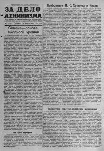 Совместное советско-индийское коммюнике ( О ь о н ч Е К к е . Н а ч . н а 1 с т р . ) создания таких условий, от которых зависят перспективы мирного развития человечества. Настоящий визит предоставил П. С. Хрущеву ноз мсжность увидеть те уси лия, которые делает Индия во' всех областях развития для улучшения участи им дийского народа и для обеспечения ему более в ы сокого и непрерывно повышающегося жизненного уровня. В результате этого визита, говорится в заключение коммюнике, к новой главе индийско-советских отношений, начавшихся визитом премьер-министра Ин дии в Советский Союз в июне 1955 года, добавилась важная страница, отмечающая значительный шаг вперед в деле укрепления сердечных и дружественных отношений между двумя странами. ТАСС. Прибытие Н. С. Хрущева в Бирму 16 февраля по приглаше- На аэродроме президент нию Бирманского правитель- Бирманского Союза У Вин ства в Рангун прибыл Пред- .Маупг и Н.С .Хрущев обмеседатель Совета Министров С С С Р Н. С. Хрущев и сопровождающие его липа.На аэродроме Мингаладсн Н.С. Хрущева встречали президент Бирманского Союза У Вин Маунг, премьер министр Бирмы Не Вин, члены Бирманского правительства, представители бирманских общественных организаций. нялись речами. В тот же день состоялась встреча Н. С. Хрущева с видным общественным и политическим деятелем Бирманского Союза, лидером политической партии— „ ч и стой*1 антифашистской лиги народной свободы У Н у . Б е седа носила дружественный характер. К 9 0 - л е т и ю со д н я р о ж д е н и я В. И. Л е н и н а В . И. Ленин беседует с к р е с т ь я н а м и . ' (С картины худ. М. Соколова) В. И . Л е н и н и к р е с т ь я н с т в о И з в о с п о м и н а н и й М. И. К А Л И Н И Н А Всю жизнь товарищ Ленин посвятил одной цел и—уничтожить полностью, во всех видах, даже самых замаскированных и скрытых, рабство. Все, что помогало, вело к уничтожению неравенства, порабощения, находило в Владимире Ильиче самого горячего сторонника; все же то, что растило, укрепляло, защищало рабство, имело в нем могучего противника ,— с рабством он вел борьбу не на живот, а на смерть. Вот почему Ленина так ненавидят угнетатели всех народов, —в его лице они имеют противника, с кото рым не заключишь за спиной народа убыточный для народа договор. Его не к у пишь никакими прелестями мира, ибо он был чужд этим прелестям, им владела одна страсть всецело и безраздельно — „Долой рабство". Главная особенность товарища Ленина в том, что он повел за собой и направил на борьбу с рабством ■/ • огромные с и л ы народа. Такой силой является крестьянство. Конечно, крестьянство как громадная сила существовало и раньше Э ту силу имели в виду даже мелкобуржуазные партии, и, однако, от этого влияние крестьян на победу революции не увеличивалось. Товарищ Ленин первый у к а зал на необходимость сочетания в борьбе с угнетателями рабочих и крестьян, он не только указал, а напри мере доказал, что только при таком сочетании,как рабочие плюс крестьяне и сплачивающая их Комму нистическая партия, возможна победа рабочих и крестьян над их врагами, что крестьянство сильно постоль ку , поскольку оно идет в союзе с рабочими. Самым лучшим ему памятником будет сохранять, развивать и не терять ни на одну минуту основной цели— полной победы рабочих и крестьян над угнетателями во всем мире. В п и о н е р с к и х о р г а н и з а ц и я х На пр и згазеты ..Пионерская правда"
