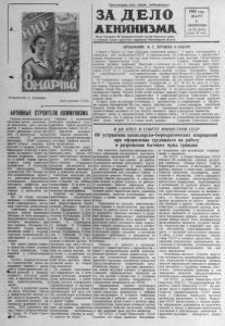 4 Ф отомонтаж Б. Антонова. Фотохроника Т А С С . АКТИВНЫЕ СТРОИТЕЛИ КОММУНИЗМА Читаем статистические сообщения: почти половина— 49 процентов всех специалистов с высшим образованием— женщины; среди врачей 76 процентов, среди учителей 70 процентов женщины; 25500 женщин имеют учёные степени, в вы сших и средних учебных ^заведениях девуш ки и ж е н щины составляют более половины учащ и х с я ; ж енщ и ны в нашей стране приумножают славу советской литературы и искусства: 549 писательниц, 1743 художницы, 154—‘члены союза композиторов; артистки, работники кул ь т ур н ы х учреждений, специалисты сельского хозяйства, миллионы славных тружениц города и колхозной деревни. Но за этими скупыми цифрами и сообщениями— наша современница, актив ный строитель коммунизма. Со ветская, подлинно народная власть вызволила женщин из того позорного, полурабского положения, в котором находились они при царизме. Ж е н щ и н а С о ветского Союза я вл яе тся активной силой в государственной, политической, хозяйственной и культурн ой жизни. М ы свято храним память о м уж е с т в е наших женщин в годы революции, Г р а ж данской и Отечественной войн. Успехи социалистического строительства т а к ж е неразрывно связаны с активной и самоотверженной раб о т о й женщин в промышленности, сельском хо зяй стве, в народном просвещении, здравоохранении, в науке. П о ч ё т и уважение снискали наши женщины. Партия и правительство высоко ценят заслуги тружениц . С в ы ш е миллиона женщин награждено орденами и медалями, 2605 удостоены з в а ния Г ер о я Социалистического Труда, 75— Героя Совет- qporo Союза. Наравне с мужчиной женщина управляет го су дарством. Среди депутатов Верховного Совета С С С Р - 26,7 процента женщин. Е щ ё больше депутатов - женщин в республиканских и местных Советах депутатов трудящихся. Н аш е государство о к р у ж ает почётом и заботой женщину-мать. Около 60 ты с я ч многодетных матерей имеют почётное звание Мать-героиня. Огромные средства расходуются на оказание помощи многодетным и одиноким матерям. Советские женщины гордятся достигнутыми усп е хами в борьбе за победу коммунизма. И в этих у с пехах есть доля труда женщин нашего района. Борются за досрочное выполнение семилетнего плана, за получение высокой продуктивности скота доярки, свинарки, телятни цы А. Цыганкова, Е . Сте- букова, Е . Коржов а , О.Дем- чихина, В . Р ы л ь с к а я , А .Ряб- цева, Е . Мамакова, В . О с танина, А . Гламаздина, Л . Зензина, Е . Потапова, М . Харитонова, А . Скоро- ходова, Н.Давыдова, Н.Ков- ган, П. Шпакова, Н. Г в о з дева, Е . Нескорова, В. К у ликова и многие другие. В прошлом году они с честью выполнили свои обязательства по надою молока, полу ч ению и сохранению .молодняка, откорму скота. Е щ ё более высокие обязательства взяли на второй год семилетки. Со словами благодарности обращаемся мы к ж е н щинам учи телям , медицинским работникам, к работникам детских учреждений, промышленных и торговых предприятий, учреждений и организаций, чей труд т а к ж е способствует успешному строительству коммунизма в нашей стране. Слава советским ж енщ и нам—активным строителям коммунизма, неутомимым труженицам, борцам за мир и счастье на земле! Пролетарии, вс е х стран, соединяйтесь! ЗА Д Е Л О ЛЕНИНИЗМА Орган С еверного Р К К о м м у н и с т и ч е с к о й па рти и С о ве тско го Союза и районного С о в е т а д е п у т а т о в т р у д я щ и х с я Новосиби