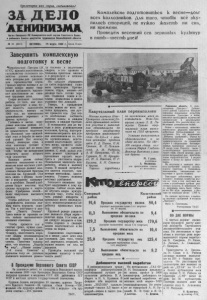 П р о л е т а р и и в с е х с т р а н , с о е д и н я й т е с ь ! ЗА Д Е Л О Ле н и н и з м а Орган Северного Р К Коммунис тической партии Советского Союза и районного Совета д е пу та тов труд ящихся Новосибирской области Комплексно п о д го то виш ься к в е сн е— долг всех колхозников. Для т о г о , ч т о б Ы всё окупилось сторицей , не нуЖно Ж а л е т Ь ни сил, ни времени. Проведём весенний сев зерновЫх кулЬш ур в п я т Ь —ш е с т Ь дней! № 34 (2378) ПЯТНИЦА, 18 марта 1960 г. Ц ена 15 к о п. Завершить комплексную подготовку к весне ^Декабрьский Пленум Ц К К П С С призвал колхозников, специалистов сельского хоз яйства полнее использовать резервы для у в е л и ч е ния производства зерна. При зы в партии вызвал в деревне новую волну творческой активности, вдохновил колхозников на с л а в ные трудовые дела. Скоро весенние полевые работы. О т того, как кол хозы приступят к ним, б у дет зависеть выполнение обязательств, взятых на 1960 год, по повышению урожайности зерновых и других к ул ь т ур . Г о тов яс ь к весне, передовые колхозы района о б ращают главное внимание на комплексную подготовк у . Весенний се в— важней ший этап в борьбе за высокий урожай. В о т почему сейчас, накануне сева, в этих колхозах готовят к выходу в поле всё до мелочей, чтобы во всеоружии встретить весну второго года семилетки. В ажным делом сейчас яв л я е т с я накопление и в ы возка на поля местных удобрений. Хорошо делают к о л хозники Витинской бригады колхоза им. Крупской. Они вес ь навоз с фермы вы во з я т и аккуратно складируют в штабеля . Весной удобрения б у д у т внесены под посевы к у к у р у з ы и картофеля. Удобрения полей— залог получения высокого ур ожа я . Чтобы добиться подъёма урожайности, колхозы должны иметь хорошие с е м е на. Т ак и поступают в кол хозе „ П а м я т ь Ленина". Здесь взяли за правило се я т ь только вы со ко к а ч е с т венными семенами. Чтобы провести сев в с ж а ты е сроки, н уж н о с в о е временно отремонтировать технику , подготовить хорошие кадры механизаторов на каждый трактор в две смены. Практи ка показывает, что колхозы „Б о р ьба ^ а мир", „ Н о в а я ж и з н ь " , „7-й съезд Со в ето в " в прошлом году не уделяли должного внимания ремонт у техники н подготовке 1кадроз, и это привело к большим простоям машин, а в результате— к з а т я ж к е ! полевых работ. Не следует сбрасывать со счёта подготовку г у ж е вого транспорта. Брички, телеги, сбруя, мешки— всё должно быть готово заранее. Подвозка семян к се ялкам немыслима в наших условиях без лошадей. Теперь, в преддверии весны, важно во всех деталях продумать, как л у ч ше провести сев. Д л я этого необходимо составить рабочие планы в каждом колхозе, в каждой бригаде. В оставшиеся дни до в ы езда в поле руководителям колховов, бригад, парторганизациям направить все уси лия колхозников на то, ч т о бы организованно, всесторонней подготовкой встретить весну, провести полевые работы на высоком уровне. С этой целью у с и ли ть ремонт тракторов и прицепных орудий, подобрать и расставить кадры. Немедленно закончить подработку, обмен и вывозку семян. В полной потребности завезти горючее, смазочные материалы, ядохимикаты. У си ли т ь вывозку местных удобрений. Больш о го внимания треб у е т подготовка к севу к у к у р у з ы . Сейчас очень в а ж но о б у чи т ь кадры к у к у р у зоводов тому, чтобы п о л у чать ровные квадраты и правильно вести п о след ую щ у ю механизированну