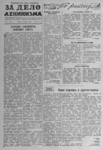 П р о л е т а р и и в с е х с тр а н , с о е д и н я йте с ь ! ЛЕНИНИЗМА О в г а н С е в е р н о г о F K К о к к у ь и ш . ш ш й ю р г и ( т ш е г е С i к 1 а и р а й о н н о г о С о в е т а д е п у т а т о в т р у д я щ и х с я Н о в о с и б и р с к о й о б л а с т и № 3G (2 3 8П) СРЕДА , 23 марта 1960 г. Цена 15 коп. ХОРОШО ЗАКОНЧИТЬ ЗИМОВКУ СКОТА М О Л О Д Ц Ы, Р Е Б Я Т А ! П р и р а й о н н о м Д о м е н у л ь - | т у р ы р а б о т а ю т н у р с ы б а я н и с т о в . С р е д и к у р с а н т о в — н о л х о з н и н и , р а б о ч и е , с л у ж а щ и е . О н и у ч а т с я с б о л ь ш о й н а с т о й ч и в о с т ь ю и и н т е р е с о м . О т л и ч н ы х у с п е х о в в у ч е б е д о б и л и с ь А н а т о л и й О с т а н и н и М и х а и л Л и п а т о в , п о к а з а в ш и е с в о и д о с т и ж е н и я п е р е д з р и т е л я м и п р и и с п о л - П р о в е р я е м в ы п о л н е н и е о б я з а т е л ь с т в Одно хорошо, а другое плохо У ч а щ и е с я Ч у в а ш и н с н о й с в - м и л е т н е й ш к о л ы , с о р е в н у я с ь с у ч е н и к а м и Н о в о - Т р о и ц к о й с е м и л е т н е й ш к о л ы , п р и с т у п и л и к в ы п о л н е н и ю в з я т ы х о б я з а т е л ь с т в . С е м и к л а с с н и к и п о д р у к о в о д с т в о м б и о л о г а М а р и и И л л а р и о н о в н ы Н у р и е в о й з н а к о м я т с я н а м е с т н о й ф е р м е с м е т о д а м и п о в ы ш е н и я п р о д у к т и в н о с т и о б щ е с т в е н н о г о ж и в о т н о в о д с т в а . О н и у ч а т с я , н а к с о д е р ж а т ь ж и в о т н ы х в ч и с т о т е , п р а в и л ь н о и э к о н о м н о р а с х о д о в а т ь к о р м а . О с о б е н н о б о л ь ш о й и н т е р е с По 18 к у б о м е т р о в за рейс В ыс о к о п р о и з в о д и т е л ь- но не сёт тр у д о в у ю л е н и н с к у ю в а х т у б р и г а д а л е с о з а г о т о в и т е л е й а р т е л и „ П а м я т ь Л е н и н а “, в о з г л а в л я е м а я Фё до ром Кыштымовым. В ы п о л н я я ежедневно нормы н а 100 и б о л е е п р о ц е н т о в , б р и г а да з а г о т о в и л а уже о к о л о 500 к у б о м е тр о в . И з э тог о к о л и ч е с т в а 400 к у б о метр о в вывез ено н а КУРСЫ БАЯНИСТОВ п р о я в л я ю т ш к о л ь н и к и к п т и ц е в о д ч е с к о й ф е р м е к о л х о з а „ Н о в а я ж и з н ь 11. О н и п о д р у к о в о д с т в о м А н н ы Д а н и л о в н ы Н в а к у ш о н о к с о б и р а ю т д л я п т и ц з о л у , в е н и к и , б у м а г у , б и т ы й к и р п и ч , н е о б х о д и м ы е д л я п о в ы ш е н и я я й ц е н о с к о с т и к у р . К р о м е э т о г о , у ч а щ и е с я п о м о г а ю т ф е р м о в с к и м р а б о т н и к а м п и л и т ь д р о в а , р а з д а в а т ь к о р м и у б и р а т ь в п о м е щ е н и и . О с о б е н н ы м т р у д о л ю б и е м о т л и ч а ю т с я А л е ш а и Ю р а Н и к о л а е в ы , Т о л я О р л о в и В и т я С у г л о б и н . Е . Чалков. у с а д ь б у к о л х о з а к м е с т а м с т р о и т е л ь с т в а п р о и з в о д с т в е н н ы х п о м е щ е ни й . Н о в ы в о з к е л е с а о т л и ч а е т с я т р а к т о р и с т И в а н А р т е м ь е в и ч Jl yui oe . Р а с с т о я н и е в 120 к и л о м е т р о в до л е с о с е к и и о б р а т но он п о к ры в а е т з а с у т к и и п р и в о з и т по 17— 18 к у б о м е т р о в л е с а . н е н и и д у э т а „ С и б и р с н а я п о д г о р н а я ^ . Х о р о ш о у ч а т с я В л а д и м и р Н а с т е р о в , Г е н н а д и й С е р г е е в , А н а т о л и й С е р г е е в и д р у г и е . Н у р с а н т ы у ж е н а ч и н а ю т п р и н и м а т ь у ч а с т и е в п р о в е д е н и и к о н ц е р т н ы х в е ч е р о в п р и р а й о н н о м Д о м е н у л ь - т у р ы . Г о т о в я т с я н п е р в о м а й с к о м у к о н ц е р т у . А . ЯКИМОВ. Перед животноводами района сейчас основная задала состоит в том, чтобы делиться полного сохранения поголовья скота, повышения продуктивности животных и всесторонне подготовиться к переводу их на пастбищное содержание. 11а осуществ