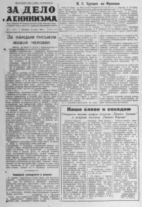 П р о л ет а р и и в с е х стран, со единяйтесь! ЗА Д Е Л О *ЛЕНИНИЗМА О р г а н С е в е р н о г о Р К К о м м у н и с т и ч е с к о й п а р т и и С о в е т с к о г о С о ю з а и р а й о н н о г о С о в е т а д е п у т а т о в т р у д я щ и х с я Н о в о с и б и р с к о й о б л а с т и № 37 (2381) | ПЯТНИЦА, 25 марта 1960 г. Ц ена 15 коп. З а каждым письмом живой человек „Жители сёл Биазы и |h Кордона неоднократно ж а ловалась в правление Би- азинского сельпо на плохое качество хлеба. Хлеб часто поступает в продажу недопеченным или кислым, а иногда и с посторонними предметами. Председатель сельпо т .Б е лов не оказывает влияния на работников хлебо- пекарни*. Т а к п и ш у т с е л ь ко р ы из села Би а зы . Р е д а к ц и я 9 марта направила запрос в райпотребсоюз с просьбой проверить факты и о рез у л ь т а т а х сообщить в редакцию. Д а в н о истёк срок, к котором у редакция просила представить ответ, но о т в е та т а к и нет. Бе зр а зл и ч н о е отношение к запросам по письмам т р у дящ их ся п р о я в л я е т с я и со стороны председателей с е л ь по тт. К апл ина и Б е л о в а , когда редакция в ы н у ж д е н а по не с к о л ь к о раз напоминать им о бы стрейшем рассмотрении ж ало б . В феврале по с ту пило к нам письмо за не скол ькими подписями из деревни Пра- во-Каёвки , в котором сообщ а ло сь о плохом медицинском о б с л у ж и в а н и и и недостойном поведении фельдшера Г . Свиридовой. Р е дакция копию письма 11 февраля направила главном у в р а ч у районной б о л ь н и цы дл я проверки. И д ё т в т о рой месяц , но т а к и о с т а ё т с я неизвестным, что у с т а новлено в р е з у л ь т а т е проверки . В правление с е л ь х о з а р те ли „ П у т ь к к о м м у н и з м у " (председатель т. К е м е л е в ) в на чале марта направлен запрос по ж ал о б е , ч т о в сёлах Би а за и Кордон в домах к о л х о з н и к о в плохой эле к тр и ч е с ки й свет . К а к и е меры приняты правлением к о л х о з а по устранению недо с та т ко в и у л у ч ш е н и ю ос вещ ени я, до сих пор ред ак ции неизвестно. А это, в свою очеред ь, создаёт во Н. С. Хрущев во Франции Утром 23 марта из М о с к вы в П а р и ж на самолёте отбыл Председатель Совета Министров С С С Р Н . С. Х р у щ е в . Он направился с государственным визитом по приглашению президента Ф р а н ц у з с к о й Р е с п у б л и к и генерала Ш а р л я де Г о л л я . Н . С. Х р у щ е в а в ого поездке с о п ро в о ж д аю т з а м е с т и т е л ь Председателя Совета М инистров С С С Р , председат е л ь Госплана С С С Р А . Н . К о сыгин, министр иностранных дел С С С Р А. А . Г р о м ы к о и др. Н а В н у к о в с к о м аэродроме, у краш енн ом го суд ар ственными флагами С С С Р , г ла ву С о в е т с ко г о пр а ви тел ьства провожали А. Б . А р и стов, Л . И. Б р е ж н е в , К . Е . Ворош и ло в , Н . Г . Игнатов, Ф . Р . К о з л о в , О . В . К у усинен, А . И . М и к о я н , Н . А . М у х и т д и н о в , М . А . С у с л о в , Е . А . Ф у р ц е в а , Н . М . Ш в е р ник, П . Н . П о сп е л о в , Д . С. К о р о т ч е н к о , Д . Ф . П о л я н ский, заместители П р ед с е дателя С о ве та М и ни с тро в С С С Р А. Ф . З а с я д ь к о и Д . Ф . У с т и н о в , министры С С С Р , д е п ута ты Верх о вно го С о ве та С С С Р , представители тр уд ящ и х с я . В м е с т е с Н . С. Х р у щ е в ы м в П а р и ж отбыли его с у п руга и другие чле ны семьи. л о к и т у с о ко н ча те л ь ны м ответом т р у д я щ и м с я . Со верш енно недопустимо безразличие со стороны р у ководителей ко л х о з о в , у ч реждений, се кретарей первичных партийных и ко м с о м о л ьских организаций на к р и ти ч е с к и е вы ст у п л ен и я г азе ты по письмам т