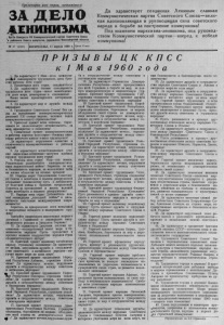 П р о л е т а р и и в с е х с т р а н , с о е д и н я й т е с ь ! ЗА Д Е Л О ЛЕНИНИЗМА Орган Северного Р К Коммунис тической партии Советского Союза ' и районного Сове та д е п у т а т о в тр удящихся Новосибирской области № 4Т (2391) В О С К Р Е С Е Н Ь Е , 17 апреля 1960 Г. Ц е н а 1 5 к о п Д а з д р а в с т в у е т с о з д а н н а я Л е н и н ы м с л а в н а я К о м м у н и с т и ч е с к а я п а р т и я С о в е т с к о г о С о ю з а — в е л и к а я в д о х н о в л я ю щ а я и р у к о в о д я щ а я с и л а с о в е т с к о г о н а р о д а в б о р ь б е з а п о с т р о е н и е к о м м у н и з м а ! П о д з н а м е н е м м а р к с и з м а - л е н и н и з м а , п о д р у к о в о д с т в о м К о м м у н и с т и ч е с к о й п а р т и и — в п е р е д , к п о б е д е к о м м у н и з м а ! П Р И З Ы В Ы Ц К К П С С к 1 М а я 1 9 6 0 г о д а 1. Д а з д р а в с т в у е т 1 М а я — день м е ж д у н а родной солидарности т р у д я щ и х с я , д е н ь бр а т ст ва рабочих всех стран! 2. Про ле тарии всех стран, со един яй тес ь ! 3. Д а з д р а в с т в у е т бо е ва я солидарность т р у д я щ и х с я всех с т р а н— з а ло г непобедимо сти дела мира, демокра тии и социализма! В ы ш е з н а м я про л етар с ко го ин тернацио нализма! 4. Д а з д р а в с т в у е т мир и д р у ж б а м е ж д у народами! 5. Т р у д я щ и е с я С о в е т с к о г о С о ю з а ! В с е си л ы на выполнение всемирно-исторических р еш ений X X I съ езда партии, вел и к и х задач к о м м у н и с т и ч е с к о г о ст р о и т е л ь с т в а ! 6. Б р а т с к и й приве т всем народам, б о р ю щ и м ся за наци онал ьн ую не за в и си м о с т ь , за мир, дем о кр а ти ю и социализм ! 7. П л а м е н н ы й привет к о м м у н и с т и ч е с к и м и рабочим партиям всех ст р а н— б о е во м у а в а н гард у р абоче го класса и всех т р у д я щ и х с я ! Д а з д р а в с т в у е т н е р уш и м о е единство и с п л о ч е н н о с т ь к о м м у н и с т и ч е с к и х и рабочих партий! 8. Д а з д р а в с т в у е т в с е п о б е ж д а ю щ е е у ч е ние марксизма-ленинизма— м о г у ч е е идейное о р у ж и е т р у д я щ и х с я всех стран! 9. Н ароды всех стран! М и р — э т о ж и з н ь . Р е ш и т е л ь н о разоблачайте им периали сти че с к и х под жи га те ле й войны ! Б о р и т е с ь за мир и бе зо пасно ст ь народов, за и с к л ю ч е н и е войн из ж и з н и общ е ства на в е ч н ы е времена! 10. Народы мира! П р е д л о ж е н и я С о в е т с к о го С о ю з а о всеобщем и полном р а з о р у ж е н и и о т к р ы в а ю т ч е л о в е ч е с т в у п у т ь к и зб авлению о т бедствий войны и бремени в о о р у ж е н и й . Б о р и т е с ь за претворение в ж и з н ь великой идеи в с е о бщ е го и полного р а з о р у ж е н и я ! 11. Н ароды всех стран! Д о б и в а й т е с ь полной ликвидации „холодной в о й н ы " и д а л ь н е йш е г о с м я г ч е н и я межд ународ ной н а п р я ж е н н о с т и ! Б о р и т е с ь за пре кращ ение всех испытаний и з апр ещ ение атомного и водородного о р у ж и я ! Т р е б у й т е с к о р е й ш е г о з а к л ю ч е н и я мирного договора с Г ер м а н и е й и ликвидации о к к у пационного р еж им а в Западном Бе р лин е ! 12. Д а з д р а в с т в у е т 'м и р о в а я си стем а с о циализм а— н е с о к р уш и м ы й опл от мира и б е зопасности народов! П у с т ь процветает и кр е п н е т в е л и к о е с о д р у ж е с т в о народов стран со ц и а л и с т и ч е с ко г о л а г е р я ! 13. Б р а т с к и й при ве т в е л и к о м у ки т ай с ко м у народу, с т р о я щ е м у социали зм ! Д а з д р а в с т в у ет в е ч н а я , н е р у ш и м а я д р у ж б а и с о т р у д н и ч е с т во с о в е т с к о г о и к и т а й с к о г о народов— мо г у ч и й оплот мира во всем мире! 14. Б р а т с к и й при ве т т р у д я щ и м с я Н арод ной Р е с п у б л и к и А л б а н и 