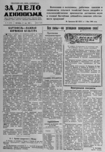 Пролетарии, всех стран, соединяйтесьI З А Д Е Л О АХ» I I О М А О р г а н С е в е р н о г о Р К К о м м у н и с т и ч е с к о й п а р т и и С о в е т с к о г о С о ю з а и р а й о н н о г о С о в е т а д е п у т а т о в т р у д я щ и х с я Н о в о с и б и р с к о й о б л а с т и № 64 (2408) ПЯТНИЦА, 27 мая 1960 г. Цен а 15 коп. Колхозники и колхозницы, работники совхозов и специалисты сельского хозяйства! Смелее внедряйте в сельскохозяйственное производство достижения науки и техники! Настойчиво добивайтесь снижения себестоимости продукции! Из Призывов ЦК КПСС к 1 Мая 1960 года К А Р Т О Ф Е Л Ь — В А Ж Н А Я КОРМОВАЯ К У Л Ь Т У Р А Ошовным условием, обеспечивающим рост производства продуктов животноводства, является укрепление кормовой базы. В а ж ным резервом увеличения производства кормов является расширение посевов и повышение урожайности картофеля. Чем больше мы сможем вырастить картофеля, тем успешнее решим мясную проблему. Труженики района взяли обязательство в этом году посадить 550 гектаров картофеля и получить урожай не меньше 120—140 центнеров с гектара. Эти задачи для нас вполне реальные. У нас есть опыт. Колхоз им. Горького, например, в прошлом году собрал по 120 центнеров с каждого гектара. Не меньше как по 115 центнеров картофеля с каждого гектара вырастил колхоз им. Калинина. Наступили благоприятные условия для посадки картофеля, температура почвы на глубине 10 сантиметров у ж е достигает 10— 11 градусов. Поэтому медлить с началом посадки картофеля ни в коем случае нельзя, надо немедленно начинать. Особое беспокойство вызывает недостаток семян в ряде колхозов. В колхозе „ П у т ь Сталина'*, например, в наличии имеется 300 центнеров семян картофеля, а требуется не менее 1000 центнеров. Мало семенного картофеля в колхозах „ З а веты Ильича**, „Память Ле- нина“ , „П ам ять Кирова1*. Н уж н ы срочные меры к изысканию в оставшиеся дни недостающего картофеля, путём закупок его у населения. Чтобы получить хороший урожай, необходимо не только вовремя произвести посадку и хорошими семенами, но и по хорошо обработанной земле при строгом соблюдение квадратно- гнездовой посадки. Это обе- сй9чит в дальнейшем правильный уход за картофелем. Необходимо коренным образом улучшить агротехнику возделывания картофеля, разместить его по хорошем землям, по глубоко вспаханной зяби, провести предпосевную к у л ь тивацию, а при необходимости и безотвальную перепашку, с таким расчётом, чтобы посадку закончить не позднее 31 мая. 'Гам, где нет картофелепосадочных машин, применять ручную квадратно-гнездовую посадку, по заранее размаркиро- ванному полю с внесением в каждое гнездо перегноя. В целях получения раннего картофеля применить яровизацию клубней или провяливание на открытых площадках. Следует отметить, что не всё ещё в колхозах подготовлено к посадке картофеля. Картофелесажалки не во всех колхозах отремонтированы, участки, отведённые под посадку картофеля, не обрабатываются, посадочный материал не подготавливается. С таким положением дальше мириться нельзя, это наносит ущерб урожаю. Необходимо правлениям колхозов принять нужные меры по устране нию недоделок. Надо учитывать и то положение, что посадка картофеля потребует много рабочей силы. Этот вопрос правлениям следует продумать и,может быть, создать специальные звенья. З в е ньевыми утвердить опытных колхозников и передать им картофельные у ч а 