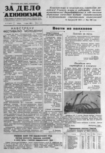 П р о л е т а р и и в с е х ст р а н , со един яйтесь ! З А Д Е Л О ! ЛЕНИНИЗМА [ О р г а н С е в е р н о г о Р К К о м м у н и с т и ч е с к о й п а р т и и С о в е т с к о г о С о ю з а ' и р а й о н н о г о ^ С о в е т а д е п у т а т о в т р у д я щ и х с я Н о в о с и б и р с к о й о б л а с т и К о м с о м о л ь ц ы и к о м с о м о л к и , с о в е т с к а я м о л о д еж ь ! Учитесь жить и р а б о т а т ь п о - к о м ~ м у н и ст и ч е с к и ! В ы р а б а т ы в а й т е в с еб е в ы с о к и е м о р а л ь н ы е к а ч е ст в а ! Б у д ь т е с о з н а т е л ь н ы м и и н е у т о м и м ы м и с т р о и т е л я м и к о м м у н и з м а ! Из Призывов Ц К КПСС к 1 М ая 1960 года № 6 9 . ( 2 4 1 3 ) С Р Е Д А , 8 ИЮНЯ 1 9 6 0 Г . Цена 15 коп. Н А В С Т ( Р Б Ч У Ф Е С Т И В А Л Ю М О Л О Д Е Ж И С я н в а р я по и ю л ь 1960 прда в р а й о н а х о б л а с т и п р о х о д и т п о д г о т о в к а к IV о б л а с т н о м у ф е с т и в а л ю м о л о д е ж и , п о с в я щ е н н о м у 9 0 - л е т и ю с о д н я р о ж д е н и я В. И . Л е н и н а . Ф е с т и в а л ь п р о х о д и т п о д д е в и з о м „ У ч и т ь с я , ж и т ь и р а б о т а т ь п о - к о м м у н и с т и ч е с к и " , ц е л ь е г о —п о в ы ш е н и е р о л и м о л о д е ж и в в ы п о л н е н ии з а д а ч с е м и л е т н е г о п л а н а . П о д г о т о в к а и п р о в е д е н и е ф е с т и в а л я д о л ж н ы с п о с о б с т в о в а т ь р а з в и т и ю ш и р о к о г о м а с с о в о г о с о р е в н о в а н и я с р е д и м о л о д е ж и з а з в а н и е б р и г а д и у д а р н и к о в к о м м у н и с т и ч е с к о г о т р у д а , з а у л у ч ш е н и е в о с п и т а т е л ь н о й и к у л ь т у р н о - м а с с о в о й р а б о т ы в к л у б а х , б и б л и о т е к а х и к р а с н ы х у г о л к а х к о л х о з о в и п р е д п р и я т и й . Ф е с т и в а л ь б у д е т п р о х о д и т ь в т р и э т а п а . П е р в ы й э т а п —д о 10 июня — ф е с т и в а л ь н ы е п р а з д н и к и в к о л х о з а х и п р е д п р и я т и я х р а й о н а . Вт о р о й э т а п — 1 8 — 19 июня —р а йо н ны й ф е с т и в а л ь , к о т о р ы й н а ч н е т с я м а с с о в ыми с п о р т и в н ы м и с о р е в н о в а н и я м и на с т а д и о н е и з а к о н ч и т с я к о н ц е р т о м х у д о ж е с т в е н н о й с а м о д е я т е л ь н о с т и к о л л е к т и в о в . Л у ч ш и е у ч а с т н ик и и к о л л е к т и в ы в ы с т у п я т в г о р о д е Н о в о с и б и р с к е н а о б л а с т н о м ф е с т и в а л е 26 и юн я . П р а в и л ь н о п о с т у п а ю т с е к р е т а р ь к о м с о м о л ь с к о й о р г а н и з а ц и и ( к о л х о з а им. М. Г о р ь к о г о Я. Д з ю б а и з а в е д у ю щ и й к л у б о м Я . П и с а р е н к о О н и п о в с е д н е в н о в е д у т п о д г о т о в к у к ф е с т и в а л ю . З д е с ь у ж е с о б р а н о б о л ь ш е д е с я т к а л у ч ш и х р а б о т п р и к л а д н о г о и и з о б р а з и т е л ь н о г о и с к у с с т в а , о р г а н и з о в а н а р а б о т а к р у ж к о в х у д о ж е с т в е н н о й с а м о д е я т е л ь н о с т и , п р о в о д я т с я и д р у г и е к у л ь т у р н о - м а с с о в ы е м е р о п р и я т и я . О р г а н и з о в а н н о п р о х о д и т п о д г о т о в к а к ф е с т и в а л ю в к о л х о з а х „ Н о в а я ж и з н ь " ( с е к р е т а р ь к о м с о м о л ь с к о й о р г а н и з а ц и и В. ' И в а н о в а , з а в е д у ю щ и й к л у б о м А . П е т р о в ) , „ П а м я т ь К и р о в а ( с е к р е т а р ь А . Г л а м а з д и н , з а в е д у ю щ и й к л у б о м С. П о н о м а р е в ) , „ П у т ь к к о м м у н и з м у " ( с е к р е т а р ь А. Л ю с т , з а в е д у ю щ а я к л ) б с м В. А н т и п ин а ) . А к т и в н о е у ч а с т и е в б л а г о у с т р о й с т в е и о з е л е н е н и и с е л а С е в е р н о г о и р а с п р о с т р а н е н и и к н и г и п р ин и м а ют к о м с о м о л ь с к и е о р г а н и з а ц и и о т д е л а к у л ь т у р ы ( с е к р е т а р ь В. Р о г о в ) , ф и н а н с о в о - б а н к о в с к и х р а б о т н и к о в ( з а м е с т и т е л ь с е к р е т а р я Н. Ка