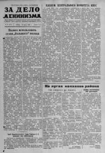 П р о л е т а р и и в с е х с т р а н , с о е д и н я й т е с ь > З А Д Е Л О ЛЕНИНИЗМА О р г а н С е в е р н о г о Р К К о м м у н и с т и ч е с к о й п а р т и и С о в е т с к о г о С о ю з а и р а й о н н о г о С о в е т а д е п у т а т о в т р у д я щ и х с я Н о в о с и б и р с к о й о б л а с т и № 87 (2431) СРЕДА, 20 ИЮЛЯ I960 Г. Цена 15 коп. Полнее использовать сезон „большого" молока ПЛЕНУМ ЦЕНТРАЛЬНОГО КОМИТЕТА КПСС .Колхозники нашего рай- Ш а взяли наг,второй год семилетки повышенные обязательства по производству и продаже государству мяса и молока. Чтобы успеш- их выполнить, необхо- но хозяйстве димо в каждом за летний пастбищный период получить не менее 1200 литров молока на к о рову, добиться е ж е с у т о ч ных привесов на нагуле крупного рогатого скота по килограмму на голову. За эти показатели сейчас и надо бороться. Животноводы многих колхозов, развернув соревнование .за досрочное выполнение своих обязательств, добились в первом полугодии хороших результатов. Так, колхозы им. М. Горького и им. Крупской перевыполнили полугодовой план продажи мяса государству, а колхозы „Борьба за мир*, „ П а м я т ь Ленина", «Заря коммунизма* им. М. Г о р ь кого — продажи молока. Колхоз „ П у т ь к к о м м у низму1 с первых дней пастбищного содержания хорошо организовал пастьбу скота. Здесь скот пасут к р у г л ы е с у т к и . В дневное время с 10 часов утра до 4 часов вечера скоту дают зеленую подкормку. Д л я подкормки доярки и пастухи выбирают кормовые травы из дикорастущего клевера, содержащего белковые вещества. Скот обеспечен в достатке водой. Э то дало возможность колхозу в первой декаде июля продать государству молока на 25 центнеров больше, чем в предыдущей декаде. Заботливые хозяева этого колхоза д у мают и о последующих днях. Сейчас, пока трава сочная, они пасут скот на естественных выпасах, а по мере стравливания пастбищ и высыхания трав, скот будет переводиться на пастбище сеяных трав. Хорошо организовгна % а с т ь б а в колхозе „Заря коммунизма". Животноводы этого хозяйства за десять дней июля дали на 32,8 литра молока на корову больше, чем за последние десять дней июня. Но мы не можем не у ч и тывать, что наш район в целом сильно отстаёт по производству продукции ж и вотноводства и особенно мяса. Те колхозы, которые плетутся в хвосте по надоям и по производству мяса, тяну т район назад. В колхозах им.Калинина, „7-й съезд Советов ", „Н о в а я жизнь*, „ П у т ь Сталина* продуктивность коров и сейчас крайне низка. Понятно, что для преодоления отставания т е перь потребуются немалые дополнительные усилия ж и вотноводов. Что сейчас необходимо для обеспечения крутого роста продуктивности жи вотных, увеличения производства мяса и молока? Прежде всего упорядочить пастбищное содержание ско та, соблюдая строгий распо рядок. Очень важно, чтобы дойные гурты получали белковые корма. На одних естественных травах, как бы хороши они не были, нельзя добиться желаемого результата. Следовательно надо по примеру колхоза „ П у т ь к коммунизму* давать подкормку. Помимо этого необходимо организовать всем животным и минеральную подкормку. Важное значение имеет обильное водоснабжение. К примеру, стоило только не Веселовской ферме временно нарушить регулярное поение из-за выхода из строя насоса, как сразу же коровы сбавили молоко. Все эти вопросы надо решать быстрее, чтобы не упустить благоприятное время для получения высоки