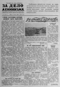 П р о л е т а р и и в с е х с т р а н , с о е д и н я й т е с ь > ЗА Д Е Л О ЛЕНИНИЗМА Орган Северного Р К К о м м у н и с т и ч е с к о й партии С о ве тско го Союза и районного С о в е т а д е п у т а т о в т р у д я щ и х с я Ново сибирской о б л а с т и Необходимо напрячЬ все усилия на п о вы шение т е м п о в з а г о т о в к и кормов. З а д а ч а т р у жеников колхозной деревни с о с т о и т в т о м , ч т о б Ы вЫ п о л н и тЬ план з а г о т о в к и кормов, с о з д а т Ь с Ы т у ю зимовку о б щ е с т в е н н о м у Жив о т н о в о д с т в у . № 96 (2440) С РЕД А , 10 а в г у с т а 1960 г. Ц е н а 15 к о п . ПЛАН ЗАГОТОВКИ КОРМОВ ДОЛЖЕН Б Ы Т Ь ВЫПОЛНЕН На редкость обильный урожай трав в этом году. Колхозы собирают с естественных сенокосов по 15— 20 центнеров сена с гектара. При таком травостое колхозы могут обеспечить себя не на один год сеном. Они имеют свыше 30 тысяч гектаров сенокосных угодий, свыше 3 тысяч гектаров сеяных однолетних трав, бо лее 3 тысяч гектаров специальных посевов на силос, большая ч а с т ь сенокосных угодий из земель государственного фонда передана колхозам. Хозяйства располагают большим количеством тракторов и конных сенокосилок, имеются первоклассные машины -пресс-подборщики „ППВ-1,6". Только в этом году колхозы пополнили свой’ машинный парк 15 сенокосилками, 63 конными граблями, в их распоряжении 20 силосоуборочных комбайнов. Отпала острая нужда в сеноуборочной техники. Свыше 300 человек прислали шефы промышленных предприятий Новосибирска для участия в заготовке кормов. Большую помощь оказывают предприятия и учреждения района в этом большом и благородном деле. Вот надёжная гарантия выполнения плана накопления грубых и сочных кормов. Хороших результатов по заготовке кормов добились колхозники сельхозартели им. Калинина. Значительно лучше, чем в прошлом году работают на сенокосе в колхозе „Память Кирова". Здесь в каждой бригаде открыты детские я с л и , организован ночлег колхозников в полевых вагончиках на лугах. В Забоевской бригаде (заведующий производственным участком Н . У зки х ) хорошо используются механизмы. Машинисты конных сенокосилок И . Кутепов и А. Теренин ежедневно перевыполняют дневные нормы, хорошо трудится тракторный агрегат Николая Наль с машинистами Зыряновым, Кутеповым. Ковязиным У с п е ш т ведут скирдовку сена колхозники И, В. Ж ел езн як и Ф. Вассер. Значительно у с коряет работу по сбору сена приспособленная в бригаде волокуша, которая сволакивает в копны сено из валков, собранных конными граблями. Не случай но эта бригада завоевала первенство среди бригад колхоза. В колхозе „Заря коммунизма" в работе по заготовке сена активное участие принимают престарелые колхозники. Однако план заготовки сена и силоса в целом по колхозам района выполнен не многим более 20 процентов, на условную голову приходится всего только 6 центнеров сена и 3 тонны силоса на корову. Крайне плохо ведут заготовку кормов колхозы им. М. Г о р ь кого, „Новая ж и з н ь " , „ Б о р ь ба за мир", мало заготовлено сена в колхозе „ П у т ь Сталина". В ряде колхозов ещё слишком живучи мокрые настроения, мешающие выполнению плана заготовки кормов, плохо организован труд колхозников и горожан, поздний выход на работу, плохо используются механизмы — сенокосилки, грабли, силосные комбайны. В колхозе „7 й съезд Советов" при наличии четырёх тракторных и шести конных сенокосилок все работы по заготовке кормов веду