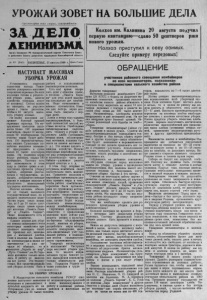 УРОЖАЙ ЗОВЕТ НА БОЛЬШИЕ ДЕЛА П ролет арии всех стран, соеоиняйтесь> З А Д Е Л О ЛЕНИНИЗМА Орган Северного РК Коммунистической партии Советского Союза и районного Совета д е п у т а т о в тр удящ и хся Новосибирской области № 1 0 1 (2445) ^ВОСКРЕСЕНЬЕ, 21 а в г у с т а 1960 г. Цена 15 коп. Н А С Т У П А Е Т МАССОВАЯ У Б О Р К А У Р О Ж А Я Установилась хо рош а я солнечная п о г о д а . П о в с е местн о у с к о р и л о с ь м а с со в о е с о зр е в а н и е з е р н о в ы х .В о всех к о л х о з а х готова к р а з д е л ь ной у б о р к е рож ь , многие х о зяй с тв а у с п е ш н а в ед у т е ё к о со в и ц у . Сейчас важно не о п о зд а т ь , не упустить время с таким расчетом , чтобы к 22 августа з а к о н чить у б о р к у озимых. На полях к о л х о з о в д о з р е в а е т богатый у р о ж а й зер н о вы х культур. На в о о р у ж е н и и к о л х о з о в н а х о дятся б о л е е 122 зерновы х комбайнов, свыше 50 жаток, о к о л о 90 п о д б о рщ и к о в . На очистке зерна б у д у т р а б о тать 120 з е р н о о ч и с т и т е л ь ных машин. С уш ил ьн о е х о зяйство к о л х о з о в п о зв о л я ет просушивать в сутки о к о л о 10 тысяч цен тн еров зе р н а . На п о д в о з к е зерна б у д у т работать свыше 100 автомашин. П о э т о м у есть в се в о зм ож н о с т и в этом г о д у в сж аты е сроки и кач е ств ен но провести у б о р к у х л е б о в , д о с р о ч н о р а с сч и таться с го с у д а р с т в о м , з а сыпать д о б р о к а ч е с т в ен н ы е сем ен а в кажд ом к о л х о з е и о б е сп е ч и т ь полноценный т р у д о д е н ь к о л х о з н и к о в . М ноги е к о лхо зы о б е щ а ют не только выполнить государственный план, но и продать зн ачи тельн ое колич е ст в о зе р н а с вер х плана. Так, от 5 д о 10 тысяч центн ер о в с в е р х плана п р о д а д у т к о лхо зы „Память Л е н и на" и „Память Кирова". Такие в о зм ож н о с т и есть в каж д ом х о зя й с т в е . Однако первые дн и у б о р ки озимых показывают,что в н ек оторы х х о з я й с т в а х прод о л ж а ю т повторять ош и б ки прошлых л е т , зап а з ды вая с к осови ц ей х л е б о в . Если в к о л х о з е им. Калинина к осов и ц а ржи в валки з а канчивается и у ж е н а чался е ё о б м о л о т , то в 11>колхозах „Борьба за мир", „Путь С тали н а" ,им .М .Г ор ь к о го косовица только началась. В р а б о т у не включе ны все жатки. Это н е д о п у стимо. Все средства р а з д е л ь ной у б о р к и должны быть в р а б о т е и использовать ся вы сокопроизводительно. Есть е щ ё время поправить д е л о с о б к о сом п олос , в к о л х о з е „Память Кирова" для этих целей вы д еле ны спец и альн о два к ом б а й на. Н а д о использовать и конные сен ок оси лки . Каналы для п отер ь зе р н а д о л жны быть закрыты с п е р вых дн е й . Х ле ба в э т ом у г о д у удались в ы с о к о у р ож а й ны е , с б о л ь шой соломистой м ассой , м е стами поле гли . Н е о б х о д и м о з а б л а г о в р е м е н н о п о д г о т о вить т е х н и к у к у б о р к е п о л е г л о г о х л е б а (установить вторые н ожи , э к сц ен три к о вые мотовила, нашивки б р е зе н т а на планки мотовила и т. д . ) . Это м ож н о с д е л а т ь в к аж д ом х о з я й с т в е . Многие п ер е д о вы е комбайнеры в н о сят ряд усоверш енствований в молотильную часть комбай н ов— удлин яют реш ёта второй очистки и т. д . В этом г о д у впервые за штурвалы комбайнов с я д е т значительная часть м о л о д ё ж и . Правления к о л х о з о в и партийные организации д о л жны принять меры к том у , чтобы работа комбайновых агр е га т о в была о р г а н и з о вана по гр у п п о в ом у м е т о д у . Это м ероп ри яти е п о зв оли т улу чш и т ь т е х н и ч е с к о е о б с л у 