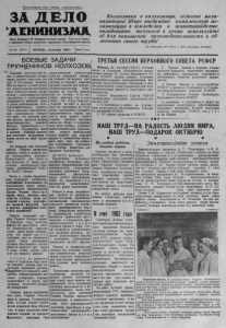П р о л е т а р и и всех ст р а н , с о е д и н я й т е с ь ! ЗА Д Е Л О 'ЛЕНИНИЗМА. Орган С е в ер н о го РК К о м м у н и с т и ч е с к о й п а р т и и С с в е т с п г о Союза и р а йо н н о го С о в е т а д е п у т а т о в т р у д я щ и х с я Ново сибирской о бл а с ти № 130 (2474) i ПЯТНИЦА, 28 октября 1960 г. |цена15коп. К о л х о зн и к и и к о л х о зн и ц ы , Сельские м е х а ни зат оры ! Шире внедряйте к о м п л е к сн ую м е хани зацию в земледелии и ж ивотноводстве, овладевайте техникой и лучше и спол ь зуйт е её д л я повышения производительности и о б легчения своего труда! (Из Призывов ЦК КПСС к 43-й годовщине Октября) БОЕВЫЕ ЗАДАЧИ Т Р У Ж Е Н И К О В К О Л Х О З О В ** Каждый достигнутый успех в строительстве коммунизма р а д у е т советских лю дей. И это вполне понятно. Ибо он вместе с собой прино сит новый подъем материаль ного благосостояния т р у д я щихся - -у в е л и ч и в аю т с я д ох о ды рабочих и колхозников, сокращается рабочий день. О росте производства с е л ь скохозяйственных п р о д у к тов и подъеме благосостояния к олхозников говорит гот ф акт, что колхозы района д а л е к о двинули вперед животноводство, намного больше прошлогодн е г о продают государству мяса и молока. Каждый к о л х о з ник получает килограмм и более хлеба на свой т р у д о день. Но впереди ещё большая работа. Многое предстоит сделать , чтобы в полной м е ре использовать резервы. Возможности для этого у нас большие. В своих пламенных о к тя бр ь ск и х Призывах Центральный Комитет КПСС говорит: Честь и с л а в а т р у ж е н и к а м с е л ь с к о г о х о з я й с т в а , н а с т о й ч и в о б о рю щ и м с я з а вы п о л н е н и е своих с о ц и а д и е т и ч е с к и х о б я з а т е л ь с т в ! Д адим Р о д и н е б о л ь ш е з е р н а , м я с а , м о л о к а , я и ц , ш е р с т и , х л б п к а , л ь н а , с а х а р н о й с в е к л ы , к а р т о ф е л я , о в о щ е й , ф р у к т о в , чая и д р у г и х п р о д у к т о в с е л ь с к о г о х о з я й с т в а ! Партия призывает н а е д а ть Родине больше зерна. В т ек ущ ем году колхозы района не выполнили свое го обязательства , продали очень мало зерна г о с уд а р ству. На корню тыс я ч и г е к та р о в ещ е не убранного хлеба . Т акое положение д о л ж н о обеспокоить хлеборобов-и принять все меры к том у , чтобы убр а ть у р о жай до единого колоса. Ч т о б ы не допустить этого в будущем году н у ж но созда ть основу для по л у ч е н и я . высокого у р о ж а я , ^ подработать и засыпать д о б ротные с емена,накопить местные удобрения, хорошо подготовить к весне всю техн и к у , встретить у б о р к у во вс еоружи и. Р о д н а я партия призывает на с—д а ть Родине больше мяса и молока. Р еш аю щ ую роль в этом иг р а е т у к р е п ление кормовой ба зы .М ежд у тем , в ряд е к о л х о з о в н а к о плению кормов не придают Д о л ж н о г о значения. При ТРЕТЬЯ СЕССИЯ ВЕРХОВНОГО СОВЕТА РСФСР недостаточном количестве сена не скирдуют солому, не создают на период р а с путицы и сильных морозов запасов кормов при фермах. Ж ивотноводческие помещения на многих фермах ещ е не готовы. И не сл у чайно поэтому, что в к о л хозах в7-й с ъ е з д С о в е т о в14, „Борьба за мир4 и других скот не переведен на стойловое содержание, голодает, продуктивность к о р о в изо дня в д е н ь падает. Н е о б ходимо принять срочные меры по сбору и с к и р д о в а нию всей соломы, утеплить животноводческие пом ещ е ния, создать наибольший запас кормов при каждой ф ерме и немедленно поставить весь скот на стойловое содерж ание . Организо вать откорм живот