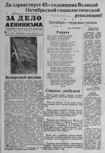 Да зд р а в с т в у е т 4 3 - я годовщина Великой Октябрьской социалистической революции! П р о л е т а р и и в с е х с т р а н, с о е д и н я й т е с ь : ЗА Д Е Л О ЛЕНИНИ ЗМ А Орган Северного РК Коммунистической партии Советского Союза и и й с н ю г о Сонета де пу т ат о в трудящихся Новосибирской области Октябрю— трудовые успехи □ Ашот Г А Р Н А И Е Р Ь Я Н ПОДАРОК СВЯЗИСТОВ М 134 (2 478 ) ПОНЕДЕЛЬНИК, 7 ноября 1960г.;Цена 15коп Всенародный праздник С е г о д н я великий праздник н ародо в С о в е т с к о г о С ою за , праздник в с е г о п ер е д о в о го ч е л о в е ч е с т в а . С ор ок три г о д а назад н ад нашей с т р а ной з а ж г л а с ь н е м е р к н у щая за р я с в о б о д ы и у ч а с т ь я . Творцом и организатором о к т я б р ь с к о й победы была сл а в н а я Коммунистическая партия, со зд а н н а я великим Лениным , г о т о в а я и д 'и на лю б ы е ж ер т вы в и н тер е сах народа . С г о р д о с тью обо зр евая с е г о д н я г ерои ч еский п уть, пройденный под з н а м - н е м В е л и к о г о О к тя б р я , с о в е т с к и е люди не о с та н а вл и ва ются на д о с т и гн у т о м . Они д ум аю т о н о вы х сверш ени ях и п о д в и г а х в о с л а в у Родины , во имя т о р ж е с т в а коммунизма. С о в е т ски й народ встр етил 4 3 ю г о до вщ и н у В е л и к о г о О к т я б р я в о б с т а н о в к е о г ромной политической и производс твенной а к т и в н о с ти . Прошедший г о д я в и л ся 1|одом н о в ы х в ы д а ю щ и х ся у с п е х о в нашей Родины , д а л ь н е й ш е г о сплочения с о в е т с к и х лю дей в о к р у г Ком м у ни сти че ско й партии и С о в е т с к о г о п р а ви т ел ьс тва . В е л и к о е един ен ие партии, п р а в и т ел ь с т в а и. народа с т а ло ещ ё т е с н е е , ещ ё н е зы б л е м е е . Т р у д ящ и е с я нашей страны от всей душ и одо бряют и г о р я ч о поддержи в а ю т политику Коммунис ти ч е ск о й партии. Народ счиКш г политику у партии с в о и ; ? кровным д ел ом , ибо в ней о тр аж аю т ся ж и з н е н ные интереыс трудящихся. С о ве т ски й н а р о д - с т р о и т е л ь коммунизма. В о т п о ч е му т а к широк размах соци а л и с т и ч е с к о г о сор е вно вани я з а д о с р о ч н о е выполнение заданий се м и л е т ки , я в л я ю щ и х с я крупным шагом на пути к коммунизм у. С л а в н ую п об ед у о д е р ж а ли в о втором г о д у семи л е т ки тру д ящ и е ся н аш е г о района. Д о с р о ч н о выполнили годо вой план по продаж е молока г о с у д а р с т в у члены с е л ь х о з а р т е л и , П а мять Лени» а “ , по п о д а ж е м я с а — к олхозн и ки к о л х о з а им. Кр ун саои . Д а л е к о за иределами с в о и х артелей и з вес тны имена л у чш и х х л е б о р о б о в к о л х о з о в « П а мять К и р о в а * , « П у т ь к к о м м ун и зм у * , «Заря к о м мунизма* и д р у г и х . С л а в н о потрудились в этом г о д у работники рай- промкомбината и конторы ком м ун а л ь н ы х предприятий, е ж е м е с я ч н о вы п о л н я ющие п рои зводс твен н ы е программы на 1 2 0 —170 проц ен т о в . А таки е работники Т а р т а с с к о й р е м о н т н о - т е х нич еской станции, к ак т о в . Л ь в о в и д р у г и е д а в н о р а б о таю т в с ч е т т р е т ь е г о и ч е т в е р т о г о г о д а семилетки . В о о д у ш е в л е н н ы е в е л и чием и сл а в о й Р оди ны , у в е р е н н ы е в правоте и н е победимости в е л и к о г о д е л а коммунизма, с о в е т с к и е л ю ди т о р ж е с т в е н н о о тм еч аю т с е г о д н я в сенар одный п р а з д ник. С праздником вас , д о р о ги е товарищи ! Р о д и н а Е с л и и с х о д и ш ь , и з ъ е з д и ш ь п л а н е т у, С к а ж е ш ь о т п о л н о г о с е р д ц а в с е г о : Л у ч ш е т е б я , м о я Р о д и н а, н е т у , Ч и щ е т ё бя н е н а ш ё л н 