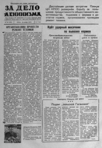 26 ноября I960 года № 140 (2484) ЗА ДЕЛО ЛЕНИНИЗМА Одобряя политику н а ш е й партии В ко лх о зе „Память Киров а ” состоялось общ ее с о б раний. С политическим д о к л а дом „Об итогах исторической поездки Н. С. Х р ущ е ва на XV сессию Ген ер ал ьной Ассамблеи ООН* выступил представитель райкома КПСС т. Толчин. В своем докладе он рассказал о значении п о ездки советской правительственной делегации, о под нятии международного а в торитета нашего гссуд эр ства, как поборника мира в борьбе за полное р а зо р у жение и ликвидацию ко ло ниального режима. Ко с н у л с я о н т а к ж е и х о з я й с т в е н н ы х дел колхоза , з а д а ч к о л х о з н и к о в . С докладом об итогах хозяйственных работ и з а дачах в связи с предстоящим Пленумом ЦК КПСС выступил председатель к о л хоза А. М. Чуркин. Он остановился на успех ах , достигнутых колхозом во втором году семилетки. Молока надоено за 10 м есяцев на ЗиО центне ров больше, чем в прошлом году. Гораздо б о л ьш е з а г о товлено нынче с ена . Лучше обстоит дело со с тр о и т ел ь ством: построено две э л е к тростанции, тракторная мастерска я . В этом году полу чено много новой техники. Вместе с тем отмечены и недостатки. Недовыполнен план сдачи государству зерна и мяса. Говорил он о том. что не всё хорошо с автопоением на фермах . Следует больше внимания уд е ля т ь вывозке кормов. Не составлен г р а фик ремонта техники. Рассказал колхозникам о предстоящих задачах в развитии общественного хозяйства. В к о лхо з е имеется около 300 коров, к концу года стадо будет увеличено до четырехсот голов з а счет нетелей. К половине б уду щего года необходимо иметь не менее полутора тысяч свиней. Намечено намного расширить посевы зерновых, особенно пшеницы. Д л я укрепления к о р мовой базы будет больше посеяно под солнечника ,кар тофеля и других куль тур . —Как бы трудно в этом году ни было,—продолжает т. Ч у р к и н ,—но наши к о л хозники выдержали все испытания и показали хоре шие образцы в работе, о с о бенно механизаторы. Не плохих результатов добились доярки, скотники. Хорошо трудились и строители В своем докладе т. Ч а р кин призвал колхозников принять обязательства к предстоящему Пленуму ЦК КПСС. Выступивший слесарь колхоза Гаврилов критиковал зав едующего ремонт ной мастерской Аксентьева за то, что мастерская для работы не готова. Локомобиль не работает, в м астер ской холодно и, если в ближ айшее время не будет налажено все необходимое, то ремонт производить нельзя. Комбайнер т. Федоров отметил, что на сессии проделана большая работа по сохранению мира во всем мире. Д ал е е он критиковал председателя к о л х о за и бригадиров за то, что во время уборки у рож а я очень часто сменялись штурвальные, в ре зуль та те производительность труда была низкой. Приходили люди совсем незнакомые с техникой. Комбайнер т. Малыхин критиковал правление за плохую вывозку кормов. Остановился т а к ж е на пл о хих условиях в ремонтной мастерской и, что до сих пор не составлен график ремонта тракторов и сельскохозяйственных машин. С е кр е тар ь парторганизации т. Д ь я ч у к самокритично подошел к вопросу подготовки мастерской.Сказал, что вместе с т. Ч у р киным упустили этот в а ж ный участок и сейчас не обходимо больше уделить этому внимания, так как к дню открытия Пленума ЦК КПСС надо полностью отремонтировать тракторы. —Я дум аю ,—сказал о н , - декабрьский Пленум мы встре