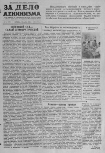 Пролетарии всех стран, соединяйтесь! З А Д Е Л О Л ЕН И Н И ЗМ А Орггн Северного РК t оюиунистичгскей г а ( л и и Советского Сошаа и районного Совета депутатов трудящихся Hcbiсибирской области Предстоящие вЫборЫ в народнЫе судЫ я в я т с я новой демонстрацией т е с н о г о сплочения трудящихся вокруг Коммунистической партии и С о в е т с к о г о п р а в и т е л ь с т в а , их реш им ости успешно вЬтолнятЬ задачи с т р о и т е л ь с т в а коммунистического о б щ е с т в а . № 141 (2485) | ПЯТНИЦА, 25 ноября 1960 г. j Цена 15 К О П СОВЕТСКИЙ СУД— САМЫЙ ДЕМОКРАТИЧЕСКИЙ Советский с у д образован рай онного народного суда, в результате Великой Ок - j В соответствии с о стать- тя бр ьс к ой с о ц и а л и с т и ч е с к о й ( ей 19 о сн ов законодатель революции на о с н о в е с л о ма царских законов и всех государственных ор га нов угнетения трудящих ся масс. Одним из первых д е к р е т о в С о в е тс к о й власти после Великого Октября был д е крет о с у д е , которым ликвидирован царский су д . Царский с у д , как все с у - jfbj капиталистических г о су д а р с т в , являлся , н а д е ж - ства о с у д о у с т р о й с т в е Сою за ССР, сою зных и автоном ных республик народные судьи районных народных с у д о в избираются гражданами района на о с н о в е в с е о б щ е г о , равного и прямого избирательного права при тайном голосовании, сроком на 5 лет. Народные заседатели районных народных с у д о в изным ср ед ств ом закабаления бирдются на общ и х со б р а - ниродных масс. В. И. Ленин ниях р абочих , сл ужащих и писал, что буржуазный с у д крестьян по месту их рабо- изображал с о б о ю защиту ты или жительства, ср оком порядка, а на самом деле , на 2 года. # был слепым, тонким о р / д и - | Подлинная народность ем б е сп ощ а д н о г о подавления с о в е т с к о г о суда и с о с т о и т эксплуатируемых, отст аи ва -|в том , что народ избирает кчцим интересы д е н е ж н о - , суд ей , св оих лу чш их пред- го мешка Именно п о э том у j ставителей избирает народ- эксплуататорский с у д б ы л !н ы м и заседателями, к о т о ненавистен трудящимся . Сила с о в е т с к о г о суда в е г о подлинной народности, в те сн ой и неразрывн о й связи с широчайшими м ассами трудящих ся . С о в е т ский с у д , о сущ е ств л яя с о циалистическое пр ав о су дие , выполняет б л а г о р о д н у ю и о т в е т с т в е н н у ю задачу по защите о т всяких п о ся га тельств, у становленное С о в етск ой Конституцией о б щ ественн ое и го с у д а р с т в е н ное у с т р о й с т в о , социалистич е с к у ю с о б ст в е н н о ст ь , п о литические, тр у д о вы е и д р у г и е личные и им ущ е ственные права и интересы граждан, гарантированные советским законом . Основная отличительная черта с о в е т с к о г о суда от б у рж у а зн ы х с у д о в с о с т о и т в том , что он не т о л ьк о наказывает, но главным о б р а зом воспитывает людей в д у х е т о ч н о г о и н еук лонно го исполнения со в е т с к и х за к он ов , ч е с т н о г о о т н о ш е ния к г о су д а р с т в е нн ом у и о б щ е с т в е н н ом у д о л г у , у в а ж ение к правам, чести и д о с т о и н с т в у граждан и правилам соц и а л и сти че с к о го общ еж и тия . Правосудие в СССР о с у ществляется В е р х о в н ы м С у д ом СССР, Верховными судами сою зны х и а в т о н ом ных республик, областными, краевыми, городскими с у дами, судами автономных обла стей и национальных о к р у г о в , районными ( г о р о д скими) народными судами, а такж е военными трибуналами. Важное м е сто в с о ве т ск о й с у д е б н о й си стеме о т в е д е н о 