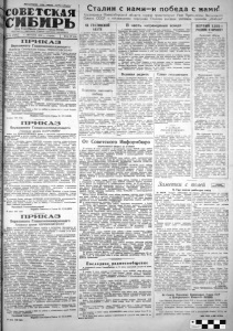 П ролет ари и всех с т р а н . соединяйтесь! ОБЕТСКАЯ ИБИРЬ Ор ган Н о в о с и б и р с к о г о о б к о м а п г о р к о м а В К Щ б ) о б л а с т н о г о и г о р о д с к о г о С ов е т ов депутатов грудящихся 5 153 (7600) [ 1 А В Г У С Т А 1944 П Р И К А З Вер ховн ого Главнокомандующ его Маршалу С о в е т с к о г о С о ю з а Р О К О С С О В С К О М У Войска 1-го Б Е Л О Р У С С К О Г О фрон-м после упорных боев штурмом овладели . « Ж р о л а х н « крупными узлами коммуникаций С Е Д Л Е Ц , М И Н С К М Л З О В Е Ц К И Й * $ ПУКОВ - мощным., опорными пунктами о б о р о ни немцев на подступах к В А РШ А В Е « 1 Г В боях за овладение городами С Е Д Л Е Ц , М И Н С К - М Л З О В Е Ц К И Й „ Л УК О В -м тдачи-шь танкисты генерал-майора Р А Д З И Е В С К О Г О , генерал-майора танковых ^ с к ЮЩу КА. геиеРал-Г и= а та„ковых войск ПО П О /Вл " генерал-майора тан- V :о*ьг* войск В Е Д Е Н ЕЕВ А , генерал-майора танковых войск Д У Б О В О Г О полковника Ч ™ Г о к С Г Ж ал й А « Г Ш К 0 ’ полковника Ж А Р О В А ’ ™“ ка Ч ШЕВЧЕНКО, Сп ^ П А Н О В А , полковника Т У Р В Н К О В А , полковника ПИ- [КДРЕВЛ, подполкоаника П И В Н Е В А , подполко.инка М А К А Р О В А ; кааалориеты ге- {МИ-лсйтснанта К Р Ю К О В А , генерал-майора Я Г О Д И Н А , генепал-майом М И Л Л Р - ОВА, генерал-майора К У Р С А К О В А ; войска генерал-лейтевавта Г У С Е В А геиеоал- вйора А Н АШ К ИН А , генерал-майора ' Ч Е Р Н О В А , полковника КАЛАДЗ Е- аотиллеои- 1Ь| генерал-майора артиллерии ^ Я Р О К О Т О , полковника К О П Е Л Е В А , 'полковника НИКИТИНА, полковника М А Л Я В С К О Г О , подполковника М У Х А Ч Е В А , подполков- риа ЩЕРБ ЕНЮКА , подполковника Ш А Д Р У Х И Н А , майора С У Ш М А Р Ч ЕН К О - лётчи- ю генерал-лейтенанта авиации П О Л Ы Н И Н А , генерал-майора авиации К Р У П С К О Г О Г г Ь ™ С Щ Щ Е В А , подполковлика Г А В Р И Л Ь Ч ЕНК О , майора У Х А Н Е В А ; саперы полковника К О М А Р О В А половника Л ЕВ И НА , капитана Д О Г А Е В А ; связисты полковника И ГН А Т ЬЕ ВА .’ полдника БЕЛЕН КО , майора Л Е С Н И К О В А , майора Ц И Б У Л Ь К О . В ознаменование одержанной победы соединения и части, наиболее отличившиеся в боях за овладение городами С Е Д Л Е Ц , М И Н С К М Л З О В Е Ц К И Й и Л У К О В медставлть к присвоению каймеиований « С Е Д Л ’Б Ц К И Х » и к награждению орденами! Сегодня, 31 июля, в 22 час а столица нашей Родины М О С К В А от имени Родикы „„.огует1 доблестным войскам 1-го Белору сск ого фронта, овладевшим городами СЕД- /1ЕЦ. « Й Я С К М А З О В Е Ц К И Й и Л У К О В , — двадцать*) артиллерийскими залпами Нз двухсот двадцати четырех орудий. За отличные боевые действия О Б ’Я В Л Я Ю Б Л А Г О Д А Р Н О С Т Ь руководимым 1аии войскам, участвовавшим В бо ях За освобождение городов С Е Д Л Е Ц , М И Н С К ДДЗОВЕЦКИЙ и Л У К О В . Вечная слава героям, павшим в бо ях за свободу и независимость пашей Родины! Смерть немецким захватчикам! Верховный Гла внокомандующий М а р ш а л С о в е т с к о г о С о ю з а И . С Т А Л И Н : ■31 июля 1944 года. П Р И К А З В е р х о в н о г о Главн ок ом андующ его Генералу армии Б А Г Р А М Я Н У Войска 1-го П Р И Б А Л Т И Й С К О Г О фронта в результате стремительного маневра танковых соединений и пехоты сегодня, 31 июля, с боями) овладели городом ИЕЛГА- ВА (МИТАВА ) — основным узлом коммуникаций, связывающим Прибалтику с В о сточной Пруссией. В боях за овладение городом И Е Л Г А В А отличились танкисты генерал-лейтеиан- \п танковых войск О Б У Х О В А , генерал-майора танковых войск Б Е Л О Г О , ттолковни- ^ (а КРЕМЕРА, подполковника С Т А Р О Д У Б Ц Е В А , 