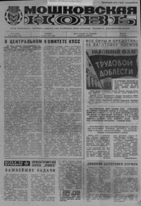 проспект, 24. Областная библиотека. Пролетарии всех стран, соединяйтесь! ОРГАН МОШКОВСКОГО РАЙОННОГО КОМИТЕТА КПСС И РАЙОННОГО СОВЕТА ДЕПУТАТОВ ТРУДЯЩИХСЯ НОВОСИБИРСКОЙ ОБЛАСТИ мошковокпя № 88 (3806) ЧЕТВЕРГ, Газета выходит по вторникам, Ц Е Н А Год издания 46-й. 21 июля 1977 года. четвергам, субботам. 2 КО П. В ЦЕНТРАЛЬНОМ КОМИ Т Е Т Е КПСС ЦК КПСС ПРИНЯЛ ПОСТАНОВЛЕНИЕ «ОБ ОПЫТЕ РАБОТЫ ИПАТОВСКОЙ РАЙОННОЙ ПАРТИЙНОЙ ОРГАНИЗАЦИИ СТАВРОПОЛЬСКОГО КРАЯ НА УБОРКЕ УРОЖАЯ 1977 ГОДА» Генеральный секретарь ЦК КПСС тов. Л. И. Брежнев в письме к передовым механизаторам страны в 1976 году обращал внимание на то, что «в сельском хозяйстве главной предпосылкой для получения хорошего урожая и его у с пешной уборки является умение ценить рабочее время ... Собрать урожай в лучшие сроки и без потерь, провести все дру гие сельскохозяйственные работы с высоким качеством — это важная народнохозяйственная задача, она треб уе т большой организаторской и политической работы». В постановлении отмечается , что, руководствуясь этими советами, Ипатовская районная партийная организация проводит большую работу по обеспечению своевременной и--качественной уборки урожая в 1977 году . Включившись во Всесоюзное социалистическое соревнование за успешное выполнение планов второго года десятой пятилетки и достойную встречу 60-летия Великого Октября , труженики колхозов и совхозов района вырастили хороший урожай и обязались продать государству 200 тыс. тонн зерна при плане 120 тыс. тонн. Придавая первостепенное значение в борьбе за выполнение принятых обязательств организованному проведению уборочных работ и недопущению потерь зерна, в районе при широком участии специалистов, колхозного и совхозного актива, на основе глубокрго изучения передового опыта и анализа недостатков , имевших место в прошлые годы , разработан комплексный план уборки урожая . Им предусматривается широкое применение раздельного способа уборки , скашивание всех хлебов в валки за четыре рабочих дня , подбор и обмолот за 8— 9 дней. На службу быстрому и высококачественному проведению уборочных работ поставлены все резервы . Новым в организации уборки текущ его года явилось широкое применение на полях всех хозяйств прогрессивной технологии, разработанной Всероссийским научно - исследовательским институтом механизации и электрификацйтг сельского хозяйства (г . Зерноград Ростовской области). В районе созданы 54 уборочно-транспортных отряда , в состав которых включено по 16— 20 комбайнов, 20— 25 автомобилей и необходимое количество тракторов и сельскохозяйственных машин. Работающие в каждом колхозе и совхозе 3— 4 отряда в комплексе и на поточной основе проводят весь цикл технологических операций, по уборке и перевозке урожая , очистке полей от соломы и лущению стерни. Такая концентрация техники создала условия для четкого и конкретного руководства уборочным процессом , оперативного контроля за технологией -и качеством работ, широкого маневрирования всеми техническими средствами в зависимости от складывающейся обстановки. Включение в состав отрядов специализированных звеньев по техническому обслуживанию, оснащенных передвижными ремонтными мастер скими, сварочными агрегатами , автозаправщиками и необходимым комплектом запасных частей, позволяет быстро устранять возникающие неисправности непоср