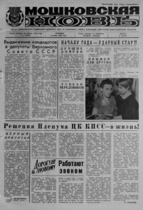 Пролетарии всех стран, соединяйтесь! ОРГАН МОШКОВСКОГО РАЙОННОГО КОМИТЕТА КПСС и районного совета на родны х депутатов новосибирской области Газета основана 23 августа 19 31 года ВТОРНИК, Газета выходит по вторникам, № 2 (4812) 3 января 1984 года. четвергам, субботам. НАЧАЛУ ГОДА — УДАРНЫЙ СТАРТ! Выдвижение кандидатов в депутаты Верховного С о в е т а С С С Р В обстановке большого политического и трудового подъема готовится наша страна к выборам в Верховный Совет СССР одиннадцатого созыва. Нынешняя избиратель н а я кампания проходит на ответственном этапе борьбы за претворение в жизнь решений XXVI. съезда КПСС, заданий пятилетки, в условиях, когда Коммунистическая партия и Советское государство совместно с братскими странами социализма прилагают титанические усилия для того, чтобы сохранить мир на Земле, предотвратить ядерную катастрофу. Эта кампания проходит в обстановке высокой трудовой и Политической активности, вызванной решениями декабрьского (1983 г.) Пленума ЦК КПСС, выступлением товарища Ю. В. Андропова, документами, принятыми на завершившейся сессии Верховного Совета СССР. На проходящих собраниях их участники заявляют о единодушной поддержке курса партии, направленного на дальнейший подъем социалистической экономики, повышение благосостояния народа, на обеспечение всеобщего мира, говорят о решимости ■советских людей успешно выполнить и перевыполнить задания 1984 года, взять рубежи пятилетки в целом. Совету ские люди рассматривают выполнение Государственно г о плана как свой патриотический долг. Самых достойных, наиболее авторитетных и уважаемых представителей рабочего класса, колхозного крестьянства и народной интеллигенции выдвигают в высший орган государственной власти трудовые коллективы. Они в числе первых кандидатов в депутаты Верховного Совета СССР единодушно называют руководителей Коммунистическ о й партии и Советского государства. На собраниях кандидатами в депутаты Верховного Совета СССР выдвинуты товарищи Ю. В. Андропов, Г. А. Алиев, В. И. Воротников, М. С. Горбачев, В. В. Гришин, А. А. Громыко, Д. А. Кунаев, Г. В. Романов, М. С. Соломенцев, Н. А. Тихонов, Д. Ф. Устинов, К. У. Черненко, В. В. Щер- бицкий, П. Н. Демичев, В. И. Долгих, В. В. Кузнецов, Б. Н. Пономарев, В. М. Чебриков, Э. А. Шеварднадзе, М. В. Зи- мянин, И. В. Капитонов, Е. К. Лигачев, К. В. Русаков, Н. И. Рыжков. Повсеместно избраны представители на окружные предвыборные совещания, которым поручено поддержать кандидатуры, выдвинутые на собраниях трудящихся. (ТАСС). Л У Ч Ш И Е Д О Я Р К И На полмесяца раньше встретили Новый год елтышевские животноводы, выполнив годовое задание по молоку и отгрузив на молокоприемные пункты 12102 центнера этой продукции. Дополнительно до конца года было продано более 470 центнеров молока. В индивидуальном соревновании лидируют доярки Е. Г. Мельникова, Е. С. Ткаченко и 3. И. Белаш, скотники дойного гурта А. И. Ткаченко Н. М, Орлов, А. А. Добрычев. Г. БУЯНОВ. с. Елтышево. У С П Е Х И ПЕРЕДОВИКОВ Коллектив животноводов нашего совхоза успешно завершил 1983 год. Труженики ферм досрочно выполнили план продажи молока государству. 25 декабря справились и с заданием по сдаче мяса. Наибольший вклад в достижение трудовой победы внесли животноводы третьего отделения. Высоких'показателей Добились скотник на откорме крупного рогатого скота А. Г. Белаш, телятницы В. С. Крючкова