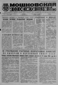 Пролетарии всех стран, соединяйтесь! ОРГАН МОШКОВСКОГО РАЙОННОГО КОМИТЕТА КПСС и районного совета народных депутатов новосибирской области Газета основана 23 августа 1931 года № 7 (4817) СУББОТА, 14 января 1984 года. Газета выходит по вторникам, четвергам, субботам. Ц Е Н А 2 коп. Н а в с т р е ч у в ы б о р а м в В е р х о в н ы й С о в е т С С С Р РА ЗГОВО Р 0 ШКОЛЕ НАЧАЛИСЬ ОРКУЖНЫПРЕДВЫБОРНЫЕ СОВЕЩАНИЯ Избирательная кампа н и я вступила в новый важный этап — 12 января начались окружные предвыборные совещания. Представители общественных организаций, трудовых коллективов всесторонне обсуждают выдвинутые на собраниях кандидатуры в Верховный Совет СССР, принимают решение об их поддержке. Совещания носят деловой характер, являются убедительным проявлением высокой политической активности избирателей, выражают подлинность социалистического На нашей станции прошли рабочие собрания по выдвижению представителей в состав участковых избирательных комиссий по выборам в Верховный Совет СССР одиннадцатого созыва. От коллектива рабочих, инженерно-технических работников и служащих станции в состав комиссий избраны передовики производства, активные общественники: член КПСС, электромонтер электроцеха Светлана Саввовна Терещенко, кандидат в члены КПСС, техник- химик очистных сооружений Елена Николаевна Новикова, член КПСС, инженер Алекнародовластия в нашей стране. 12 января в Москве состоялось предвыборное совещание представителей трудящихся Пролетарского избирательного округа столицы по выборам в Совет Союза Верховного Совета СССР. Участники совещания единодушно поддержали предложение о выдвижении кандидатом в депутаты Совета Союза Верховного Совета СССР по Пролетарскому избирательному округу Генерального секретаря ЦК КПСС, Председа; теля Президиума Верховного Совета СССР Ю. В. Андросандр Иванович Аксенов, беспартийные: оператор очистных сооружений Александра Карповна Уродова, шофер Олег Андреевич Фатеев. От первичной организации Всесоюзного Ленинского Коммунистического Союза Молодежи в состав избирательной комиссии вошла оператор очистных сооружений Мария Петровна Клыпа. В. ЧУПИН, секретарь партийной организации наливной станции CoKjfp. * * * Полным ходом идет составление списков избирателей в пова. Они обратились к товарищу Ю. В. Андропову с просьбой дать согласие баллотироваться в депутаты Совета Союза Верховного Совета СССР по Пролетарскому избирательному округу города Москвы. На окружных предвыборных совещаниях поддержаны предложения коллективов трудящихся о выдвижении кандидатами в депутаты Верховного Совета СССР других руководителей Коммунистической партии и Советского государства. На совещаниях приняты обращения к избирателям. (ТАСС). Станционно - Ояшинском поселковом Совете. Эту работу здесь проводят агитаторы с предприятий поселка. Одними из первых составили списки по своим участкам агитаторы маслозавода и ССПТУ-8 Л. Мигель и О. Беспалова. На территории Совета созданы агитпункты. На Ояшинском ремонтно-механическом заводе им руководит заведующая библиотекой Г. И. Королева, В ССПТУ-8 — секретарь комсомольской организации С. М. Самыгин, в поселке Радуга — заведующая библиотекой М. А. Толкачева. Н. ЛИХОТНИКОВА, секретарь Станционно-Оя- шинского поселкового Совета народных депутатов. Во всех школах района прошло обсужден