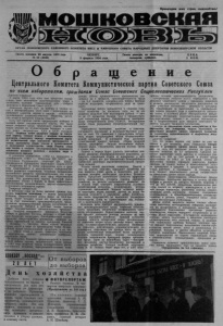 Пролетарий всех стран, соединяйтесь! ОРГАН МОШКОВСКОГО РАЙОННОГО КОМИТЕТА КПСС и районного совета народных депутатов новосибирской области Газета основана 2 3 августа 1931 года ЧЕТВЕРГ, Газета выходит по вторникам, № 18 (4828 ) 9 февраля 1984 года. четвергам, субботам. О б р а щ е н и е Центрального Комитета Коммунистической партии Советского Союза яо всем избирателям, гражданам Союза Советских Социалистических Республик Дорогие товарищи! 4 марта 1984 года всем нам предстоит осуществить свое важнейшее конституционное право и выполнить высокий гражданский долг — избрать депутатов в Верховный Совет СССР. ленинская партия идет на выборы в тесном союзе с беспартийными. Этот союз — воплощение нерушимого единства партии и народа, монолитной сплоченности (социалистического общества, источник мощи и прогресса Страны Советов. Пять лет прошло после предыдущих выборов в высший орган государственной власти. Это было время упорного труда, творческого поиска, настойчивых усилий по осуществлению больших и сложных задач, выдвинутых XXV и XXVI съездами КПСС. Подводя итоги развития страны за минувший период, сегодня можно с полным основанием доложить советскому народу: выработанный партией политический курс неуклонно претворяется в жизнь, достигнуты новые успехи в хозяйственном и культурном строительстве, наша Родина стала еще богаче и сильнее. Последовательно проводится ленинская внешняя политика — политика мира и безопасности народов. В решениях ноябрьского (1982 г.), июньского и декабрьского (1983 г.) Пленумов ЦК КПСС выступлениях Генерального секретаря ЦК КПСС, Председателя Президиума Верховного Совета СССР т. Андропова Ю. В. четко определены пути и средства планомерного и всестороннего совершенствования развитого социализма, основные направления дальнейшего развития производительных сил и производственных отношений, всех сфер общественной жизни. Под руководством партии советский народ наращивает усилия в борьбе за более эффективное использование экономического, научно-технического и духовного потенциала страны. Товарищи избиратели! В истекшие годы на более высокий уровень поднялась советская экономика — основа могущества Отчизны. Национальный доход вырос на 18,6 процента, более четырех пятых его прироста получено за счет повышения производительности труда. Основные производственные фонды увеличились на 39^ процентов. Введено в действие свыше тысячи новых государственных промышленных предприятий. Успешно осваиваются природные богатства Сибири и Дальнего Востока, вступает в строй Байкало-Амурская магистраль. Последовательно осуществляется Энергетическая программа, досрочно построен крупнейший на планете газопровод Уренгой Помары — Ужгород. Наша страна занимает первое место в мире по производству более 30 важнейших видов промышленной продукции, в их числе нефть, сталь и прокат, тракторы, тепловозы и электровозы, цемент, минеральные удобрения шерстяные ткани. В результате большой организаторской и полити- ческой работы партии, напряженного труда народа в 1983 году возросли темпы экономического роста, улучшились основные народнохозяйственные показатели. Объем промышленного производства увеличился на 4 процента, производительность труда — на 3,5 процента. Продвинулись вперед базовые отрасли индустрии, поправляются дела на тран
