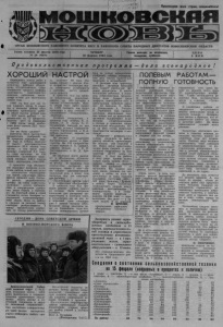 Пролетарии всех стран, соединяйтесь! мошковскпя ОРГАН МОШКОВСКОГО РАЙОННОГО КОМИТЕТА КПСС и р а й о н н о го с о в е т а н а р о д н ы х д е п у т а т о в н о в о с и б и р с к о й о б л а с т и Газета основана 23 августа 1931 года № 24 (4834) ЧЕТВЕРГ, 23 февраля 1984 года. Газета выходит по вторникам, четвергам, субботам. Ц Е Н А 2 КОП. П р о д о в о л ь с т в е н н а я п р о г р а м м а ХОРОШИЙ НАСТРОЙ Наращивает темпы работ в четвертом году одиннадцатой пятилетки районное объединение «Сельхозхимия». Самоотверженно трудятся шоферы, трактористы, инженерно-технические работники, закладывая основу для выполнения планов года. 1983 год был для нас годом ударного труда. В совхозах и колхозах района объединением произведено работ на 242,6 тысячи рублей, план — 216 тысяч рублей — перевыполнен на 12 процентов. Заметен рост по сравнению с 1982 годом, когда необходимо было освоить 222 тысячи рублей. Что же было сделано? Вывезено 62,4 тысячи тонн органических удобрений, на 32 процента перекрыто задание года (в 1982-м вывезено 47 тысяч); автотранспортом перевезено 50,4 тысячи тонн грузов, в том числе минеральных удобрений 8,3 тысячи, план выполнен на 126 процентов; грузооборот транспорта составил 846,3 тысячи тонно - километров (план 800). С прошлого года объединение оказывает колхозам и совхозам района новый вид услуг — комплексное окультуривание полей, или, говоря иначе, ремонт парового поля. Согласно научно разработанному проекту, на таком поле «Сельхозхимия» вносит органические и минеральные удобрения, ведет борьбу с сорняками. За короткий срок в строй становятся сотни гектаров отдохнувшей, «отремонтированной» земли. Если по району в среднем на каждый гектар ежегодно разбрасывается 3 тонны органических удобрений, то гектар ремонтного поля получает 60 тонн. Эта цифра говорит о многом. Резко возрастает плодородие земли, повышается устойчивость к сорнякам, растет урожайность культур. В прошлом году мы провели комплексные ремонтные работы на 400 гектарах в совхозе «Томиловский». Нынче объем таких работ возрос до 1100 гектаров, они будут проведены в трех совхозах — «Ояшинском», «Томиловском», «Восходе». Отлично потрудились в прошлом году шоферы В. А. Бебиев, П. П. Лапов, А. С. Шуминский. Каждый из них выполнил условия социалистического соревнования, а В. А. Бебнев выполнил задание на 186 процентов. Не отстают от водителей быстроходных машин 'и трактористы. На 142 процента выполнил задание В. А. Саварин, немного меньше — у В. Н. Листопадского и М. Д. Ерофеева. Не последнее место занимают в объединении «Сельхозхимия» вопросы строительства ж.глгя. В прошлом году хозспособом построено три квартиры, нынче к маю-—июню сдадим двухквартирный панельный дом, к концу года построим еще две квартиры для рабочих. Строительные работы идут и на территории объединения. В прошлом году был проведен ремонт кровли одного из складов, была построена площадка для разгрузки минераловозов и хопперов (хоть и потратились мы на нее, но в короткий срок площадка уже с лихвой окупила себя). Большие планы намечены нами на ближайшие годы: полностью ликвидировать ручной труд на складе минеральных удобрений, начать строительство двух терлых гаражей для тракторов и автомобилей. В решении всех производственных вопросов большую роль играет' укрепление трудовой дисциплины. В нашем коллективе работают, в основном, добросовестные, трудолюбивы