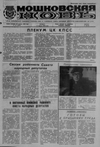 ОРГАН МОШКОВСКОГО РАЙОННОГО КОМИТЕТА КПСС и районного совета народных депутатов новосибирской об. лети Газета основана 23 августа 1931 года ЧЕТВЕРГ, Газета выходит по вторникам, ЦЕНА № 45 (4855) 12 апреля 1984 года. четвергам, субботам. 2 КОП. ПЛЕНУМ ЦК К П С С 10 апреля 1984 года состоялся очередной Пленум Центрального Комитета Коммунистической партии Советского Союза. Пленум рассмотрел и одобрил предложения Политбюро ЦК КПСС по организационным и другим вопросам, связанным с проведением первой сессии Верховного Совета СССР одиннадцатого созыва. Затем Пленум обсудил вопрос об Основных направлениях реформы общеобразовательной и профессиональной школы. С докладом по этому вопросу выступил секретарь ЦК КПСС тов. М. В. Зимянин. С большой речью на Пленуме выступил Генеральный секретарь ЦК КПСС тов. К. У. Черненко. Пленум принял постановление «О дальнейшем улучшении работы Советов народных депутатов» и «Об Основных направлениях реформы общеобразовательной и профессиональной школы». Речь тов. К.. У. Черненко и постановления Пленума публикуются в печати. В постановлении «О дальнейшем улучшении работы Советов народных депутатов» Центральный Комитет КПСС полностью одобрил выдвинутые Генеральным секретарем ЦК КПСС тов. К. У. Черненко в речи на Пленуме ЦК положения и выводы об основных направлениях дальнейшего улучшения работы Советов народных депутатов, повышения их роли в осуществлении социально-экономической политики Коммунистической партии, совершенствовании общенародной государственности и социалистической демократии. В постановлении подчеркивается, что развитие всех стсТрон деятельности Верховных и местных Советов народных депутатов, неуклонное осуществление ими ленинского принципа единства законодательства, управления и контроля, широкое привлечение миллионов трудящихся к заинтересованному управлению делами государства является важнейшей общепартийной задачей. В постановлении «Об Основных направлениях реформы общеобразовательной и профессиональной школы» ЦК КПСС отметил большое политическое, социально-экономическое и идеологическое значение реформы общеобразовательной и профессиональной школы как важной составной части планомерного, всестороннего совершенствования развитого социалистического общества. Центральный Комитет КПСС в основном одобрил «Основные направления реформы общеобразовательной и профессиональной школы», доработанные с учетом предложений и замечаний, поступивших в ходе всенародного обсуждения. Пленум ЦК КПСС постановил внести вопрос об исновных направлениях реформы общеобразовательной и профессиональной школы на рассмотрение первой сессии Верховного Совета СССР одиннадцатого созыва. д * твердую уверенность, что осуществление реформы общеобразовательной и профессиональной школы станет кровным делом всей партии и народа, будет способствовать дальнейшему улучшению обучения и коммунистического воспитания подрастающих поколений, ускорению этнического и социального прогресса нашего (ТАСС). Сессия районного Совета народных депутатов Правофланговые соревнования 10 апреля в зале заседаний Дома Советов состоялась девятая сессия районного Сове*- та народных депутатов восемнадцатого созыва. По предложению депутата Н. С. Лебедева председателем сессии был избран депутат Б. X. Шмидт, се