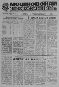 Пролетарии всех стран, соединяйтесь! ОРГАН МОШКОВСКОГО РАЙОННОГО КОМИТЕТА КПСС и р а й о н н о г о с о в е т а н а р о д н ы х д е п у т а т о в н о в о с и б и р с к о е о б л а с т и Газета основана 23 августа 1931 года ПЯТНИЦА, I Газета выходит по вторникам, средам, Ц Е Н А № 61 (4871) 18 мая 1984 года. четвергам, пятницам, субботам. 1 КОП . Весенняя вахта урот^сая-84 ДНЕВНИК ПОЛЕВЫХ РАБОТ СВЕДЕНИЯ о ходе полевых работ на 17 мая 1 графа — хозяйство, 2 —•. боронование зяби, 3 — весновспашка, 4 — яровой сев (всего), 5 — в 6 — картофеля (в процентах к том числе плану) гороха, «Ленинец» 93 — . 5 42 _ «Союз строителей» 88 81 2 ■ 50 _ «Восход» 93 24 :-- _ _ «Галинский» 96 22 2 200 _ «Зеркальный» 100 — 1 _ «Томиловский» 100 _ _ «Барлакский» 80 18 1 _ 10 «Смоленский» 85 23 3 42 9 «Большевик» 85 86 _ «Мошковский» 73 — 5 21 «Ояшинский» 79 100 6 34 «Сосновский» 64 18 _ «Белоярский» 75 . _ _ «Сокурский» 72 — 1 33 _ По району: 86 22 2 23 8 На 17 мая закрытие влаги по району проведено на 43477 гектарах. 16 мая прибавка на бороновании достигла расчетной нормы и составила 12160 гектаров. Механизаторы совхозов «Зеркальный» и «То- миловский» закончили боронование зяби и ведут закрытие влаги на паровых полях. Пар — могучий резерв урожайности полей^ Технология его обработки обязательно должна быть выдержана. Одно из важных требований — завершить подъем паров не позднее 20 мая. На 17 мая лишь в совхозе «Томилов- ский» и колхозе «Ленинец» паровые поля уже вспаханы. В первом хозяйстве эта работа была полностью выполнена еще прошлой осенью. Тогда же частично ее провели в колхозе «Ленинец» и совхозе «Сосновский». В начале апреля на заседании парткома мы рассмотрели и утвердили план организационных, массово-политических мероприятий по обеспечению своевременного и качественного проведения весеннего сева. Успешное выполнение комплекса полевых работ мы прежде всего связываем с полной готовностью к этой важной сельскохозяйственной кампании техники и людей. С 1 по 10 апреля в совхозе был проведен ударный декадник по завершению подготовки к севу. Специально созданная комиссия побывала на каждом отделении, отметила положительное, указала на отдельные недостатки, которые механизаторы устраняли в период декадника. Его итоги мы подвели 14 апреля на обще- совхозном партийном собрании с повесткой дня «О роли парторганизации совхоза в успешной подготовке к весенне- полевым работам и ее задачи по обеспечению эффективной заготовки кормов и уборки урожая». Коммунисты отметили, что декадник способствовал своевременному завершению ремонта техники, тщательному (анализу расстановки сил в полеводстве. На собрании было одобрено решение парткома о создании безнарядных звеньев с коллективной оплатой труда за конечный результат. Выполняя принятое коммунистами постаТемпы весновспашки невысоки. За 16 мая прибавка составила лишь 540 гектаров. Необходимо организовать двухсменную работу на пахоте. Температура почвы на глубине 10 сантиметров 4 —5 градусов выше нуля. Поэтому можно и нужно полным ходом вести сев гороха, трав, г.Осадку картофеля с тем, чтобы не допустить срыва оптимальных сроков сева пшеницы и других зерновых культур. В совхозах «Барлакский», «Смоленский» медленно идет посадка картофеля. При существующих темпах она затянется до 1 0— 15 июня, чего, конечно, нельзя допустить. Надо принять все меры для того, чтобы завершить посадку картофеля не позднее 5 июня. В самые сж