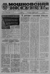Пролетарии всех стран, соединяйтесь! ОРГАН МОШКОВСКОГО РАЙОННОГО КОМИТЕТА КПСС и районного совета народных депутатов новосибирской области Газета основана 23 августа 1931 года * № 61 (4871) СУББОТА, Газета выходит по вторникам, средам, 19 мая 1984 года. четвергам, пятницам, субботам. Ц Е Н А 1 к о п . ■1АГ .1- ' V V ‘ МИНЦ тловои ты ЗА отличное качество РАБОТЫ И ВЫСОКОПРОИЗВОДИТЕЛЬНЫЙ ТРУД в ПЕРИОД ВЕСЕННЕ-ПОЛЕВОЙ КАМПАНИИ ПОДНЯТ В ЧЕСТЬ: РАУША Александра Богдановича, механизатора совхоза «Сокурский», выполняющего сменную норму выработки на прибивке влаги на 180 и более процентов. ПАНТЕЛЕЕВА Федота Петровича, тракториста совхоза «Томиловский», занятого прибивкой влаги и выполняющего дневное задание на 170 процентов. ФЕДОРОВА Вячеслава Федоровича, механизатора совхоза «Ояшинский», выполняющего сменную норму на севе гороха на 140 процентов. ВИШНЕВСКОГО Валерия Егоровича, механизатора совхоза «Ояшинский», добившегося на бороновании выполнения сменного задания на 210 процентов. ПОТАПОВА Юрия Михайловича, тракториста совхоза «Смоленский», занятого весновспашкой и выполняющего дневную норму на 180 процентов. Весенняя вахта уроусая - 8 4 ДНЕВНИК ПОЛЕВЫХ РАБОТ СВЕДЕНИЯ о ходе" полевых работ на 18 мая 1 графа — хозяйство, 2 -— боронование зяби, 3 — весновспашка, 4 яровой сев (всего), 5 — в том числе гороха, *6 картофеля, 7 — подъем пара (в процентах к плану) « И а ы ы н А т т ч ч П О а л г> ' «Ленинец» 93 «Союз строителей» 88 «Восход» 93 «Галинский» 100 «Зеркальный» 100 «Томиловский» ЮО «Барлакский» 85 «Смоленский» 100 «Большевик» 91 «Мошковский» 77 «Ояшинский» 100 «Сосновский» ■ 64 «Белоярский» 75 «Сокурский» 72 По району: 92 81 28 27 21 25 86 100 18 25 6 2 2 1 2 3 6 8 1 Р 47 57 — 200 — 100 42 30 49 33 30 — 100 13 — 11 — 2 1,5 11 17 действии — посевной комплекс По району на 18 мая влага прибита на 46 586 гектарах, что составляет 92 процента к плану. Еще в одном хозяйстве из пяти — совхозе «Смоленский» — закончили боронование зяби. Яровой сев проведен на 1687 гектарах. Полеводы колхозов «Ленинец», «Союз строителей» сеют овес. А в совхозе «Мошковский» приступили к севу ячменя. Не начали еще яровой сев в совхозах «Восход», «Сосновский», «ТоМИг ловский», где эту работу предстоит выполнить соответственно на 7439, 5119, 4427 гектарах. Наступившее похолодание и дожди сдерживают темпыполевых работ. В сложившейся ЗА ЛУЧШЕЕ ОСВЕЩЕНИЕ СОЦИАЛИСТИЧЕСКОГО СОРЕВНОВАНИЯ Секретариат облсовпрофа и правление областной организации Союза журналистов обстановке затянувшейся весны необходимо еще раз подчеркнуть важность организации двухсменной работы пахотных и сеятельных агрегатов. Все здесь должно быть хорошо продумано и отлажено. Целесообразно в ненастные дни активизировать подъем пара с учетом конкретных условий в каждом хозяйстве. Максимальное использование техники в течение всего светового дня — это сегодня главное требование для полеводов. И без выполнения его не обойтись. Капризам природы надо противопоставить высокую организованность, опыт и мастерство земледельцев. СССР рассмотрели итоги творческого конкурса на лучшее освещение социалистического соревнования в печати в 1983 году. Третье место и премия среди районных и многотиражных газет присуждены «Мош- ковской нови». в ( К нынешней посевной кампании ;мы готовились !тщательно. Заблаговременно был составлен рабочий план прове дения сева, учтены его оптимальные сроки. В связи с зат