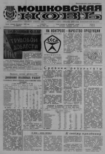 Пролетарии всех стран, соединяйтесь! кошковскпя ОРГАН МОШКОВСКОГО РАЙОННОГО КОМИТЕТА КПСС И РАЙОННОГО СОВЕТА НАРОДНЫХ ДЕПУТАТОВ НОВОСИБИРСКОЙ ОБЛАСТИ Газета основана 2SL августа 1931 года СУББОТА, Газета выходит по вторникам, средам. Ц Е Н А № 64('-р4874) 26 мая 1984 года. четвергам, пятницам, субботам 1 КОП. ШЯШШ ЗА ОТЛИЧНОЕ КАЧЕСТВО РАБОТЫ И ВЫСОКОПРОИЗВОДИТЕЛЬНЫЙ ТРУД В ПЕРИОД ВЕСЕННЕ-ПОЛЕВОЙ КАМПАНИИ ПОДНЯТ В ЧЕСТЬ: Звена картофелеводов совхоза «Барлакский», возглавляемого звеньевым НАДЕЖДИНЫМ Алексеем Александровичем. Этот коллектив, в составе которого ДИК Виктор Иванович, ТЕИЛОВ Александр Макарович, КЛЮЕВ Александр Иванович, КОНДРАТОВИЧ Петр Михайлович, выполняет на посадке картофеля сменное задание на 160 и более процентов. МИХЕЕВА Виктора Сергеевича, механизатора совхоза «Га- линский», занятого весновспашкой и перевыполняющего в два раза дневную норму. Весенняя ва хт а у р о у с а я - 8 4 ДНЕВНИК ПОЛЕВЫХ РАБОТ СООБЩАЕТ ПРЕСС-ГРУППА ПРИ РАЙКОМЕ КПСС СВЕДЕНИЯ о ходе полевых работ на 25 мая 1 графа — хозяйство, 2 — яровой сев (всего), 3 — в том числе зерновых, 4 — из них пшеницы, 5 — гороха, 6 — посадка картофеля, 7 — весновспашка, 8 — подъем паиа 57 НА КОНТРОЕЛ З Н А К К А Ч Е С Т В А КАЧЕСТВО ПРОДУКЦИИ П Р И СУЖДАЕТСЯ : коллективам животноводов совхозов «Восход», «Зеркальный», «Большевик» (директоры Е. Д. Жильцов, А. С. Тинин, Э. И. Ридель, главные зоотехники А. М. Шашлов, В. Н. Анпилогов, В. И. Бауэр). Из этих хозяйств за четыре месяца сдано молочной продукции первым сортом от общего количества соответственно 96,4, 91,6, 90,7 процента. Жирность молока выше базисной: в совхозе «Большевик» она 3,77 процента, в «Зеркальном» 3,67. Из совхоза «Зеркальный» на мясокомбинаты отправлен скот со среднесдаточным весом по 411 килограммов каждой головы, из совхоза «Большевик» - 1- по 409 килограммов. ТРЕВОЖНЫЙ СИГНАЛ О БРАКЕ АДРЕСУЕТСЯ: работникам ферм колхоза «Союз строителей», совхозов «То- миловский», «Сосновск и й». «Смоленский» (председатель правления Н. А. Авраменко, директоры Н. В. Зуев, А. В. Романов, И. П. Юзов, главные зоотехники В. А. Черникова, Г. Я. Ранюк, А. В. Станкевич, А. Ф. Федосов), откуда на маслозаводы за четыре мес,.".у,...поступило соответственна "л.шъ 49,4, 46,5, 56,9, 60,5 процента молока первым сортом от общего сданного количества: Животноводам совхозов «Со- курский», «Барлакский», «То- миловсцнй», «.Сормовский» (ди- ректор^Щ Н . ш о т £ , ч , В. В. Квашеийр, \HvgP.Y3ygB, А. В. Романов,. Т%аг-^ны\ зоотехники А. Д. ПадерчрДА .JB/ Т ихонов, Г. Я. Станкевич). Из гН*«й**ТОЗЯЙСТВ скот отправлен со среднесдаточным весом соответственно по 231, 2ЙЗ, 311, 321 килограмму каждой головы. С р а в н и м р е з у л ь т а т 9 — протравливание семян (в процентах к плану) «ьелоярскии» 25 28 5 _ _ _ «Зеркальный» 25 26 _ _ _ _ 100 «Ленинец» 18 20 1 71 _ 100 «Ояшинский» 14,5 18 84 __ 100 43 «Смоленский» 13 14 _ 100 24 45 «Мошковский» 13 14 3 39 1 «Сокурский» 13 13,2 59 __ «Барлакский» 13 11 — 160 42 81 «Большевик» 9 11 _ 37 100 «Галинский» 6 7 --- 200 !_ 41 25 «Восход» 6 7 — 17 _' 62 7 «Союз строител.» 3 5 — 100 _1• 100 12 «Томиловский» 3 4 _ 79 _ 100 «Сорновский» 0,3 0,3 8 — 62 1,5 По району: 10 11 0,6 57 30 54 27 — 100 19 4 62 Суточные надои на корову ) выше прошлогодних лишь в трех хозяйствах: колхозе «Союз строителей», совхозах «Барлакский» и «Галинский» —- соответственно на 2,5, 0,8, 0,7 килограмма. От каждой фуражной коровы по району было получено молока на 300 граммов меньше, чем в тот же день прошлого года. В совхозах «Томи- ловский», «Восход», 