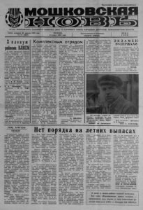 Пролетарии всех стран, соединяйтесь! ОРГАН МОШКОВСКОГО РАЙОННОГО КОМИТЕТА КПСС и районного совета на родны х депутатов, новосибирской области Газета основана 23 августа 1931 года № 71 (4881) ВТОРНИК, 12 июня 1984 года. Газета выходит по вторникам, четвергам, субботам Ц Е НА 2 КОП. Комплексным отрядом Xпленум райкома ВЛКСМ В зале заседаний райкома КПСС состоялся X пленум райкома ВЛКСМ. С докладом «О задачах районной комсомольской организации, вытекающих из решений апрельского (1984 г.) Пленума ЦК КПСС и речи на нем Генерального секретаря ЦК КПСС товарища К. У. Черненко» выступил первый секретарь райкома ВЛКСМ В. П. Кузнецов, В прениях по докладу приняли участие секретарь комсомольской организации совхоза «Восход» У. В. Попова, инспектор районо Г. А. Гущина, учительница начальных классов Мошковской средней школы В. Я. Лехнер, секретари комсомольских организаций: совхоза «Большевик» — Н. И. Вахмянина, колхоза «Ленинец» — Н. А. Нефедов. Пленум принял по обсужденному вопросу соответствующее постановление. Решено поддержать инициативу комсомольских организаций района и провести 23 июня Комсомольске - молодежный субботник в честь Дня советской молодежи, заработанные средства перечислить в фонд XII Всемирного фес ■иваля молодежи и студентов. С информацией о работе райкома ВЛКСМ между IX и X пленумами выступила секретарь райкома ВЛКСМ С. А. Симоненко. В работе пленума принял участие и выступил заведующий организационным отделом * райкома КПСС В. Е. Баженов. К весеннему севу механизаторы нашего отделения приступили в середине мая, но по-настоящему развернуть полевые работы погода позволила лишь в конце месяца. Сев зерновых культур на 2600 гектарах мы закончили 7 ию- ян, кукурузы (440 гектаров) — к 10 июня. Успешному выполи е и и ю большого объема запланированных работ способствовали своевременный и качественный ремонт техники, поднятая осенью зябь на 1896 гектарах, четкая организация труда и, конечно же, мастерство, трудолюбие наших механизаторов. Комплексный механизированный отряд, возглавляемый коммунистами А. В. Крупно (агроном отделения), Н. А. Стокозом (помощник бригадира), работал слаженно, добросовестно. Механизаторы, занятые на сея- тельных агрегатах, трудились весь световой день, на подготовке почвы — в две смены. В социалистическом соревновании на севе зерновых лидировал коллектив агрегата, возглавляемый опытным трактористом А. М. Головко (сеяльщики В. Головко, С. Киселев). На его счету 530 гектаров, засеянных овсом и пшеницей. Ш 500 гектаров и больше- засеяли коллективы агрегатов В. Н. Руденко (сеяльщики В. М. Дехнич, Б. А. Кухаренко), Б. В. Крупно (сеяльщики Г. И. Васильев, А. Т. Поддубный). Эти механизаторы в погожие дни выполняли по полторы-две нормы. Добросовестно потрудился и коллектив посевного агрегата Н. В. Недельского (сеяльщики В. Мельников, А. Найда). Бесперебойную работу на севе зерновых" обеспечивали шоферы Н. С. Харченко, И. А. Стокоз, В. Г1. Макаренко. На севе кукурузы ежедневно перевыполняли сменные задания механизаторы И. Г. Волков, В. И. Дорофеев. Своевременный подвоз семян к их агрегатам обеспечивал A. Г. Макута. В нынешнюю посевную успех дела во многом зависел и от своевременной, качественной обработки почвы. Ее подготовку к севу мы вели с минимальным разрывом, след в след. По нескольку раз приходилось проводить культивацию, боронование, лущение. И зде