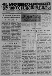 Пролетарии всех стран, соединяйтесь! ОРГАН МОШКОВСКОГО РАЙОННОГО КОМИТЕТА КПСС и р а й о н н о г о с о в е т а н а р о д н ы х д е п у т а то в н о в о с и б и р с к о й о б л а с т и Газета основана 23 августа 1931 года ВТОРНИК, Газета выходит по вторникам, Ц Е Н А № 74 (4884) 19 июня 1984 года. четвергам, субботам 2 КО П. О проведени двухмесячника по подготовке животноводческих помеще ний Для успешной подготовки животноводческих помещений, кормоцехов и культурно-бытовых объектов к проведению зимовки общественного животноводства 1984— 1985 гг. бюро РК КПСС, исполком районного Совета народных депутатов и президиум райкома профсоюза работников сельского хозяйства приняли решение провести с 10 июня по 10 августа 1984 года районный двухмесячник по строительству, капитальному и текущему ремонту животноводческих помещений, кормоцехов, объектов культурно - бытового назначения. Утверждены условия социалистического соревнования по его проведению. Руководителям колхозов, совхозов, управлению сельского хозяйства райисполкома рекомендовано принять меры к своевременной подготовке животноводческих помещений, кормоцехов и объектов культурно - бытового назначения. Под контролем исполкомов сельских Советов необходимо создать общественные комиссии по определению комплексной готовности к зимовке скота. Руководителям ПМК-1169, хозяйств, ведущих строительство хозяйственным способом, следует принять меры к своевременному вводу в действие предусмотренных планом на 1984 год производственных и культурно - бытовых объектов. Руководители колхозов и совхозов в срок до 25 июня 1984 года обязаны представить в управление сельского хозяйства - райисполкома график сроков окончания капитального и текущего ремонта всех животноводческих помещений и объектов культурно- бытового назначения. Районная ветерин а р и а я служба, зооветспециалисты до 1 августа 1984 года должны закончить санитарную обработку и дезинфекцию всех животноводческих помещений и установленного в них оборудования. Рекомендовано привл е ч ь шефствующие преприятия и коллективы района для проведения благоустройства на животноводческих фермах. Создана комиссия по определению комплексной готовности к зимовке скота, которую возглавляет председатель совета РАПО Г. И. Цаан. У С Л О В И Я СОЦИАЛИСТИЧЕСКОГО СОРЕВНОВАНИЯ ПО ПОДГОТОВКЕ ЖИВОТНОВОДЧЕСКИХ ПОМЕЩЕНИЙ к ЗИМОВКЕ СКОТА И СОЗДАНИЮ КУЛЬТУРНО-БЫТОВЫХ УСЛОВИЙ ДЛЯ РАБОТНИКОВ ФЕРМ НА ПЕРИОД ЗИМНЕСТОЙЛОВОГО СОДЕРЖАНИЯ СКОТА 1984—1985 ГГ. В связи с проведением двухмесячника по своевременной подготовке животноводческих помещений, кормоцехов, культурно - бытовых - объектов к зимовке общественного животноводства 1984— 1985 гг. бюро Мошковского райкома партии, исполком районного Совета народных; депутатов, президиум райкома профсоюза работников сельского хозяйства разработали условия социалистического соревнования. Победителями будут признаны колхозы, совхозы, обеспечившие своевременный ремонт и подготовку животноводческих помещений, кормоцехов, пунктов искусственного осеменения, культурно - бытовых объектов к предстоящей зимовке скота не позднее 1 сентября 1984 года, выполнившие планы реконструкции и ввода новых помещений, обеспечившие размещение скота на зимовку на 100 процентов. Основными критериями при определении победителей социалистического соревнования с