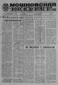 Пролетарии всех стран, соединяйтесь! ОРГАН МОШКОВСКОГО РАЙОННОГО Газета основана 23 августа 1931 года № 77 (4887) КОМИТЕТА КПСС И РАЙОННОГО СОВЕТА НАРОДНЫХ ДЕПУТАТОВ ВТОРНИК, 26 июня 1984 года. Газета выходит но вторникам, • четвергам, субботам НОВОСИБИРСКОЙ ОБЛАСТИ Ц Е Н А 2 КОП. * П о б е д и т е л и соревнования С е с с и я р а й о н н о г о н а р о д н ы х д е п Бюро РК КПСС, исполком районного Совета народных депутатов, президиум райкома профсоюза работников сельского хозяйства рассмотрели итоги социалистического соревнования коллективов хозяйств, предприятий и организаций, входящих в районное агропромышленное объединение, по производству и реализации продуктов животноводства за зимнестойловый период 1983 —1984 года. Среди партнеров агропромышленного объед и и е н и я первое место присуждено коллективу совхоза «Большевик» т (директор совхоза Э. И. Ри- *■ цель, секретарь партийного комитета В. Н. Соколов, председатель профсоюзного комитета Г. Д. Петров, председатель исполкома Сарапульско- го сельского Совета народных депутатов П. М. Лыков), оставив ему переходящее Красное знамя, присужденное по итогам социалистического соревнования за первый квартал 1984 года. Хозяйству выделен автомобиль для продажи передовикам производства. Коллектив совхоза добился наивысших результатов по выполнению народнохозяйственного плана за зимнестойловый период 1983—1984 года. План по продаже молока государству выполнен на 110 процентов. Первым сортом сдано 94 процента молочной продукции. Надой на фуражную корову— 1992 килограмма. Сохранность поголовья крупного рогатого скота составила 98,7 процента. Среднесдаточный вес одной головы крупного рогатого скота — 393 килограмма, свиней — 98,8 килограмма. Сда- Д но скота средней и высшей упитанностью 72,8 процента, свиней II категории — 113 голов. Среднесуточный привес крупного рогатого скота составил 431 грамм, свиней — 380 граммов, отъемный вес одного поросенка — 19,4 килограмма. Продано племенного молодняка свиней 2998 голов со средним весом одной головы 91 килограмм. Первое место в социалистическом соревновании среди ферм и отделений хозяйств района присуждено коллективу фермы № 2 совхоза «Мош- ковский» (управляющий И. К. Мерц, секретарь цеховой партийной организаций Е. И. Иванушкина, председатель цехового комитета профсоюза Г. А. Сафонова). Надой на фуражную корову но ферме составил 1953 килограмма, среднесуточный привес крупного рогатого скота — 560, свиней — 348 граммов, отъемный вес одного поросенка— 18,9 килограмма. Сохранность крупного рогатого скота соста- • вила 98 процентов. Коллектив фермы № 2 награжден Почетной грамотой РК КПСС и райисполкома, ему выделен мотоцикл с коляской для продажи передовикам производства. Победителями в социалистическом соревновании среди работников -животноводства за зимнестойловый период 1983 —1984 года признаны: ДОЯРКИ Букина Зинаида Ивановна — из совхоза «Мошковский», надоившая по 2556 килограммов молока на фуражную корову; Саландо Нелля Ивановна — из совхоза «Мошковский», надоившая по 2547 килограммов молока на фуражную корову; Толмачева Анна Ивановна— из совхоза «Большевик», надоившая по 2327 килограммов молока на фуражную корову; Войтенко Александра Антоновна — из совхоза «Восхбд», надоившая по 2218 килограммов молока на фуражную корову; Фатеева Эмма Ивановна — из совхоза «Большевик», надоившая п