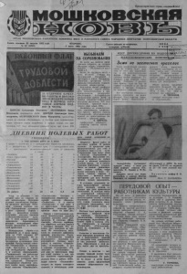 Пролетарии всех стран, соединяйтесь! ОРГАН МОШКОВСКОГО РАЙОННОГО КОМИТЕТА КПСС и р а й о н н о г о с о в е т а н а р о д н ы х д е п у т а то в н о во си би рс к ой о б л а с т и Газета основана 23 августа 1931 года № 80 (4890) ВТОРНИК, 3 июля 1984 года. Газета выходит по вторникам, четвергам,субботам Ц Е Н А 2 КОПТ НОьОСЫ , ВЫЗЫВАЕМ (НАСОРЕВНОВАНИЕ ЗА ОТЛИЧНОЕ КАЧЕСТВО РАБОТЫ И ВЫСОКОПРОИЗВОДИТЕЛЬНЫЙ ТРУД В ПЕРИОД ЗАГОТОВКИ КОРМОВ ПОДНЯТ В ЧЕСТЬ; ЦИРЕЛЯ Александра Павловича, БЕЛОНОЖКО Ивана Яковлевича, машинистов АВМ, ЦИРЕЛЯ Александра Александровича, ВЕЛИЧИНСКОГО Ивана Федоровича, гранулятор- щиков из совхоза «Большевик», в полтора раза перевыполняющих сменную .норму выработки. С начала сезона они приготовили 117 тонн витаминно-травяной 'муки при плане 400. 21 июня мы провели профсоюзное собрание, на котором обсудили задачи кормозагото- вителей, обслужив а ю щ и х АВМ-1,5. Встав на трудовую вахту в честь 40-летия Победы над гитлеровской Германией и претворяя в жизнь Продовольственную программу СССР, приняли повышенные социалистические обязательства. Коллектив нашей профгруппы обязуется строго соблюдать технологическую и производственную дисциплину, обеспечивать бесперебойную двухсменную работу АВМ, за Период кормозаготовительной кампании заготовить 500 тонн витаминно - травяной муки и гранул (при плане 400). Вызываем на социалистическое -соревнование профсоюзную группу рабочих совхоза «Ояшинский», обслуживающих агрегат по приготовлению витаминно - травяной муки. А. ЦИРЕЛЬ, профгрупорг, машинист- оператор совхоза «Большевик» . Д Н Е В Н И К П О Л Е В Ы Х Р А Б О Т С В Е Д Е Н И Я о ходе полевых работ на 2 июля 1 графа — хозяйство, 2 — междурядная обработка пропашных, 3 — химпрополка, 4 —- скошено трав, 5 —-заскирдовано сена, 6 — приготовлено витаминно-травяной муки (в процентах к плану) «Ленинец» 51 24. 3 0 0 «Союз строителей» 50 25 4 0 3 «Восход» 31 50 14 0 0 «Галинский» 33 0 19 0 4 «Зеркальный» 70 46 20 5 '■-— «Томиловский» 69 0 . 6 0 — «Сокурский» 46 0 13 5 7 «Барлакский» 64 0 ■ '7 0 8 «Смоленский» 83 33 9 0 5 «Большевик» 39 0 23 0 29 «Мошковский» 56 36 10 0 44 «Ояшинский» 106 22 12 0 25 «Сосновский» 0 0 4 0 — «Белоярский» 100 ' 0 . 15 0 — По району: 67 20 10 0,4 16 Уход за посевами — это «Смоленский». Отстают с сегодня одна из главных за- междурядной обработкой подач земледельцев. Погодные условия способствуют быстрому развитию растений. Началось кущение хлебных злаков. Одновременно ускорился и рост сорняков. Борьба с ними — важнейшее условие получения высоких урожаев сельскохозяйственных культур. С этой целью полеводы занимаются бороновани е м всходов, междурядной обработкой пропашных и химической прополкой. Междурядная обрабо т к а пропашных ко 2 июля проведена на :77|49 гектарах (67 процентов площадей). По агротехнике требуется двухтрехкратная культивация междурядий. Кукурузоводы совхозов «Ояшинский» и «Белоярский» приступили к повторной Междурядной обработке. А в совхозах «Зеркальный», «Томиловский» эта работа выполнена соответственно на 70, 69 процентах площадей, занятых кукурузой. Повторную междурядную обработку «второго хлеба» ведут картофелеводы совхозов «Барлакский», леводы совхозов «Восход», «Галинский». А в совхозе «Сосновский» к ней даже и не приступали. Повсходовое боронование силосных здесь провели лишь на один раз. Наряду с уничтожением сорняков механическим способом огромное значение имеет химпрополка. В сов