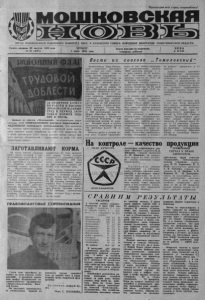 Пролетарии всех стран, соединяйтесь! ОРГАН МОШКОВСКОГО РАЙОННОГО КОМИТЕТА КПСС и р а й о н н о г о с о в е т а народных депутатов н о в о с и б и р с к о й о б л а с т и Газета основана 23 августа 1931 года ЧЕТВЕРГ, I Газета выходит по вторникам, | ЦЕНА № 81 (4891) 5 июля 1984 года. четвергам, субботам • / 2 КОП . КАЧЕСТВО РАБОТЫ И ВЫСОКОПРОИЗВОДИТЕЛЬНЫЙ В ПЕРИОД ЗАГО- И КОРМОВ п о д н я т В ЧЕСТЬ: Звеньев из совхоза «Мошковский», возглавляемых машинистами ABM СПИРИДОНОВЫМ Дмитрием Кирилловичем и АВДОНИНЫМ Александром Александровичем. Эти коллективы, занятые приготовлением витаминно-травяной муки, выполняют сменную норму выработки на 140—150 процентов. На 4 июля произведено 139,5 тонны ценного корма. Звенья приняли высокое обязательство — приготовить за сезон 750 тонн питательных гранул. ЗАГОТАВЛИВАЮТ КОРМА На полях совхоза «Барлак- ский» после посевной в предусмотренные сроки была проведена обработка посевов, а там подоспела и «зеленая жатва». Первыми приступили к заготовке кормов механизаторы, обслуживающие АВМ. Готовят витамйнно - травяную муку кормозаготовители первого^ отделения хозяйства. На КСК-100 скосил озимую рожь, а теперь убирает многолетние травы Анатолий Дмитриевич Качев. На АВМ работают старший машинист, Игорь Васильевич Коршиков, машинист Виктор Петрович Веч и оператор Сергей Васильевич Кулик. С 44 гектаров трав уже выработано 37 тонн витаминного корма. Чтобы успешно справиться с заданием, а предстоит заготовить 400 тонн этого ценного корма, звено по .приготовлению гранул работает весь световой день. На третьем отделении совхоза кормозаготовители приступили к косовице трав 25 июня. Валки были уложены за это время на 77гектарах. Но 26 гектаров скосили трактористы Ивол Томосович Денк и Сергей Геннадьевич Бородин, Виктор Гросман скосил на 25 гектарах многолетние травы, которые будут заложены на сенаж. ПРАВОФЛАНГОВЫЕ СОРЕВНОВАНИЯ Сотни тонн картофеля доставил на поля совхоза «Смоленский» в посевную кампанию шофер Мошковского автотранспортного предприятия «Транссельхозтехника» Василий Кулик. Он постоянно перевыполняет ежемесячные задания по перевозке грузов, занимает одно из первых мест в соревновании среди водителей предприятия. Н а с н и м к е : шофер В. Кулик. Фото С. КАЗАКОВА. i I 1 Ве сти из Животноводы. Верх-Балтийского отделения прилагают все усилия для того, чтобы выполнить годовой план по сдаче молока государству. Перевод дойного стада на летние выпаса позволил увеличить надои, которые растут ежедневно. Сейчас среднесуточный надой на корову на 400—500 граммов выше прошлогоднего показателя того же периода. В целом с июньским заданием животноводы отделения успешно справились, выполнив план реализации молока на 128 процентов. Среди доярок лучших результатов добились Галина Ивановна Федорова, надоившая по 366 килограммов молока, Мария Ивановна Зигаева — 364 килограмма и Валентина Алексеевна Руколеева — 348 килограммов молока от коровы. Валовой надой в группе Валентины Алексеевны достиг 101 центнера вместо 78 по плану. Неплохо начат и второй месяц лета. Планом предусмотс о в х о з а ,, То рено за этот месяц отгрузить на молокоприемные пункты 1084 центнера молока, т. е. в день сдавать по'35 центнеров. За первые три дня в среднем сдается по 35,5—36 центнеров продукции. Весомую помощь животноводам отделения оказывают и личные хозяйства. За 10 дней жители села
