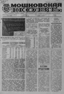 Пролетарии всех стран, соединяйтесь! мош ковскяя ОРГАН МОШКОВСКОГО РАЙОННОГО КОМИТЕТА КПСС И РАЙОННОГО СОВЕТА НАРОДНЫХ ДЕПУТАТОВ НОВОС ИБИРСКОИ ОБЛАСТИ Газета основана 23 августа 1931 года i ВТОРНИК, Газета выходит по вторникам, Ц Е Н А № 92 (4902) | 31 июля 1984 года. четвергам, субботам 2 КОП. в !й11ТКр1: .Ш С 1 ПО 10 АВГУСТА — УДАРНЫЙ ДЕКАДНИК ПО ЗАВЕРШЕНИЮ ВЫПОЛНЕНИЯ ПЛАНОВ ЗАГОТОВКИ СЕНА И МАКСИМАЛЬНОМУ НАКОПЛЕНИЮ ВИТАМИННО-ТРАВЯНОЙ МУКИ. Совместным решением со- Бет РАПО и районный штаб по заготовке кормов для общественного животноводства с 1 по 10 августа объявили ударный декадник по завершению выполнения планов заготовки сена и максимальному накоплению витаминно - травяной муки в хозяйствах района, до которых доведены задания. З А Д А Н ИЯ ЗА ОТЛИЧНОЕ КАЧЕСТВО РАБОТЫ И ВЫСОКОПРОИЗВОДИТЕЛЬНЫЙ ТРУД В ПЕРИОД ЗАГОТОВКИ КОР МОВ ПОДНЯТ В ЧЕСТЬ: «звена механизаторов из совхоза «Томиловский» (звеньевой СЫРОМЯТОВ Анатолий Федорович). Этот коллектив, занятой заготовкой сена, перевыполняет сменную норму выработки в полтора раза. На счету звена 600 тонн сена, уложенного, в скирды. ДНЕВНИК ЗАГОТОВКИ КОРМОВ С В Е Д Е Н И Я о ходе заготовки кормов на 30 июля 1 графа — хозяйства, 2 — сено факт, (т), 3 — в процентах к плану, 4—сенаж факт, (т), 5 — в процентах к плану, 6 — витаминно-травяная мука факт, (т), 7 — в процентах к плану «Зеркальный» 816 63 890 178 — «Ояшинский» 971 54 1900 210 350 58 «Барлакский» 1431 53 1906 91 164 47 «Белоярский» 150 50 — — •— — «Большевик» 439 49 2500 100 328 82 «Ленинец» 1100 44 1350 169 44 44 «Мошковский» 1200 44 1800 90 391 156 «Томиловский» 1089 42 1836 204 — — «Восход» 1267 40 2700 128 25 13 «Союз строителей» 700 35 1800 200 18 9 «Сокурский» 341 34 3218 92 149 50 «Смоленский» 681 26 2000 100 81 27 «Галинский» 690 25 2364 118 53 27 «Сосновский» 367 24 2080 80 — — По району: 11242 40 26194 115 1603 55 За 2 7—29 июля в скирды уложено по району 3000 тонн сена. В совхозах «Мошковский», «Восход», «Томиловский» за эти 3 дня прибавка составила соответственно 433 , 349, 308 тонн, в совхозе «Ояшинский», колхозе «Союз строителей» — по 2 0 0—250 тонн. В названных хозяйствах выработка на действующий стогомет равна 4 0—50 тоннам сена в день. Однако часть техники простаивает и з - з а частых поломок. Сдерживают работу дальние переезды, недостатки в организации труда, нарушения дисциплины. Все это отрицательно сказывается на общей выработке. По рабочему плану ежедневно в районе необходимо скирдовать по 1500 тонн сена. Практически же превысить рубеж в 1000 тонн пока не удается. Далека от расчетных показателей прибавка в совхозах «Сосновский», «Смоленский», «Сокурский». На 30 июля в траншеи заложено 26194 тонны сенажа или 115 процентов к плану. К семи хозяйствам, в которых ведется сверхплановая заготовка этого корма, добавились еще два— совхозы «Смоленский» и «Большевик». Неплохо потрудились звенья на закладке сенажа 27 и 28 июля в совхозах «Сокурский» и «Сосновский», достигнув в указанные дни расчетной выработки. Многие хозяйства, справившись с заданием по накоплению сенажа, снизили !емпы его закладки. Это сказывается и на общерайонных показателях. Медленно ведут закладку сенажа в совхозах «Мошковский», «Барлакский». Случаются простои техники из-за нехватки автотранспорта на отвозке зеленой массы. Заготовку сенажа нужно продолжать, особенно в тех хозяйствах, где имеются для этого нескошенные травы. Это тем более важно в условиях неустойчивой погоды. На 30 июля в районе приготовлено 1603 тонны витами
