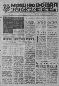 ОРГАН МОШКОВСКОГО РАЙОННОГО КОМИТЕТА КПСС и районного совета народных депутатов новосибирской области Газета основана 23 августа 1931 года № 93 , (4903) ЧЕТВЕРГ, 2 августа 1984 года. Газета выходит по вторникам, четвергам, субботам ЦЕНА 2 КОП. Пролетарии всех стран, соединяйтесь! С 1 по 10 августа — ударный декадник по завершению выполнения планов заготовки сена и максимальному накоплению витаминнотравянои муки. ОТЛИЧНОЕ КАЧЕСТВО РАБОТЫ И ВЫСОКОПРОИЗВОДИТЕЛЬНЫЙ ТРУД в I ПЕРИОД ЗАГОТОВКИ КОРМОВ ПОДНЯТ в ЧЕСТЬ: безнарядного звена механизаторов из колхоза «Ленинец» (звеньевой СЕМАШКО Владимир Тимофеевич). Этот кол лек- ) тив, занятый заготовкой сена, добился выполнения сменной ' ■ нормы выработки на 227 процентов. С ЗАДАНИЕМ СП Р А В И Л И С Ь Звено, возглавляемое коммунистом Александром Степановичем Климовым, 31 июля справилось с заданием по накоплению сена, доведенным до 2-й фермы. В скирды уложено 700 тонн. Механизаторы обязались заготовить еще 300 тонн этого корма. По-ударному трудятся члены звена: коммунист А. А. Даукш'т и А. И. Лещев на стогометах, В. Л. Кривошеев •и Г. Г. Бахман — на копно- образователях, скирдоправы М. Н. Евсеев и В. Ф. Тю- ренков. а . САУШКИН, секретарь парткома совхоза «Ояшинский». ДНЕВНИК ЗАГОТОВКИ КОРМОВ СООБЩАЕТ ПРЕСС-ГРУППА ПРИ РАЙКОМЕ КПСС С В Е Д Е Н И Я о ходе заготовки кормов на 1 августа 1 графа — хозяйства, 2 — сено. факт. (V), 3 — в процентах к плану, 4—сенаж факт, (т), 5 — в процентах к плану, 6 — витаминно-травяная мука факт, (т), 7 — в процентах к плану «Ояшинский» 1204 67.1 1900 211 376 63 «Зеркальный» 867 67 1005 201 «Белоярский» 180 60 — — _____ — «Барлакский» 1570 58 1972 94 178 . 51 «Мошковский» 1545 57 1978 99 413 165 «Большевик» 484 54 2561 102 338 . 85 «Ленинец» 1250 50 1400 175 53 | 53 «Томиловский» 1280 49 1800 211 «Союз строителей» 860 43 1900 211 18 9 «Восход» 1380 -43 2777 132 28 14 «Сокурский» 415 42 3352 96 157 к 52 «Смоленский» 834 32 2189 109 86 •29 «Сосновский» 460 31 2008 80 «Галинский» 813 29 2487 124 53 27 По району: 13142 47 27431 121 1693 58 На полях и лугах района продолжается заготовка кормов для общественного животноводства. На 1 августа заскирдовано 1 3 1 4 2 тонны сена, что составляет 47 процентов к плану. В накоплении этого основного корма для скота лидируют полеводы cobi хозов «Ояшинский», «Зеркальный». У ояшинцев дневная выработка на стогомет составляет не менее 180 процентов к сменному заданию.» Они укладывают в скирды ежедневно окрло 100 тонн сена. Механи з а т о р ы совхоза «Мошковский» скирдуют по по 1 3 0— 150 тонн сенц вдень, доводя выработку на каждый стогомет до 150 и более процентов к норме. Но не везде сегодня поле* воды трудятся с должным напряжением. По-прежнему низки темпы «зеленой жатвы» в совхозе «Смоленский». В соседних хозяйствах дожди тоже являются помехой в рабо> те, однако темпы заготовки кормов у них выше. В совхозе «Смоленский» сдерживают кормозаготовительную кампанию частые поломки техники, неорганизованность. То же самое можно сказать и о совхозе «Галинский». Медленно скирдуют сено в совхозе «Сос- иовский». В работу здесь включены лишь 2 стогомета. На каждый из них приходится не более 30 тонн заскирдованного в день сена. Полеводы района продолжают закладку сенажа. На 1 августа его заготовлено 27431 тонна. Травы нынче выросли хорошие. Урожай зеленой мае, сы намного выше планового. Потому большинство хозяйств успешно справились с заданиями по накоплению этого корма, в два с лишним раза перевыполнили планы заготовки сенажа механизат