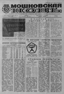 Пролетарии всех стран, соединяйтесь! МОШКОВОКАЯ ОРГАН м о ш к о в с к о г о РАЙОННОГО КОМИТЕТА КПСС И РАЙОННОГО СОВЕТА НАРОДНЫХ ДЕПУТАТОВ НОВОСИБИРСКОЙ ОБЛАСТИ Газета основана 23 августа 1931 года | ЧЕТВЕРГ, Газета выходит по вторникам, Ц Е Н А № 99 (4909) 1 16 августа 1984 года. четвергам, субботам 2 КОП. ЗА ОТЛИЧНОЕ КАЧЕСТВО РАБОТЫ И ВЫСОКОПРОИЗВОДИТЕЛЬНЫЙ ТРУД В ПЕРИОД ЗАГОТОВКИ КОРМОВ ПОДНЯТ В ЧЕСТЬ: звена механизаторов из совхоза «Смоленский» (звеньевой член КПСС МАРТЫНОВ Виктор Тихонович). Этот коллектив, занятый заготовкой сена, добился выполнения сменной нормы выработки ла 180 процентов. ДНЕВНИК ЗАГОТОВКИ КОРМОВ С В Е Д Е Н И Я о ходе заготовки кормов на 15 августа 1 графа— хозяйство, 2— сено факт.. (т), 3-— в процентах к плану, 4— сенаж факт, (т), 5-— в процентах к плану, 6-- витаминно-травяная мука факт. |1т), 7 - - в процентах к плану. «Ояшинский» 2244 125 2310 257 489 82 «Белоярский» 360 120 — — — — «Мошковский» 3051 113 2351 118 531 212 «Зеркальный» 1381 106 1005 201 — — «Большевик» 952 106 3515 141 422 105 «Ленинец» 2275 91 2000 250 116 l i t «Сокурский» 905 91 , 4011 115 196 65 «Союз строителей» 1800 90 2109 234 61 31 «Томиловский» 2250 87 2006 222 — — «Восход» 2626 82 3500 167 64 32 «Барлакский» 2150 80 2520 120 280 80 «Сосновский» 953 64 2967 119 — ___ «Галинский» 1617 58 3030 151 60 30 «Смоленский» 1468 56 3288 164 100 33 По району: 23972 86 34612 152 2319 80 В У Д А Р Н Ы Й Д Е Н Ь - О Щ У Т И М А Я П Р И Б А В К А Коротко сибирское лето, особенно нынешнее, так как обильные дожди частенько были помехой теплу и солнцу. Вот потому-то особенно дорог земледельцам , каждый погожий денек сейчас, когда лето на закате. Несмотря на непогоду, надо успеть заготовить впрок корма для общественного животноводства. Правление нашего колхоза, партийный, профсоюзный комитеты минувшее воскресенье объявило ударным днем по заготовке сена. Были разработаны специальные условия социалистического со. ревнования, до каждой комплексной бригады доведены конкретные задания. Механизаторам безнарядного полеводческого звена первой бригады (звеньевой В. Т. Семашко) предстояло заскирдовать 500 центнеров сена, третьей (звеньевой В. .А. Дорошке- вич) —600, кормозаготовите- лям второй бригады (М. Н. Федосеев)— 700 центнеров сена. Все дружно включились в работу, но успех сопутствовал тем, кто проявил большую организованность, дисциплинированность. На 130 и 133 процента соответственно справились с доведенными заданиями механизаторы второй и третьей бригад. Задавали тон в работе здесь сто- гометчи^и М. Н. Федосеев, В. Н. Шпченко. Для кормо- заготовит^лей третьей бригады этот ударный день стал и днем завершения выполнения плана по сену. А вот члены безнарядного звена первой бригады выполнили в этот день доведенное задание всего лишь на 80 процентов. Здесь не сумели взять нужный темп работы. В день ударного труда в стога было уложено 2000 центнеров сена — это ощутимая прибавка, и колхоз близок к завершению плана по .заготовке грубых кормов. Р. ПЕТРОВА, секретарь парткома колхоза «Ленинец». На контроле - качество продукции ход», «Зеркальный», «Мош- ковский», «Сосновский» (директоры Э. И. Ридель, Е. Д. ЗНАК КАЧЕСТВА ПРИСУЖДАЕТСЯ: коллективам животновод о в совхозов «Большевик», «ВосЖильцов, А. С. Тинин, В. И. Просолупов, А. В. Романов, главные зоотехники В.-И . Бауэр, А. М. Шашлов, В. Н. Анпилогов, В. М. Попов, А. В. Станкевич). Из этих хозяйств всю прошедшую неделю молоко поступало только первосортное. Примечание: колхозы «Ленинец», «Союз строителей», совхо